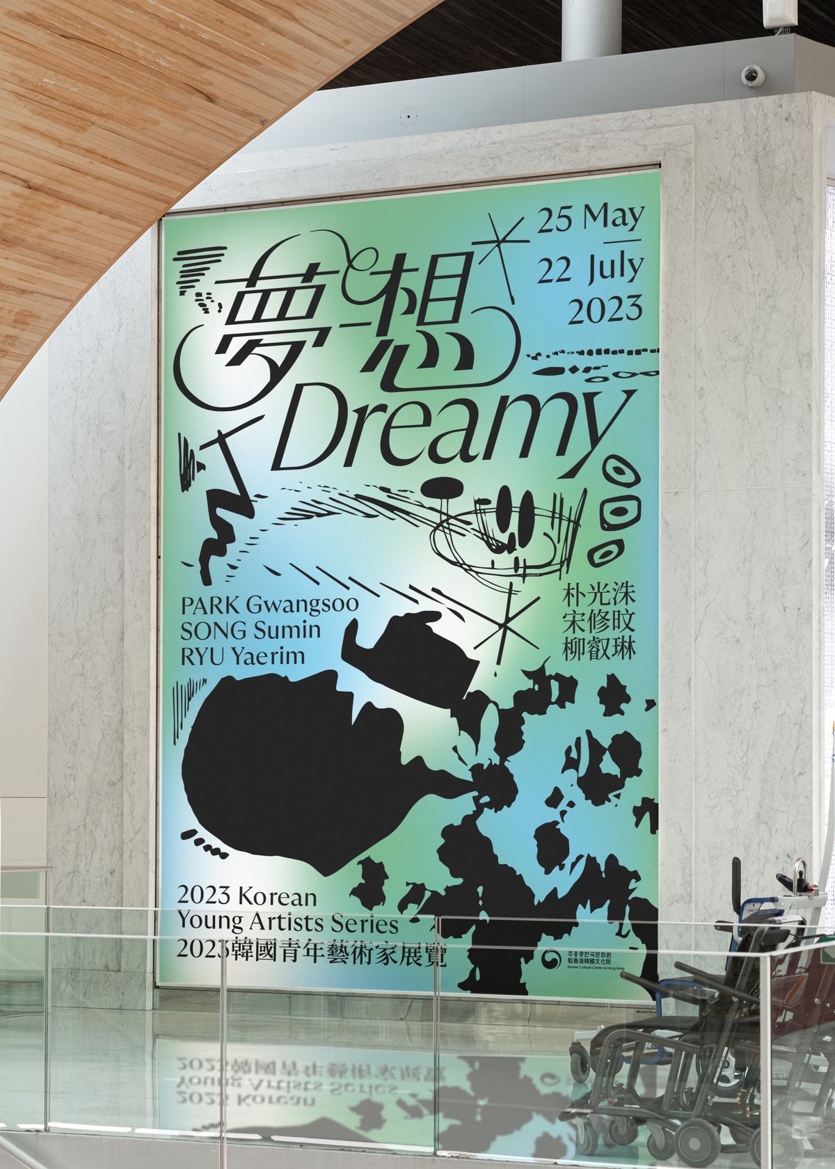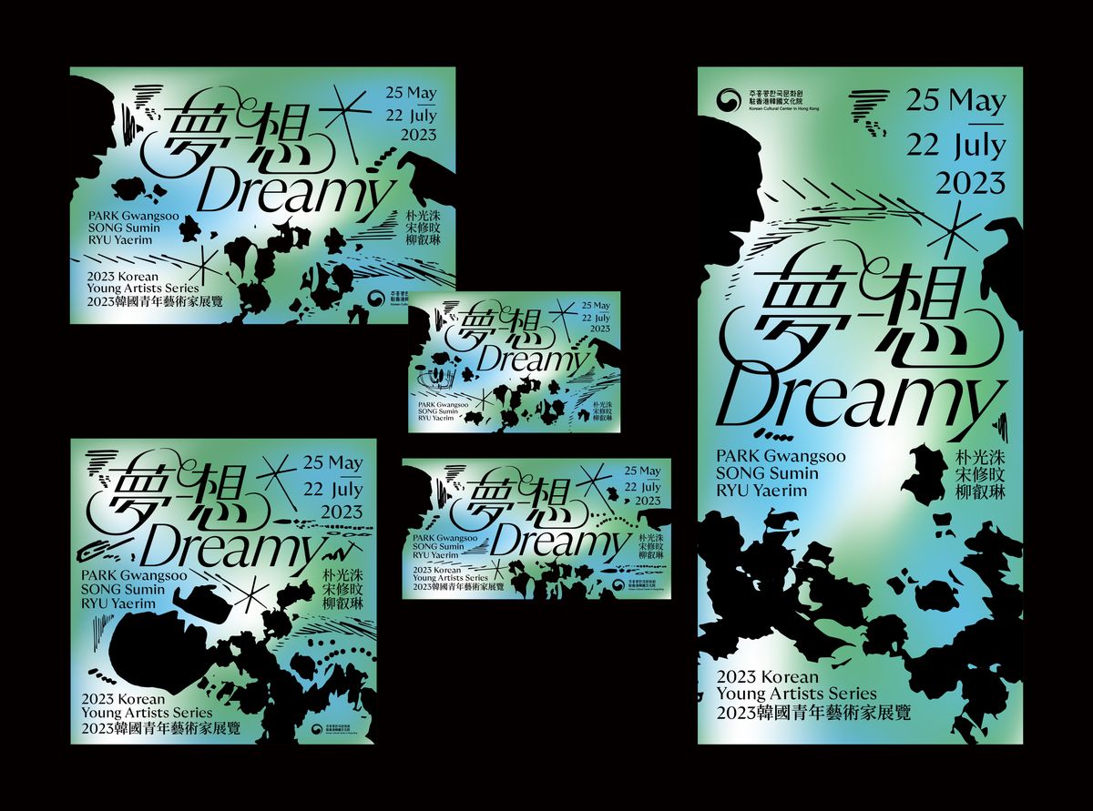 한국 동시대 회화를 이끌어가고 있는 세 명의 아티스트를 조명하는 2023젊은작가전 《夢-想 Dreamy》를 표현하기 위해 세 작가의 각기 다른 미술세계를 합쳐놓은 꿈같은 공간을 만들었다. 이는 전시 《夢-想 Dreamy》를 상징하기도 한다. 세 작가의 작품을 연상시키는 요소들이 어울려 마치 하나의 작품처럼 보여지기도 하며, 개별적인 요소를 통해 작가 개개인이 떠오르기도 하는 경험을 통해 다양한 가능성을 제시하고자 했다. 세 작가의 작품이 공존하는 포스터 속 세계를 통해 관객은 여러가지 가능성을 떠올리며 다양한 이야기를 상상할 수 있다. 메인 타이틀 《夢-想》의 레터링은 ‘모호함에서 비롯된 가능성’이라는 공통점으로 각기다른 개성의 작가들을 연결지어 소개하는 본 전시를 시각적으로 표현한 것이다. 글자의 획의 두께와 기울기를 다양하게 사용하고, 텍스트를 연장해서 연결짓는 효과를 활용하여 화려하고 몽환적인 ‘꿈’을 표현하고자 했다