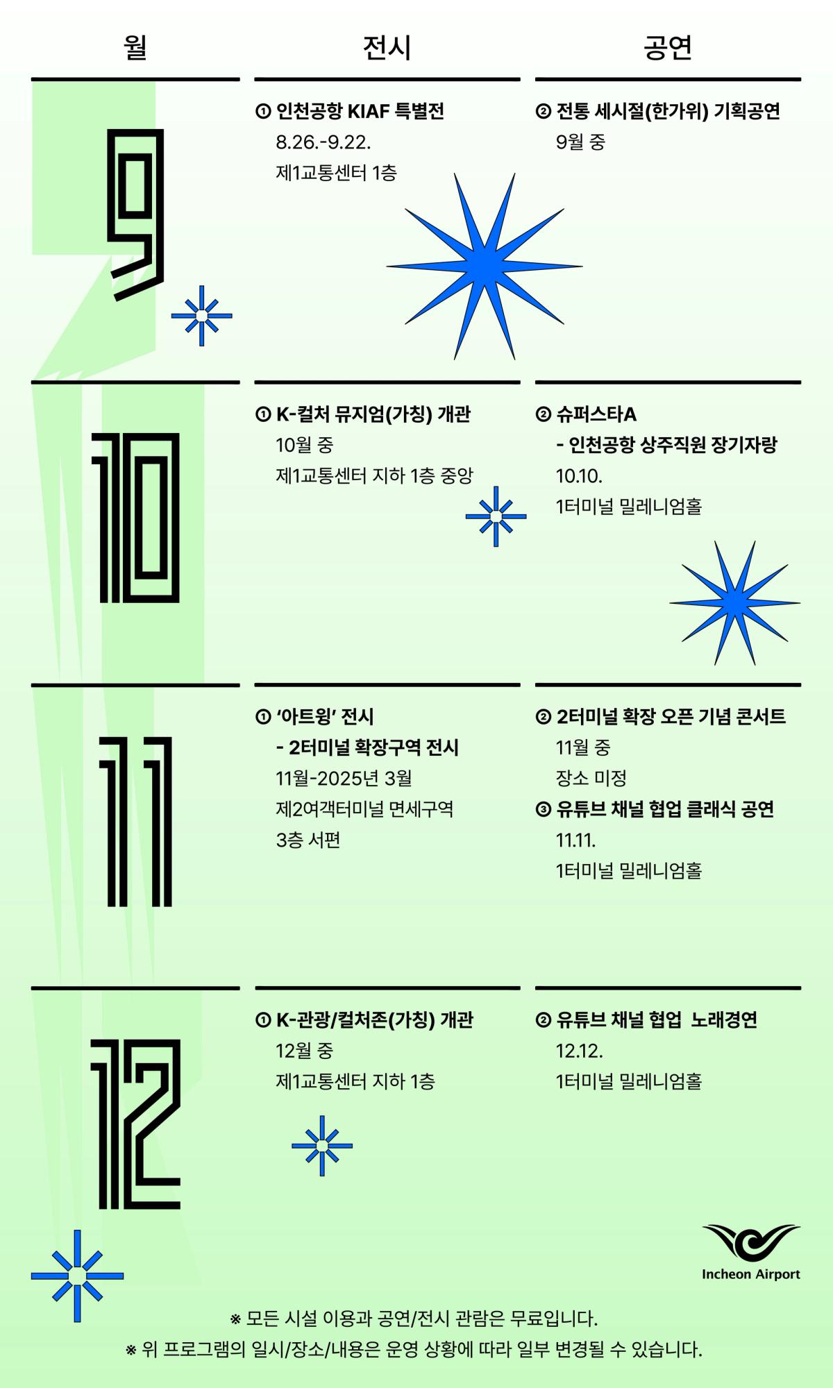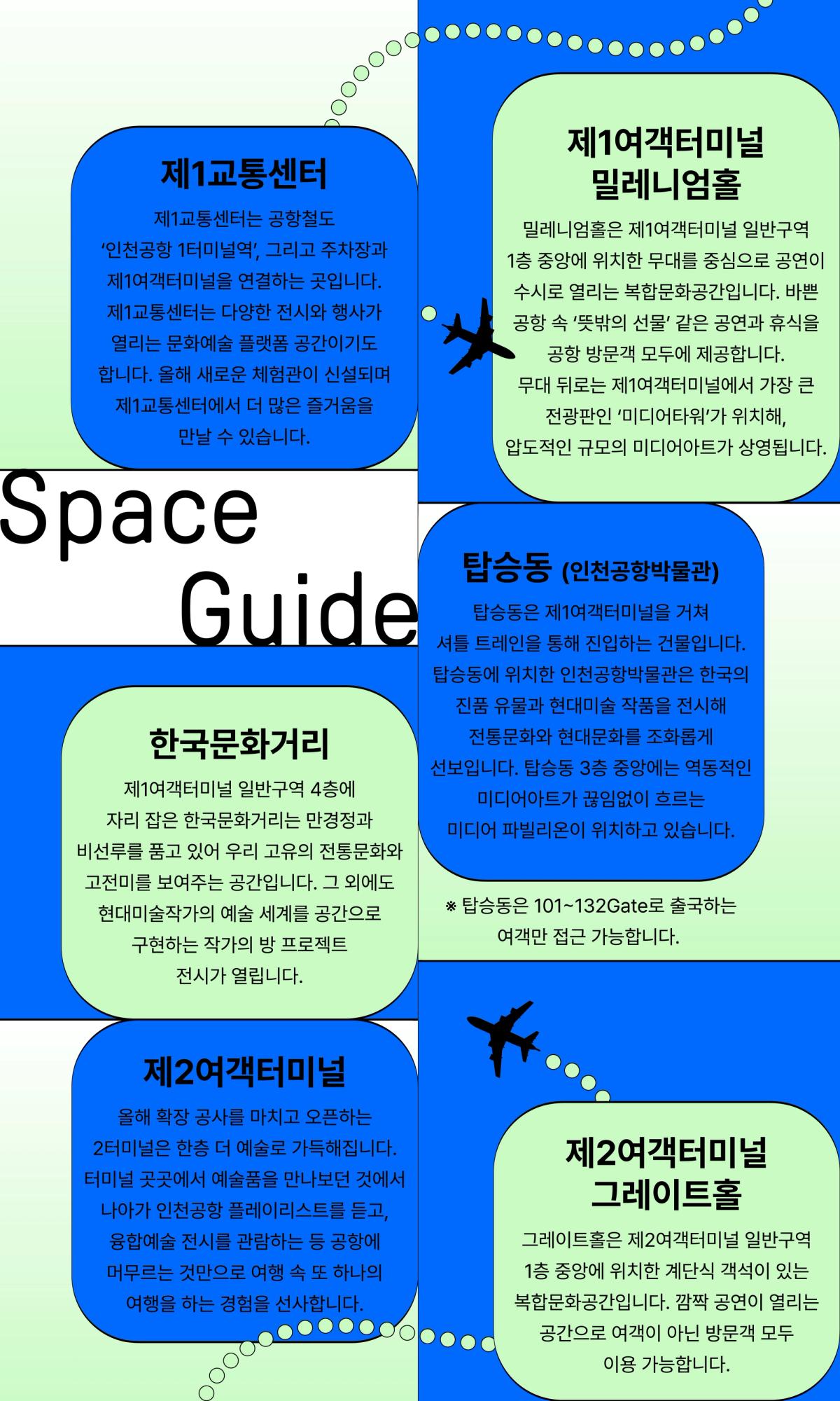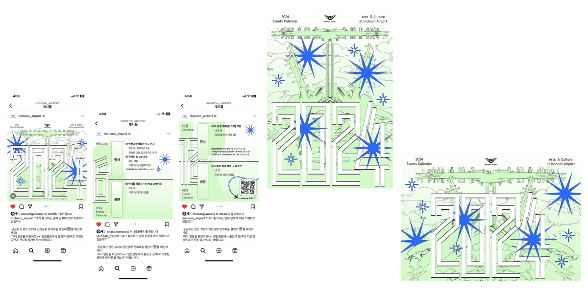 인천공항의 2024 문화예술 이벤트 캘린더를 디자인했습니다. 👩🏻✈️✈️🪅 “모두를 위한 공항” 인천공항은 1억 명을 수용하는 세계 최대 규모의 공항으로 확장되는 것과 더불어, 한국을 대표하는 공공장소로서 더욱 다양한 여행객을 포용하고 교류를 이루는 문화 예술 플랫폼으로서 영역을 확장합니다. 수용자로 하여금 인천국제공항을 단순히 여행객이 오고 가는 공간이 아닌, 문화 예술이 함께하는 장소로 인식시키기 위한 《2024 Events Calendar》를 디자인했습니다. 인천국제공항의 경험적 이미지와 문화 예술적 다채로운 표현기법을 결합하여 숫자 레터링을 제작했습니다. 숫자 레터링은 공항 활주로 숫자의 형태와 장소적 특징에서 영감을 받아 제작되었습니다. 정교하고 디지털적인 형태의 글자는 공항과 미래적인 이미지와 어우러지고, 아웃라인으로 이루어진 형태는 움직임, 변화, 새로움, 시간의 흐름 등을 표현합니다. 인천공항의 설계도를 중첩시키고 데칼코마니 기법으로 좌우 반전시켜 생겨난 그래픽으로 다채로운 양상을 가진 인천공항을 표현했습니다. 설계도의 형태를 하늘 위의 구름처럼 증폭시켜 ‘기대감으로 가득 찬 여행객이 오고 가는 공간’과 ‘다채로운 문화 예술공간’을 표현하고자 했습니다. 다채로운 인천공항의 문화 예술을 표현하기 위해 늦은 밤 활주로에 들어오는 밝은 LED 빛을 모티프로 그래픽 전반에 산란하듯 떠다니는 섬광들을 배치했습니다. 활주로 주변을 비추는 빛은 화려하고, 서로 중첩되며 더 밝은 빛으로 길을 비춰줍니다.