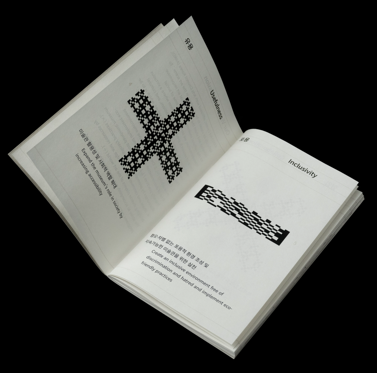 아르코미술관의 2024년 프로그램북을 디자인했습니다. ➕➖✖️➗ 지속가능한 미술관인 아르코미술관은 유용·포용·협업·공유라는 운영방향을 갖고있습니다. 이러한 지속가능성을 향한 발걸음은 미술관의 기존 '친(親)환경'을 넘어 보다 당위성을 내포한 '필(必)환경'으로까지 이어집니다. 일부 작은 조각이 전체와 비슷한 기하학적 형태를 띄는 프렉탈 구조는 자연에서 쉽게 찾아볼 수 있는 패턴입니다. 아르코미술관의 더하고, 빼고, 곱하고, 나누는 운영방향을 나타내는 사칙연산 기호를 자연물에서 기인한 프렉탈 구조에 비유했습니다. 포스터는 기존의 아르코미술관의 상징적인 그리드를 활용하여 제작되었습니다. 포스터에 담긴 정보와 로고들은 그리드에 준수하여 단정하게 연출하였으며, 프렉탈 구조의 그래픽요소들은 그리드 위를 자유롭게 넘나드는 모습으로 구성했습니다. 이는 현대의 자유롭고 창의적인 신진작가를 모아 기획한 전시로 현대미술을 이끄는 아르코미술관을 상징합니다.