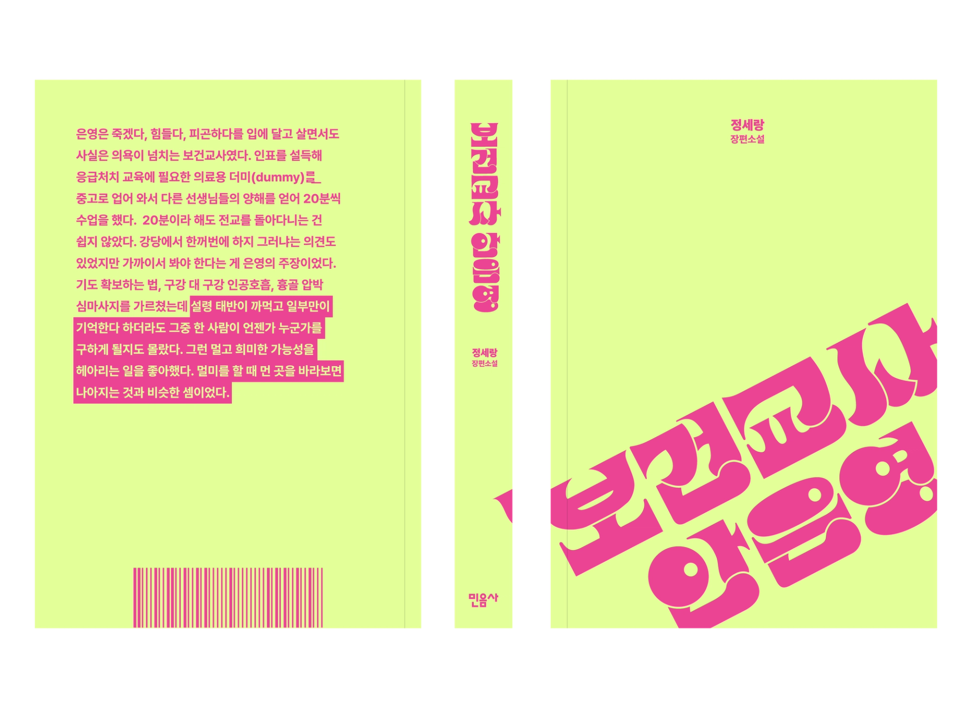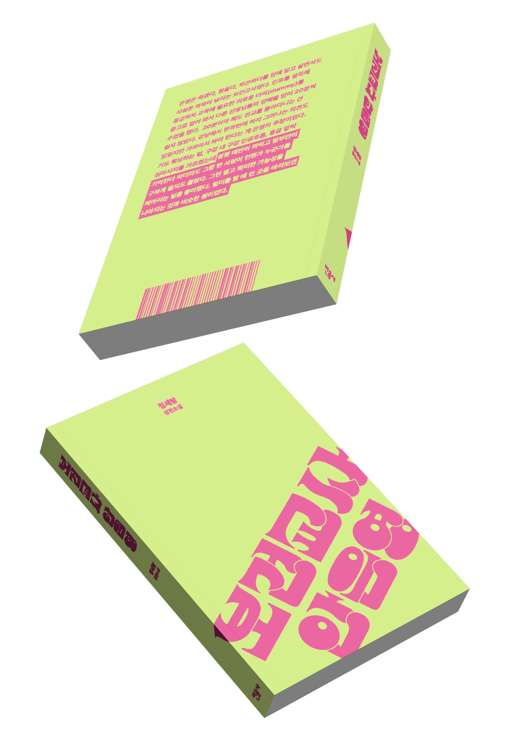 젤리와 맞서 싸우는 퇴마사이자 심령술사인 안은영의 정체성을 레터링으로 표현해 보았습니다. 다정하고 코믹한 히어로의 이미지를 떠올릴 수 있도록 볼드한 획으로 구성하고, 젤리의 형태를 연상시킬 수 있는 볼륨감 있고 키치한 형태의 조형을 활용했습니다. 북커버에는 안은영이라는 캐릭터를 가장 잘 표현하는 책 속의 구절을 삽입해 보았습니다.