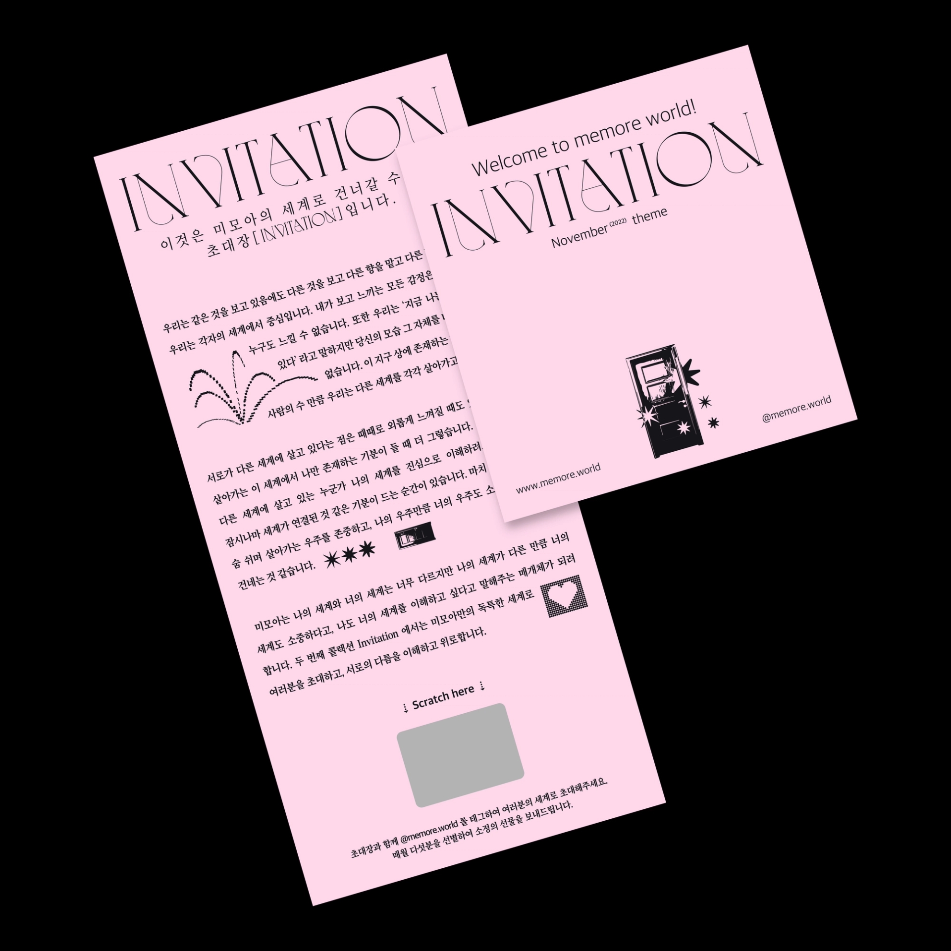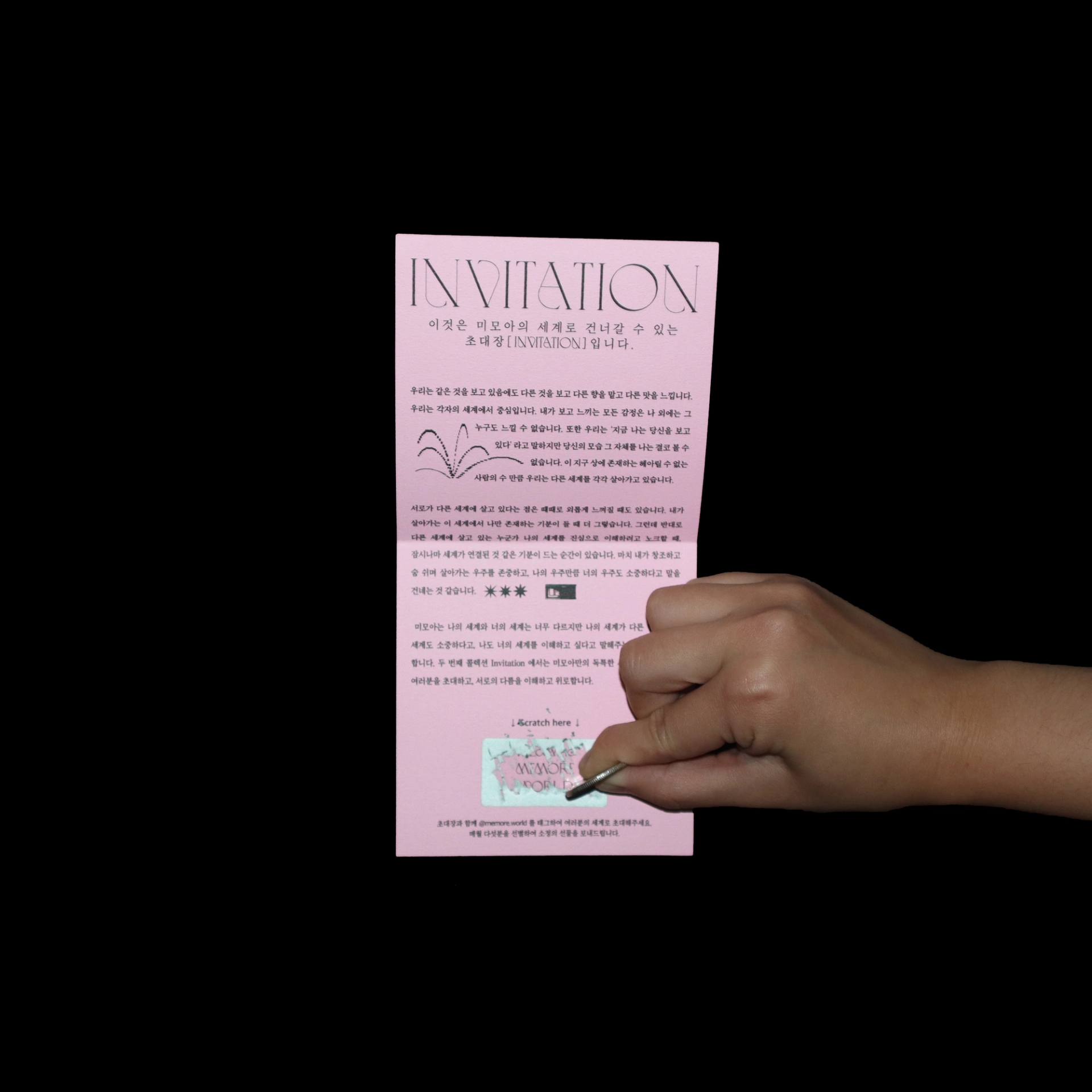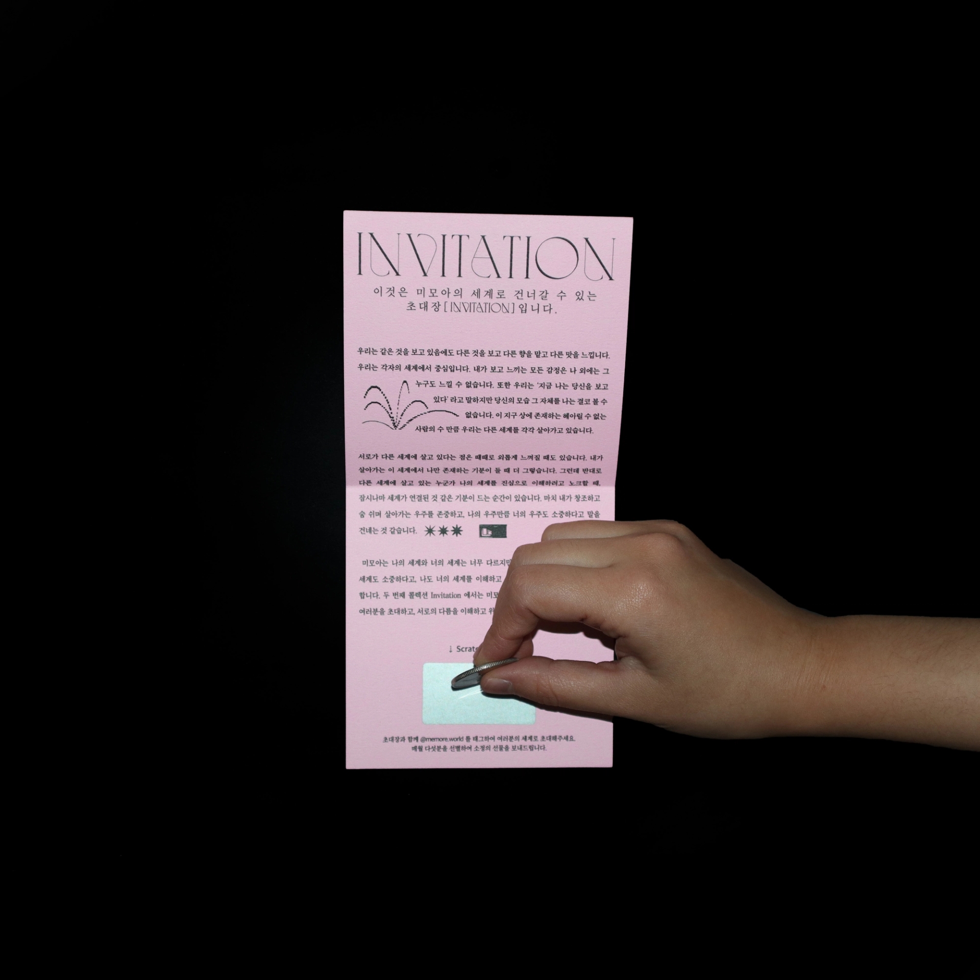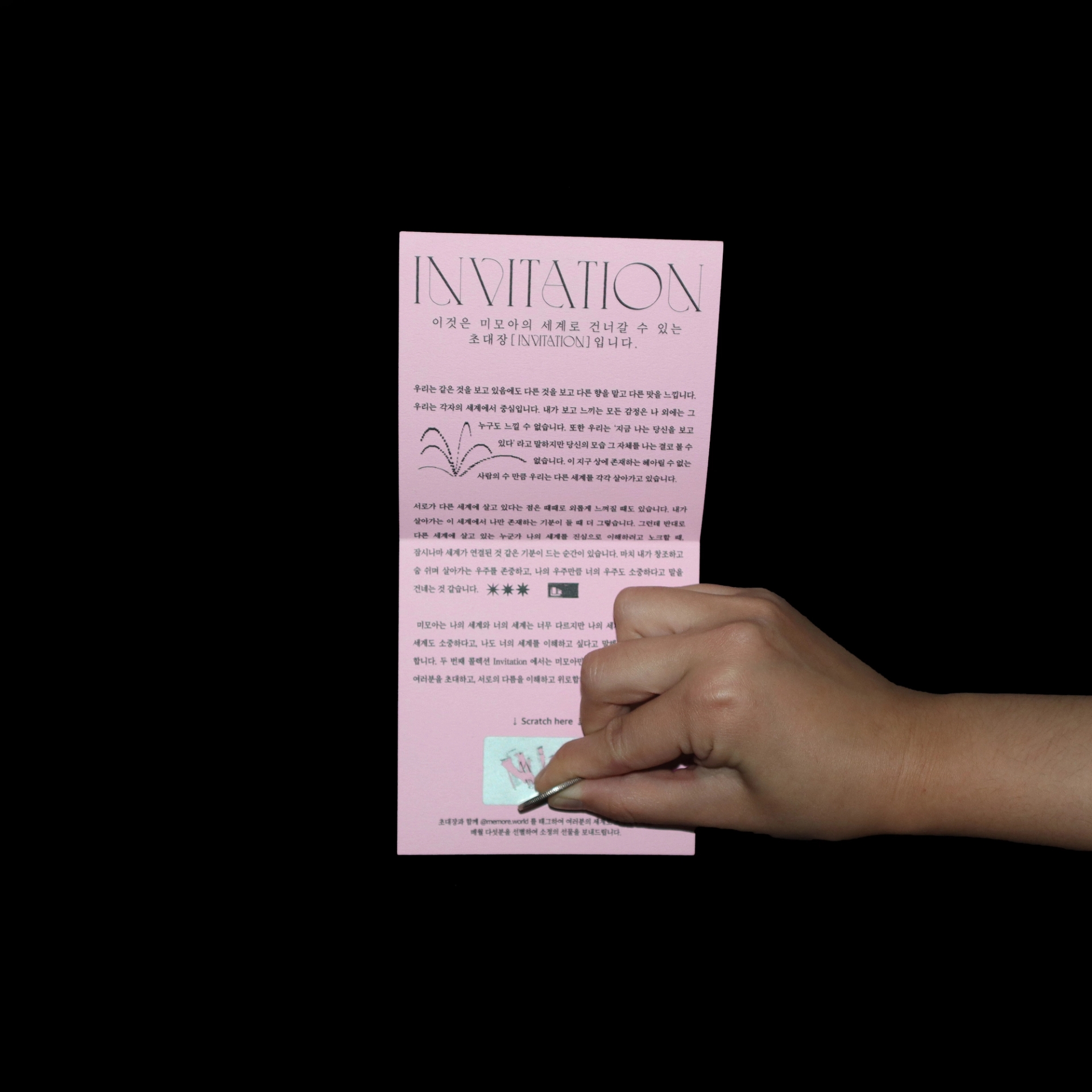 미모아의 11월 F/W 테마 Invitation은 각자의 세계를 살아가는 개개인의 독립성과 그럼에도 다른 이의 세계에 노크하고자 하는 유대성에 대한 이야기가 담겨있다.테마의 이름 Invitation을 직관적으로 표현하기 위해 홍보물을 반 접지된 초대장의 형태로 제작하였다. Invitation의 스토리 속 키워드인 ‘노크’, ‘개개인의 세계'를 그래픽으로 표현하여 초대장 곳곳에 배치하였으며, 화려하고 장식적인 메인 서체와 광택이 흐르는 종이의 재질을 통해 연말이 다가오는 시즌의 설레는 분위기를 느낄 수 있도록 하였다. 초대장 하단부에는 스크레치를 통해서만 메세지를 볼 수 있어 홍보물을 접하는 사람들이 미모아의 세계관을 체험하고 즐길 수 있도록 하였다.