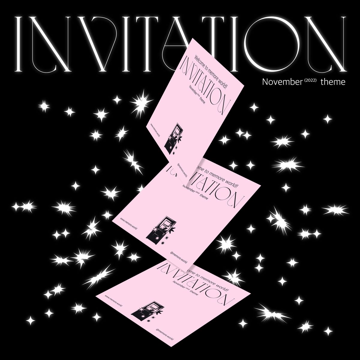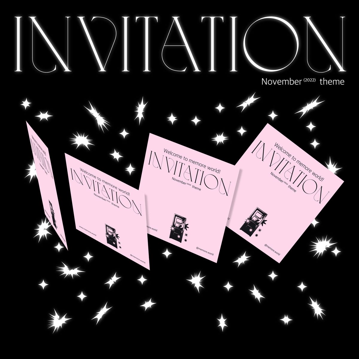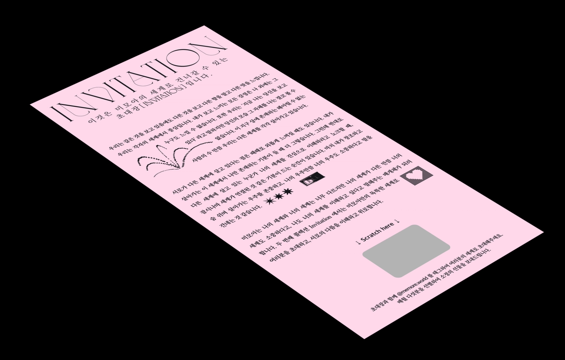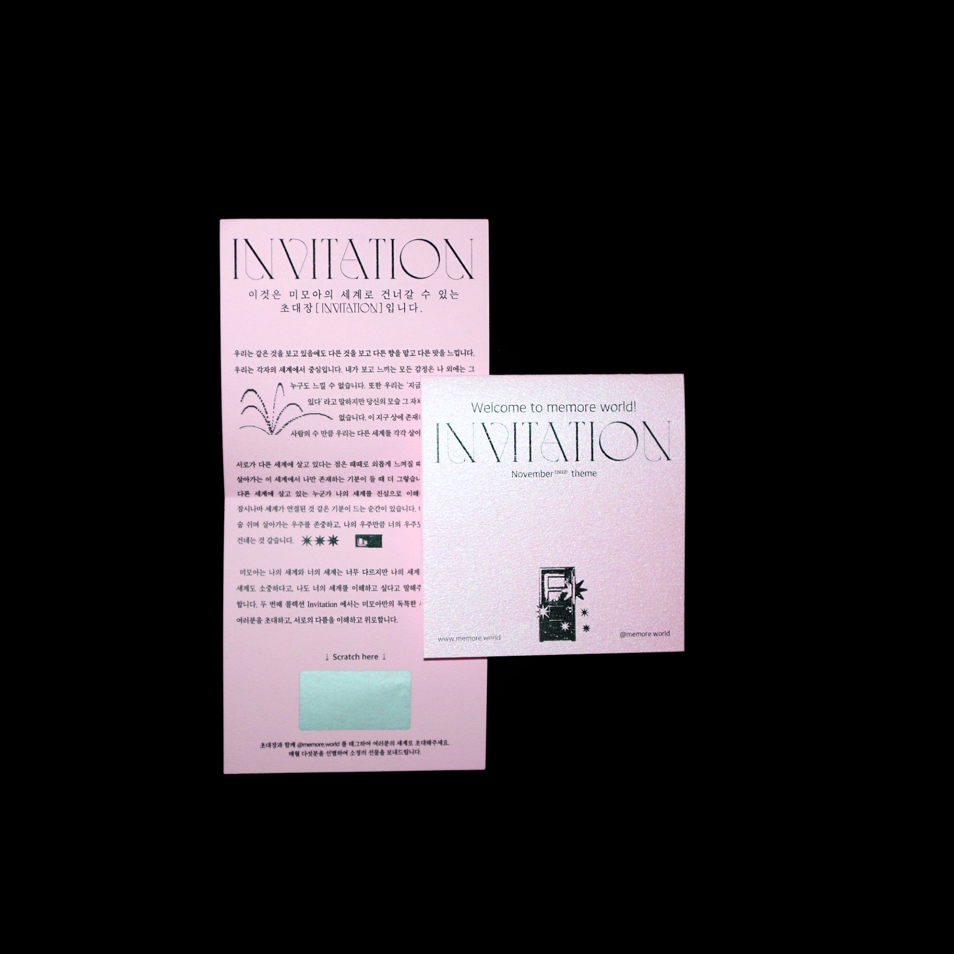 미모아의 11월 F/W 테마 Invitation은 각자의 세계를 살아가는 개개인의 독립성과 그럼에도 다른 이의 세계에 노크하고자 하는 유대성에 대한 이야기가 담겨있다.테마의 이름 Invitation을 직관적으로 표현하기 위해 홍보물을 반 접지된 초대장의 형태로 제작하였다. Invitation의 스토리 속 키워드인 ‘노크’, ‘개개인의 세계'를 그래픽으로 표현하여 초대장 곳곳에 배치하였으며, 화려하고 장식적인 메인 서체와 광택이 흐르는 종이의 재질을 통해 연말이 다가오는 시즌의 설레는 분위기를 느낄 수 있도록 하였다. 초대장 하단부에는 스크레치를 통해서만 메세지를 볼 수 있어 홍보물을 접하는 사람들이 미모아의 세계관을 체험하고 즐길 수 있도록 하였다.