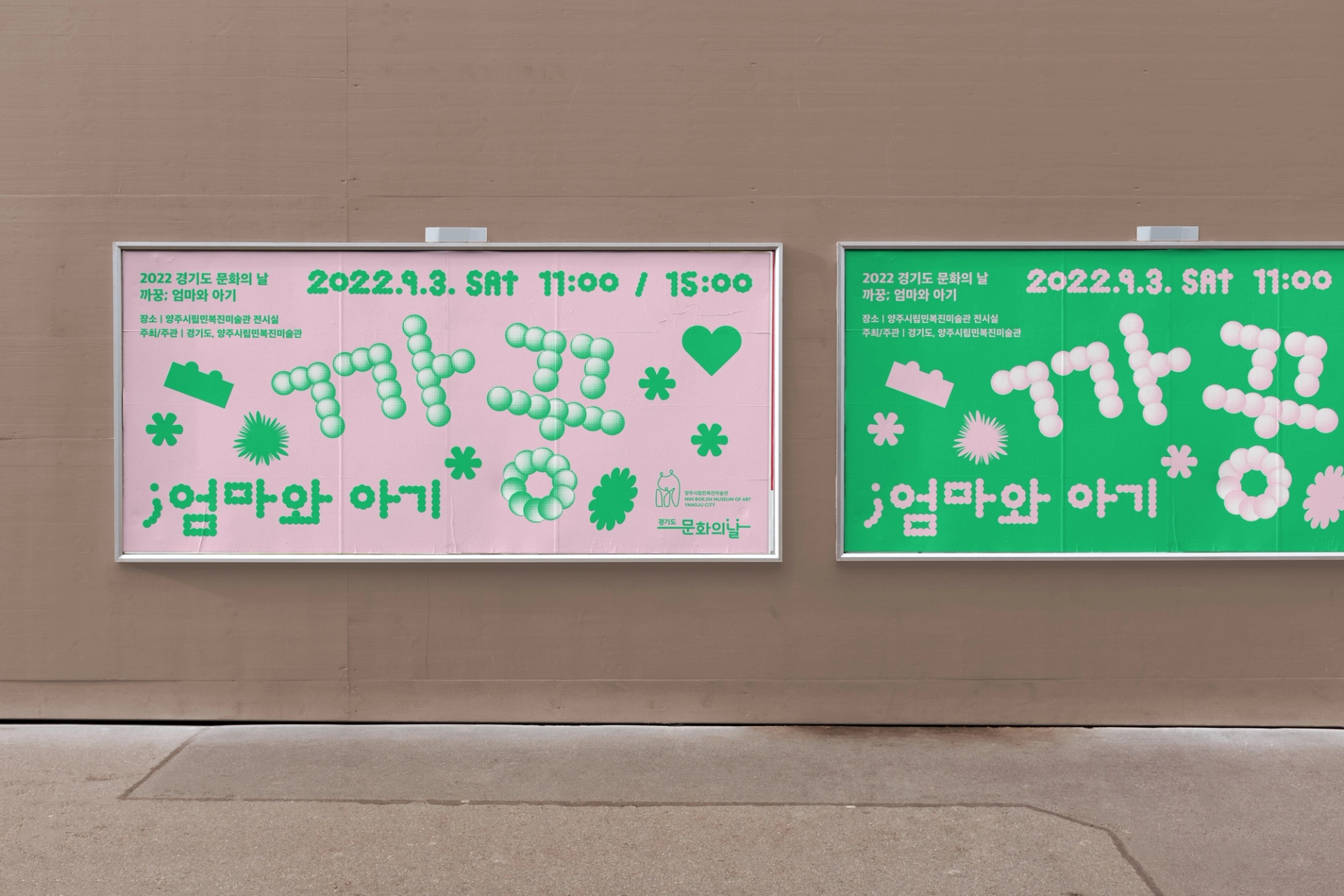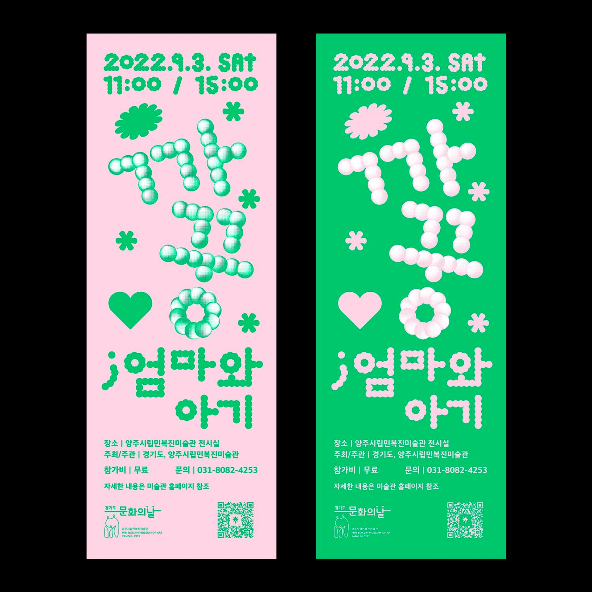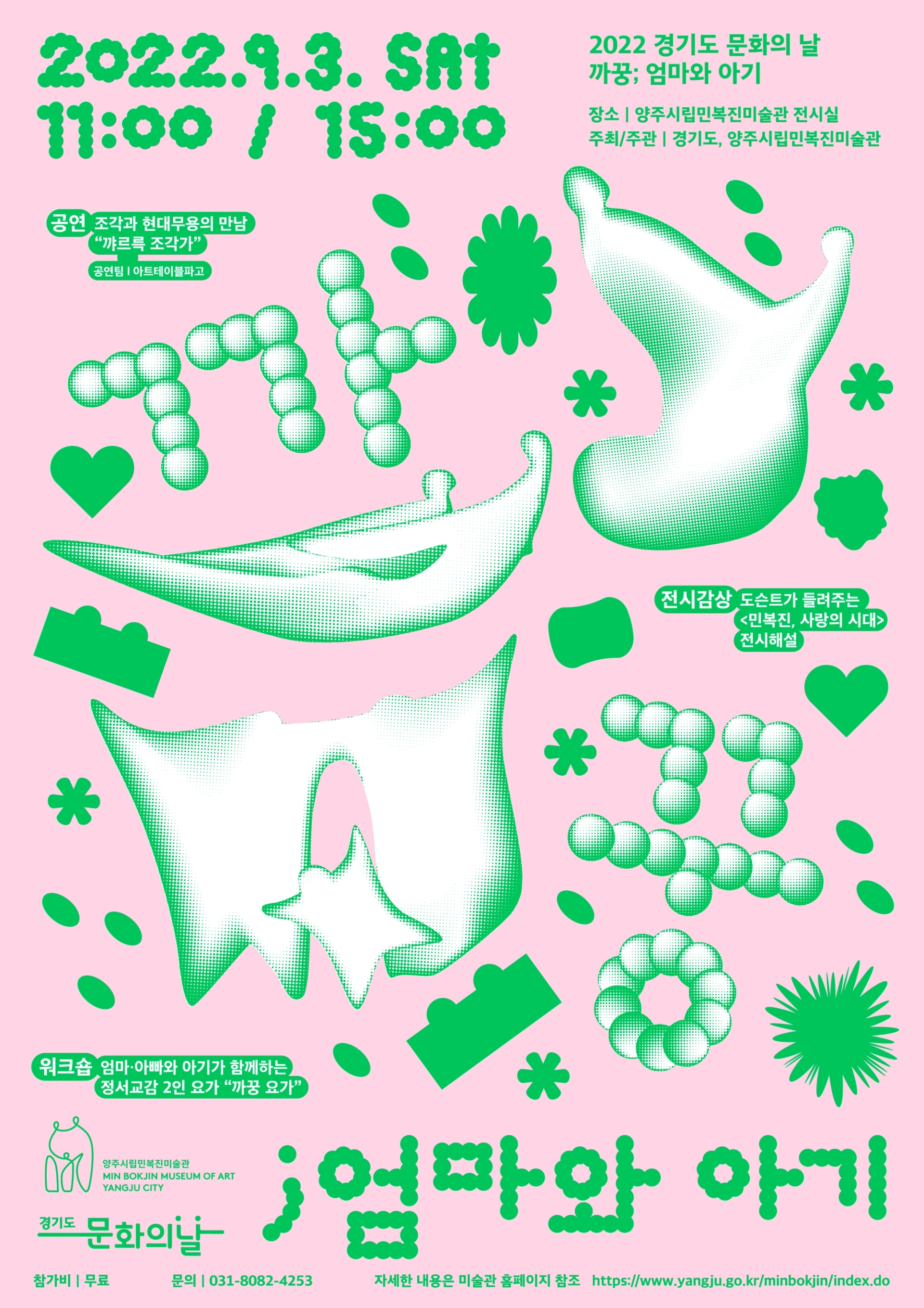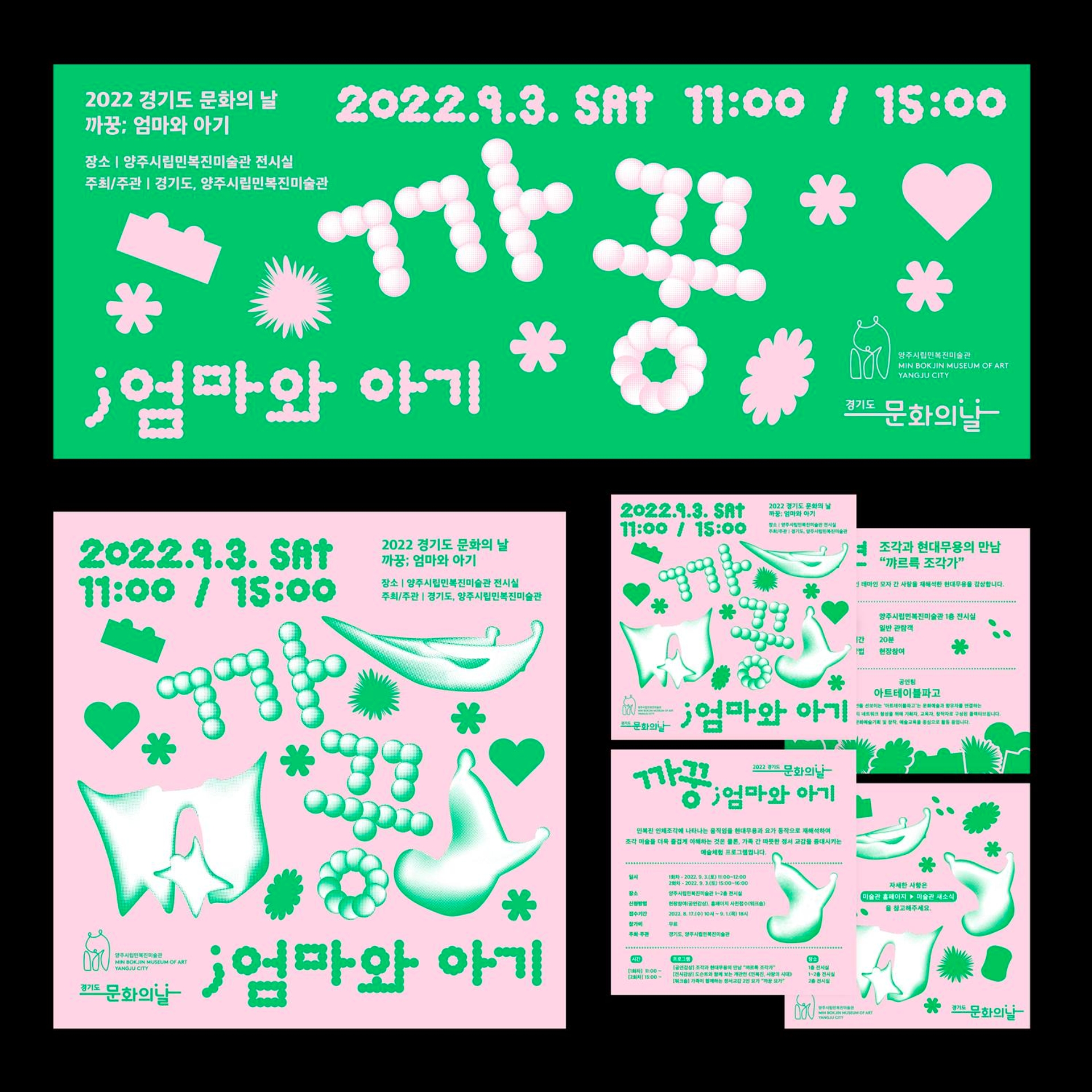 <까꿍; 엄마와 아기>는 인체조각에 나타나는 움직임을 현대무용과 요가 동작으로 재해석하여 조각 미술을 심도있게 이해하고, 가족 간 따뜻한 정서 교감을 증대시키는 예술체험 프로그램이다. 어린이 동반 가족이 참가하는 행사인 만큼, 참여자가 포스터를 보았을 때 편안함과 사랑스러움이라는 감정이 느껴질 수 있도록 하였다. 포스터의 메인 타이포그라피는 아기용품에서 가장 많이 쓰이는 요소인 ‘구’를 반복적, 규칙적으로 사용해 제작하였고, 포스터 곳곳에 어린이 장난감을 연상시키는 요소들을 배치하는등 편안함, 사랑스러움과 더불어 안정감, 동화적인 느낌을 줄 수 있도록 시각적으로 표현하였다.<까꿍; 엄마와 아기>행사의 가장 큰 특징은 민복진 미술관 내에서 미술품에 둘러싸여 공연감상, 요가 등의 예술체험을 할 수 있다는 점이다. 따라서 인더그래픽스는 민복진 조각을 주제로 포스터를 전개해나가고자 하였다. ‘모자상’을 본따 제작한 그래픽과 ‘까꿍’ 타이포를 포스터 중앙에 배치하였으며, 양감을 주어 민복진 조각 특유의 부드러운 덩어리감을 표현하고자하였다. 비트맵의 가장 작은 단위 또한 원으로 설정하여 까꿍 타이포그라피와 통일성을 가져갈 수 있도록 하였다.‘까꿍’은 신생아에게 대상영속성 즉 사물이 영속적으로 존재한다는 개념을 가르쳐주는 놀이이다. 모션그래픽은 대상 영속성 놀이의 대표적인 장난감인 깜짝상자의 움직임에서 영감을 받아 제작하였으며, 까꿍이라는 타이포그라피가 보이지않다가 깜짝상자 인형처럼 부드럽고 탄력있게 나온 후에는 심장박동이 뛰는듯한 모션을 주어 ‘사랑’이라는 행사의 키워드를 표현하였다.motion graphic: 컴플렉스룸(@complexroom )