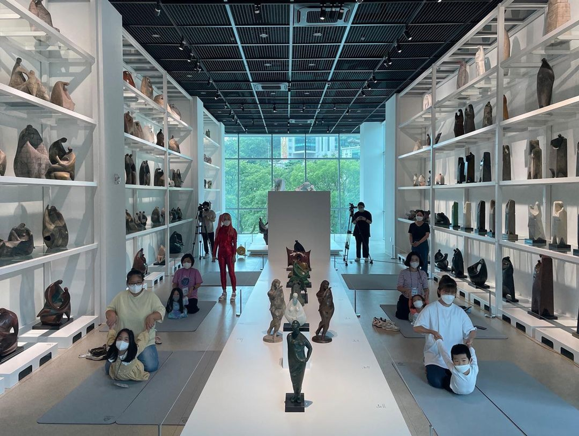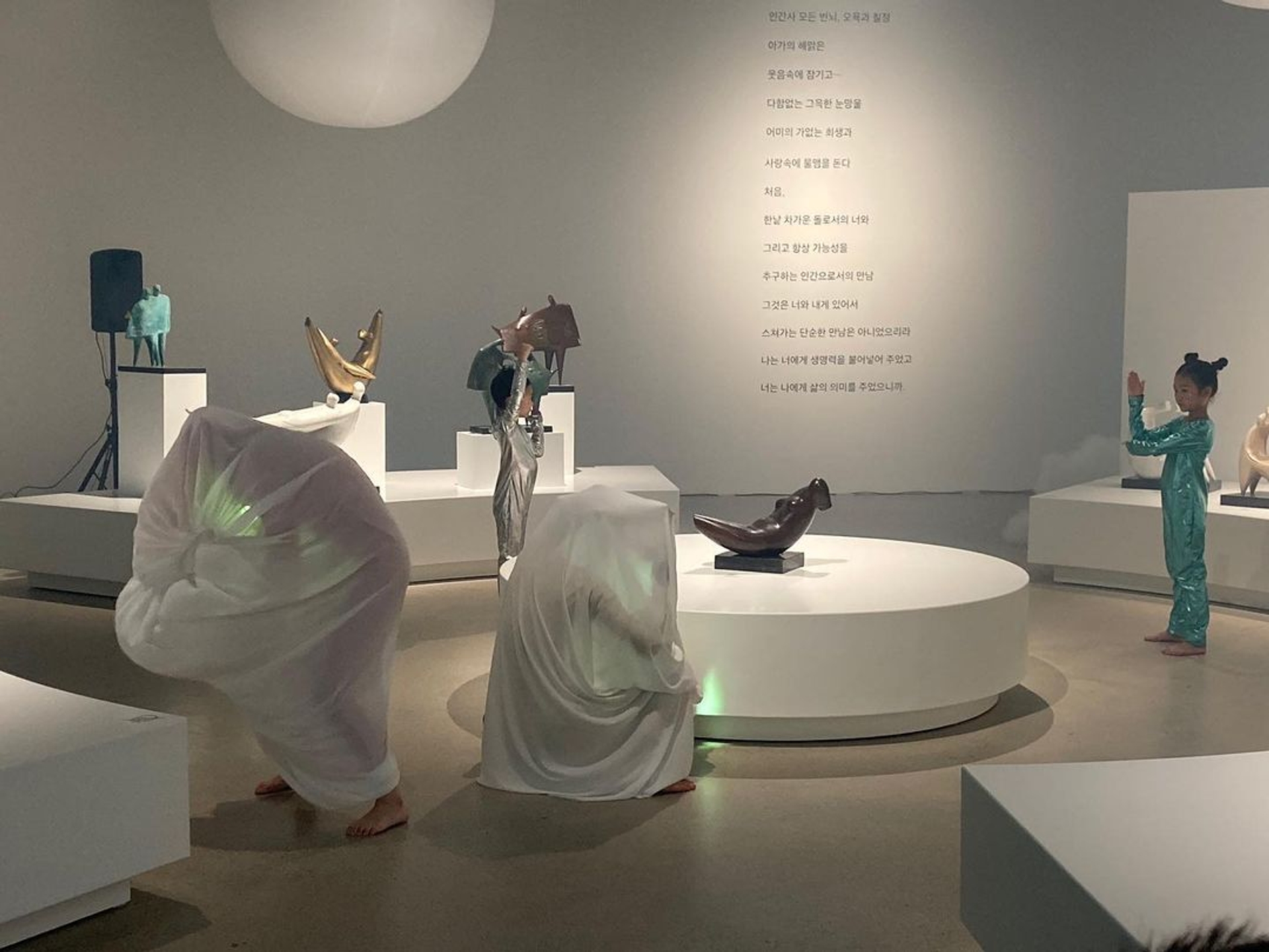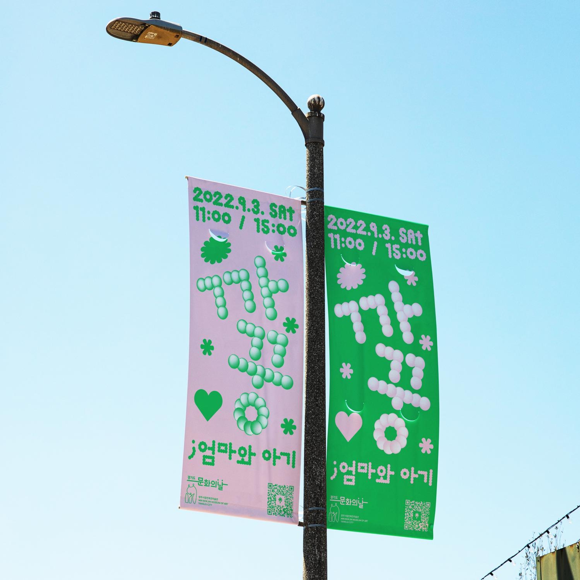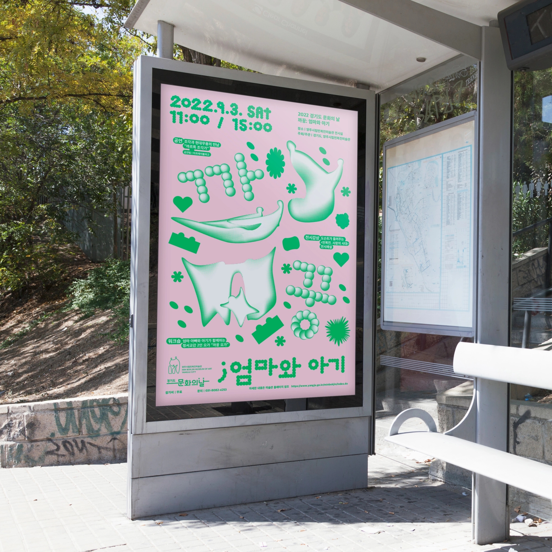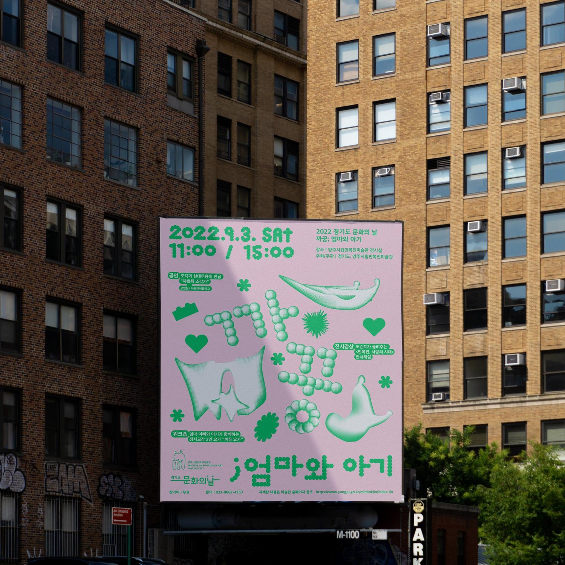 <까꿍; 엄마와 아기>는 인체조각에 나타나는 움직임을 현대무용과 요가 동작으로 재해석하여 조각 미술을 심도있게 이해하고, 가족 간 따뜻한 정서 교감을 증대시키는 예술체험 프로그램이다. 어린이 동반 가족이 참가하는 행사인 만큼, 참여자가 포스터를 보았을 때 편안함과 사랑스러움이라는 감정이 느껴질 수 있도록 하였다. 포스터의 메인 타이포그라피는 아기용품에서 가장 많이 쓰이는 요소인 ‘구’를 반복적, 규칙적으로 사용해 제작하였고, 포스터 곳곳에 어린이 장난감을 연상시키는 요소들을 배치하는등 편안함, 사랑스러움과 더불어 안정감, 동화적인 느낌을 줄 수 있도록 시각적으로 표현하였다.<까꿍; 엄마와 아기>행사의 가장 큰 특징은 민복진 미술관 내에서 미술품에 둘러싸여 공연감상, 요가 등의 예술체험을 할 수 있다는 점이다. 따라서 인더그래픽스는 민복진 조각을 주제로 포스터를 전개해나가고자 하였다. ‘모자상’을 본따 제작한 그래픽과 ‘까꿍’ 타이포를 포스터 중앙에 배치하였으며, 양감을 주어 민복진 조각 특유의 부드러운 덩어리감을 표현하고자하였다. 비트맵의 가장 작은 단위 또한 원으로 설정하여 까꿍 타이포그라피와 통일성을 가져갈 수 있도록 하였다.‘까꿍’은 신생아에게 대상영속성 즉 사물이 영속적으로 존재한다는 개념을 가르쳐주는 놀이이다. 모션그래픽은 대상 영속성 놀이의 대표적인 장난감인 깜짝상자의 움직임에서 영감을 받아 제작하였으며, 까꿍이라는 타이포그라피가 보이지않다가 깜짝상자 인형처럼 부드럽고 탄력있게 나온 후에는 심장박동이 뛰는듯한 모션을 주어 ‘사랑’이라는 행사의 키워드를 표현하였다.motion graphic: 컴플렉스룸(@complexroom )