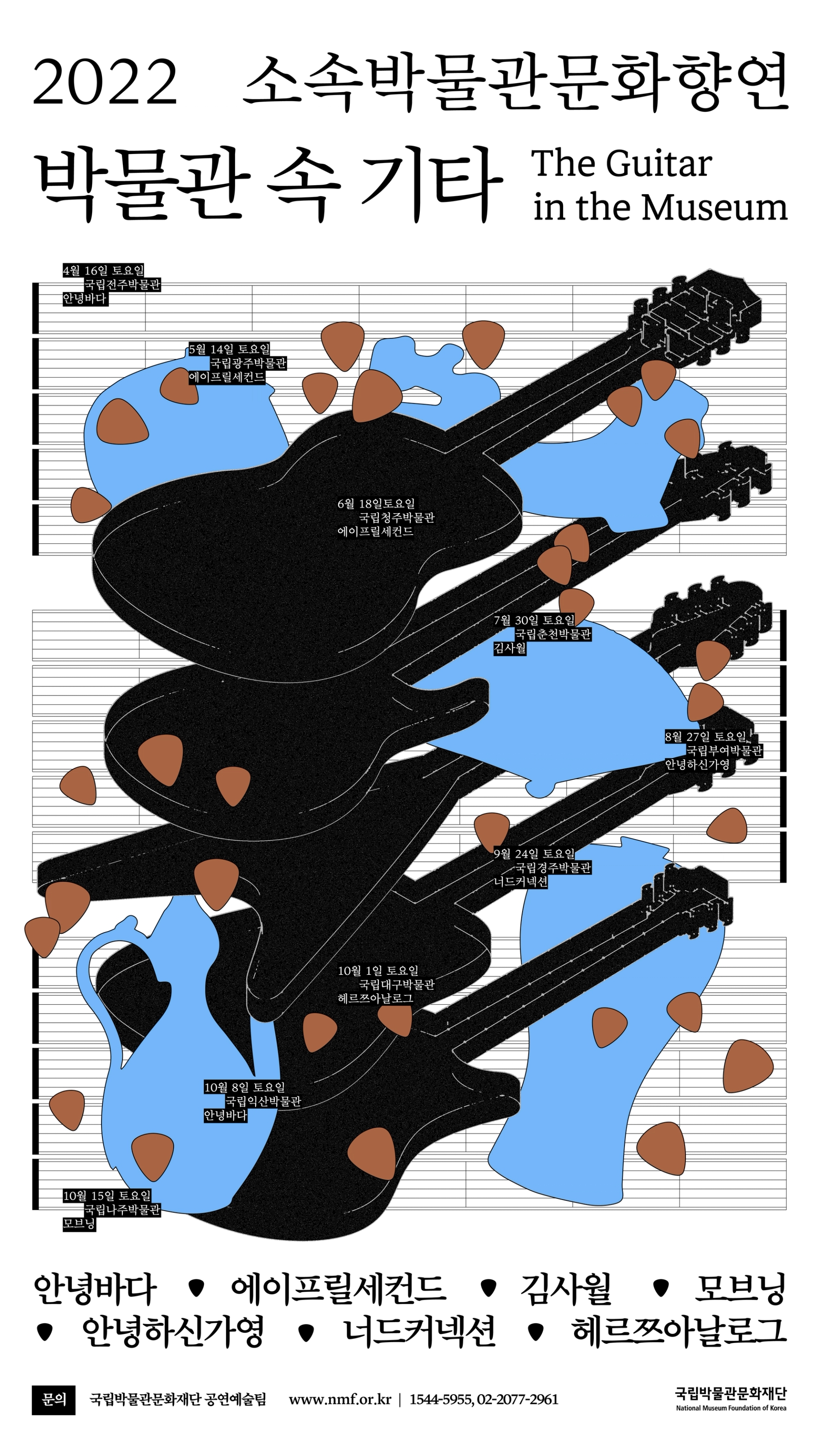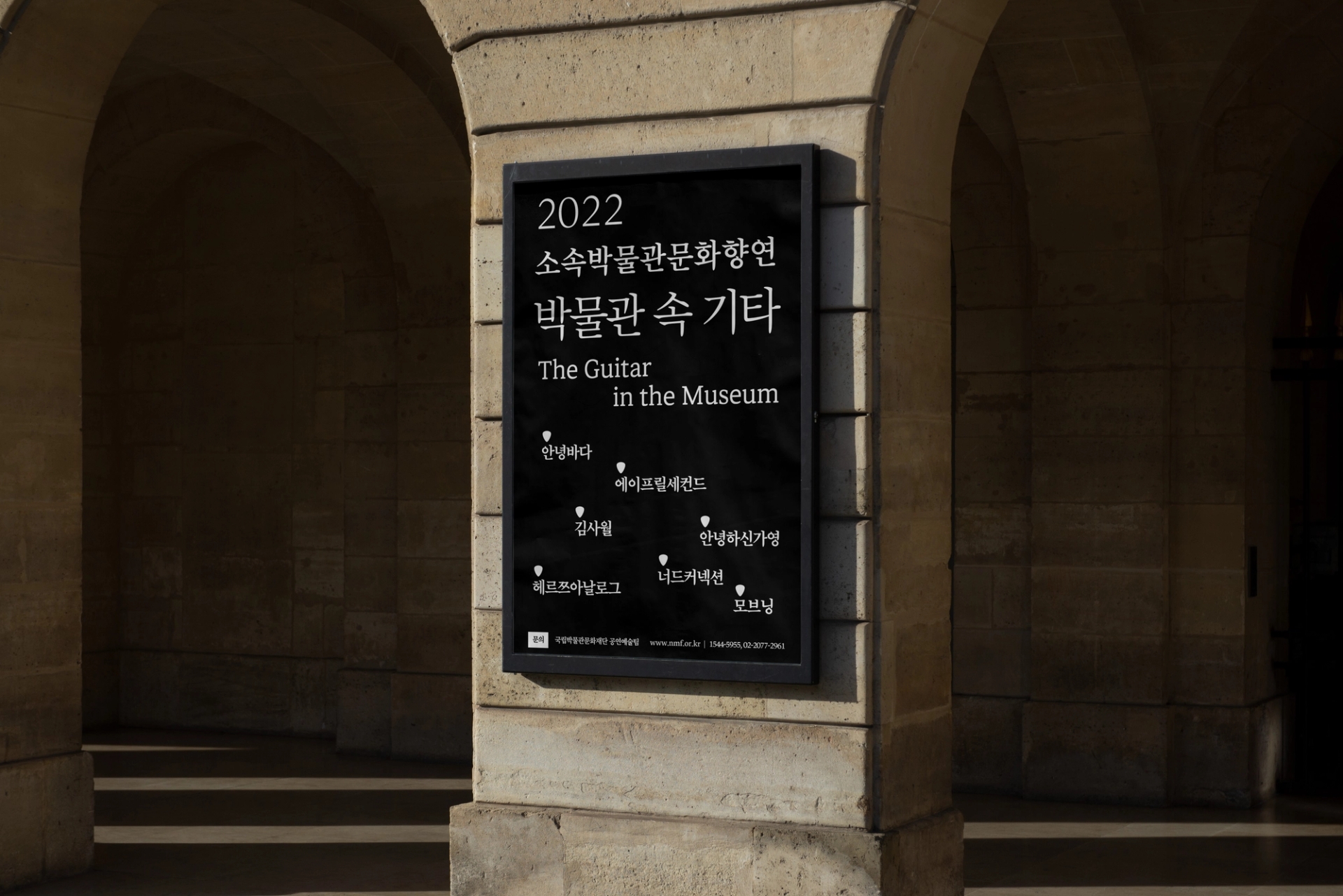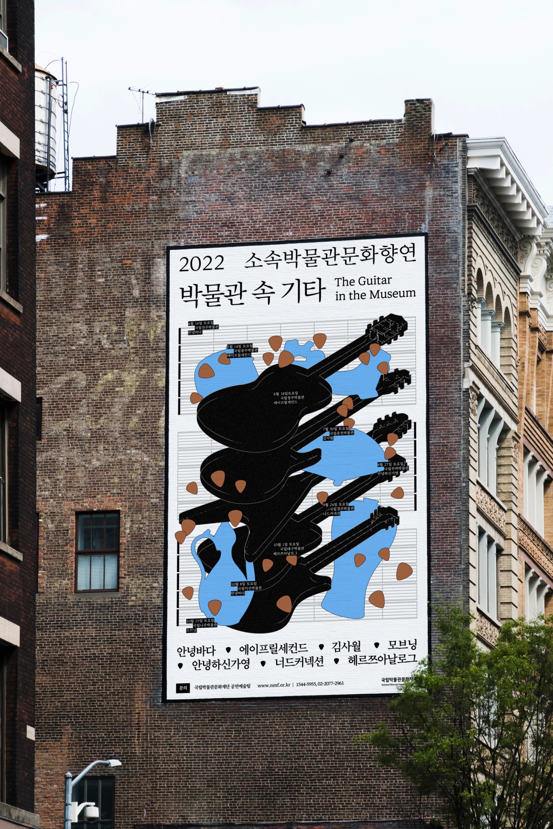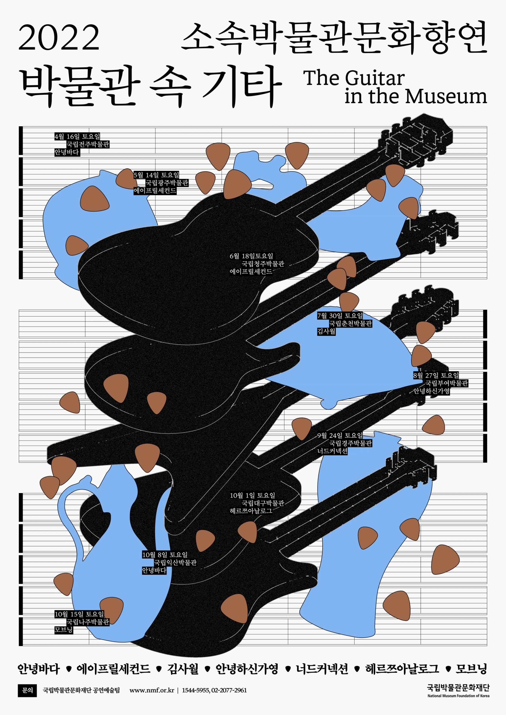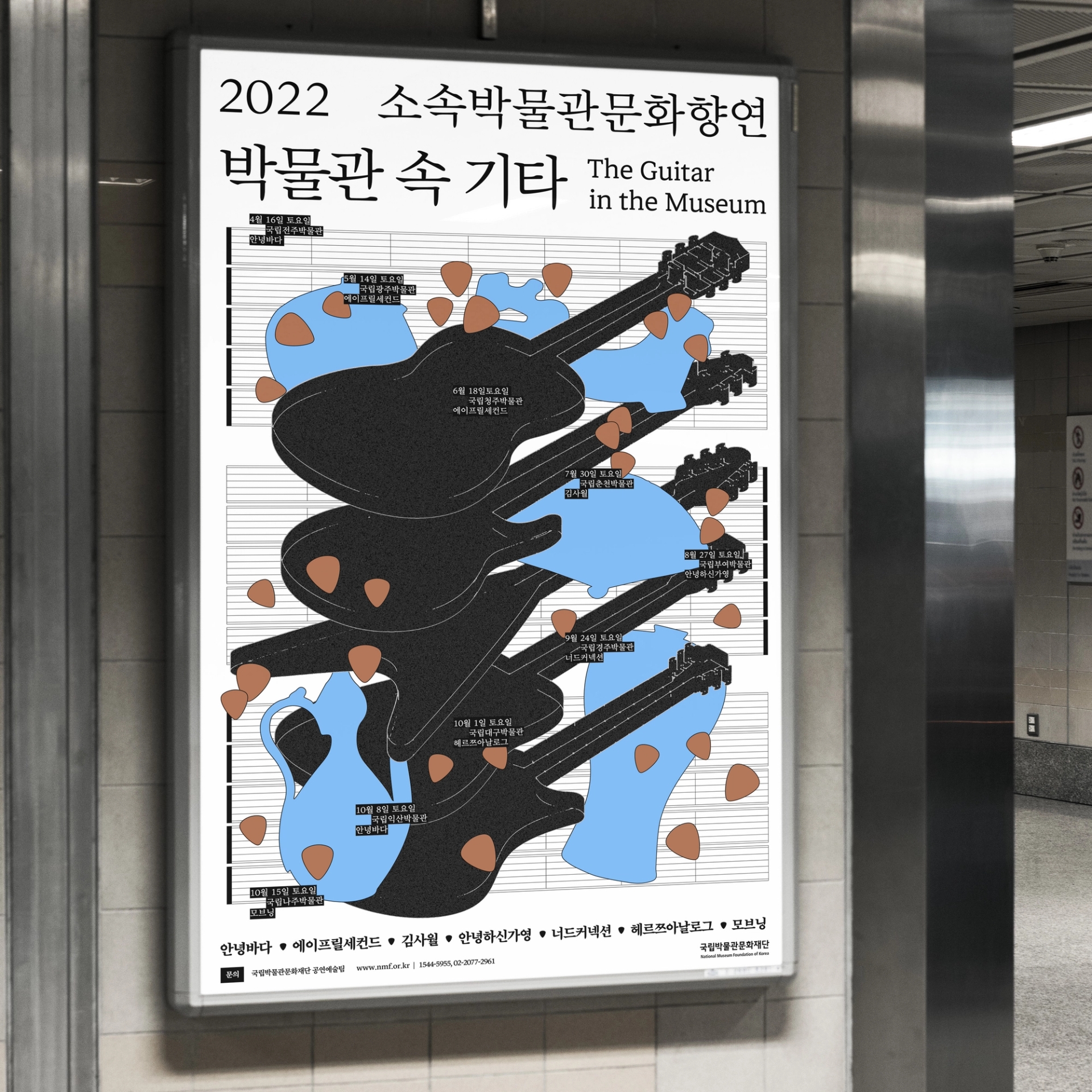 포스터안에는 각기 다른 모양의 개성있는 기타들이 층층이 쌓여있으며, 이는 <박물관 속 기타>에 참여하는 아티스트를 상징한다. 기타 주변에는 박물관을 상징하는 요소(유물)와 그 위로 흩날리는 꽃잎모양의 기타 피크가 둘러싸고있는데, 이를 통해 자유롭고 산뜻한 행사의 분위기를 상상할 수 있도록 하였다. 아티스트 정보와 일시 정보가 담긴 아홉개의 검정 박스를 악보위에 음표처럼 배치시키고, 타이틀과 서브텍스트 등을 상하단에 가지런히 배치하여 포스터의 전체적인 형태가 악보를 연상시키도록 하였다.