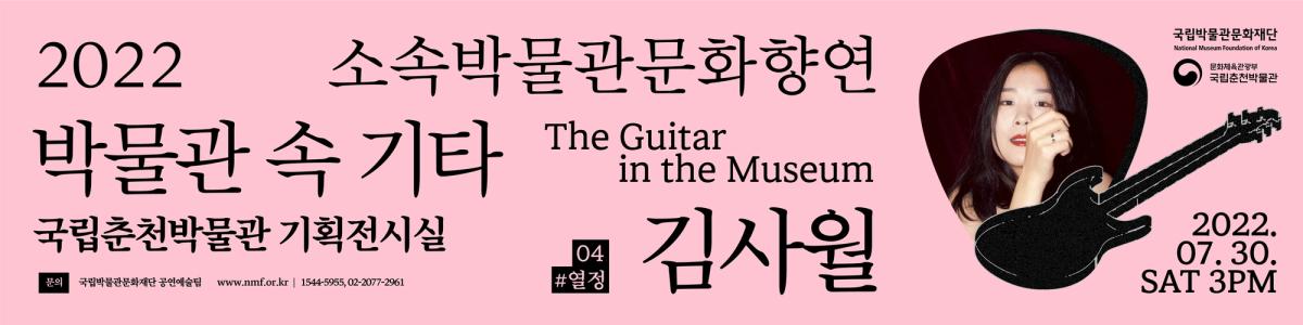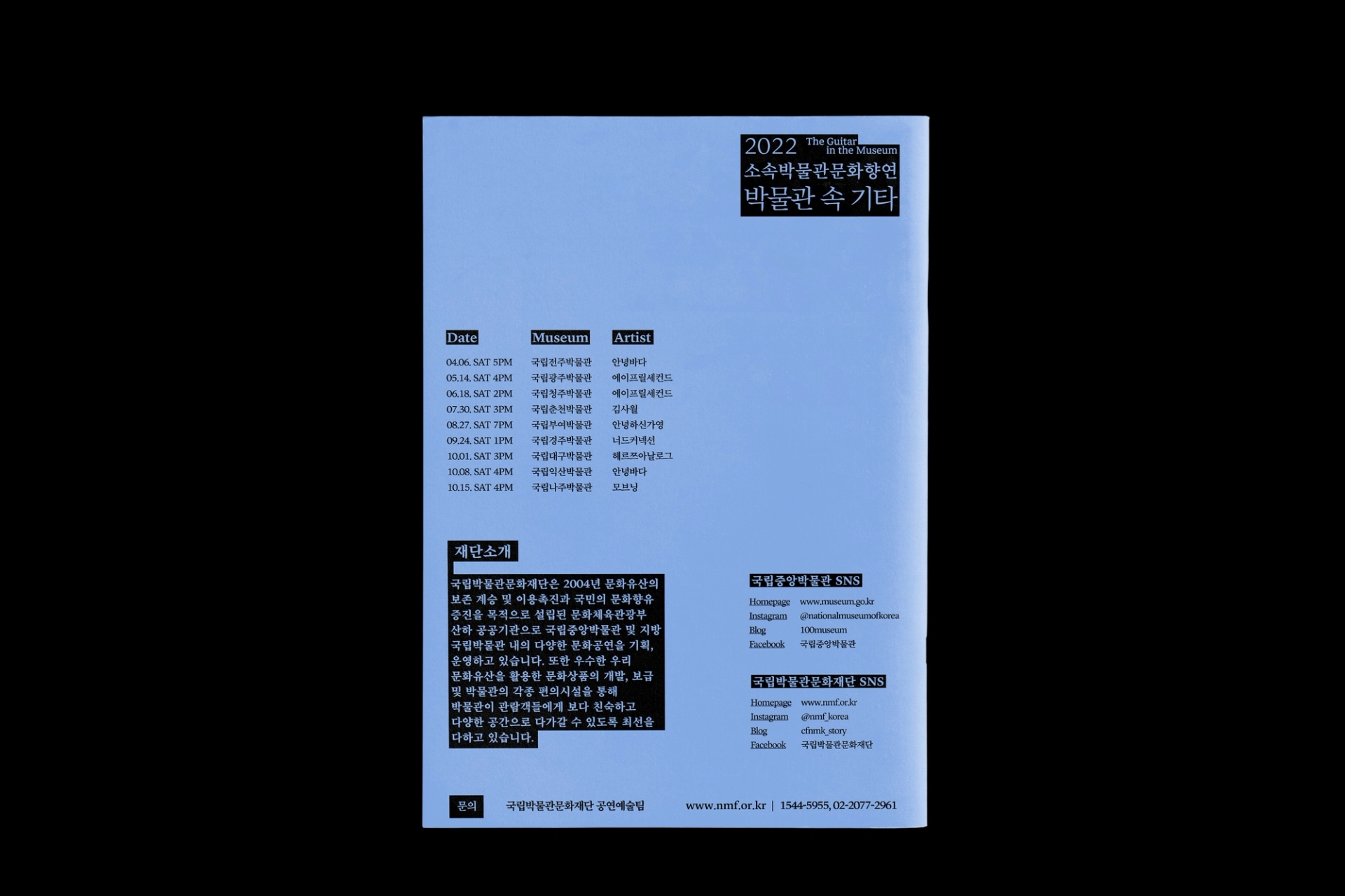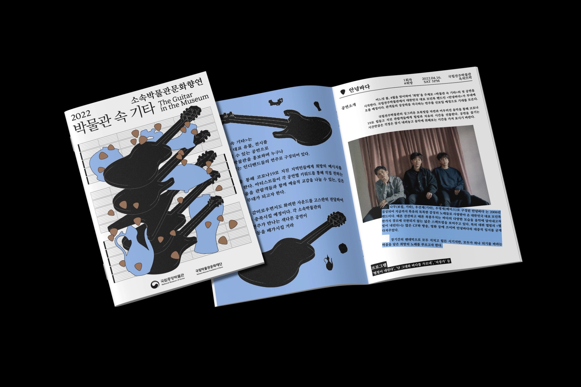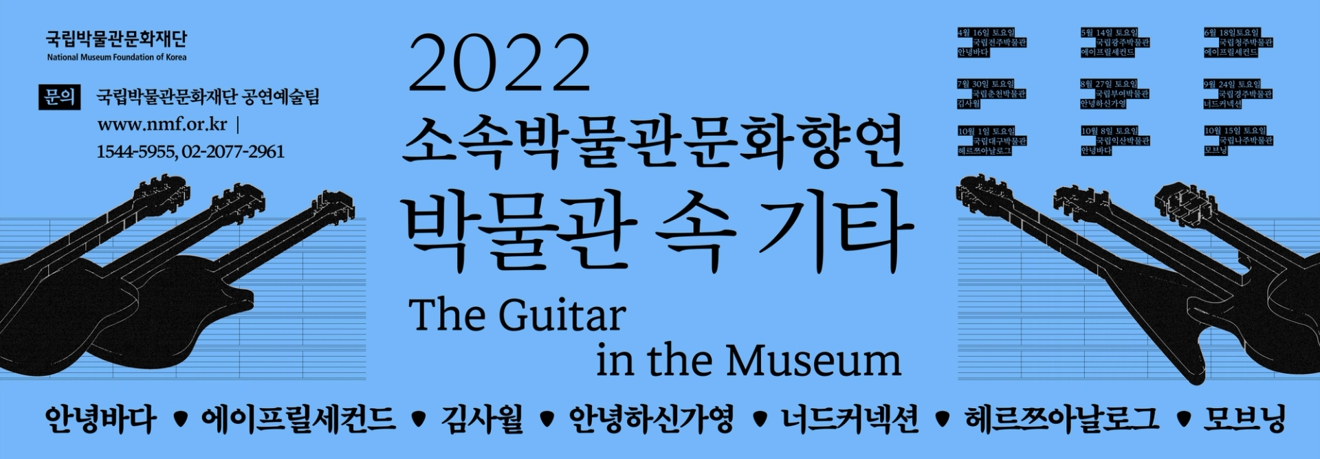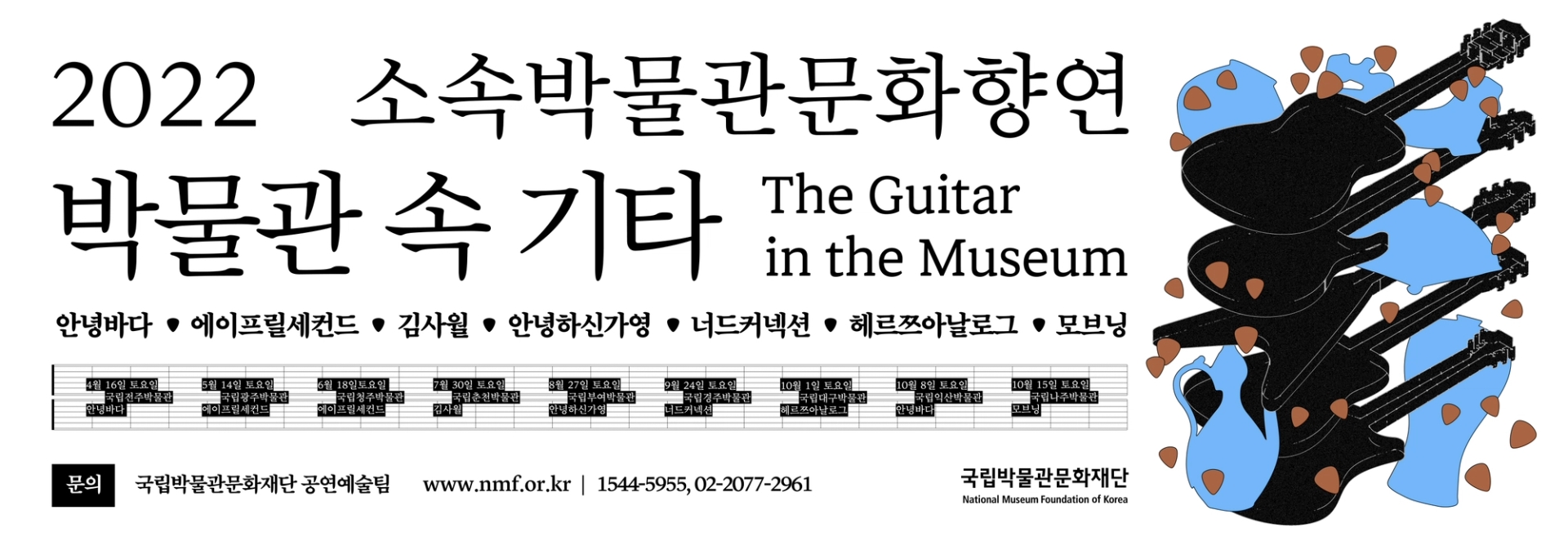 포스터안에는 각기 다른 모양의 개성있는 기타들이 층층이 쌓여있으며, 이는 <박물관 속 기타>에 참여하는 아티스트를 상징한다. 기타 주변에는 박물관을 상징하는 요소(유물)와 그 위로 흩날리는 꽃잎모양의 기타 피크가 둘러싸고있는데, 이를 통해 자유롭고 산뜻한 행사의 분위기를 상상할 수 있도록 하였다. 아티스트 정보와 일시 정보가 담긴 아홉개의 검정 박스를 악보위에 음표처럼 배치시키고, 타이틀과 서브텍스트 등을 상하단에 가지런히 배치하여 포스터의 전체적인 형태가 악보를 연상시키도록 하였다.