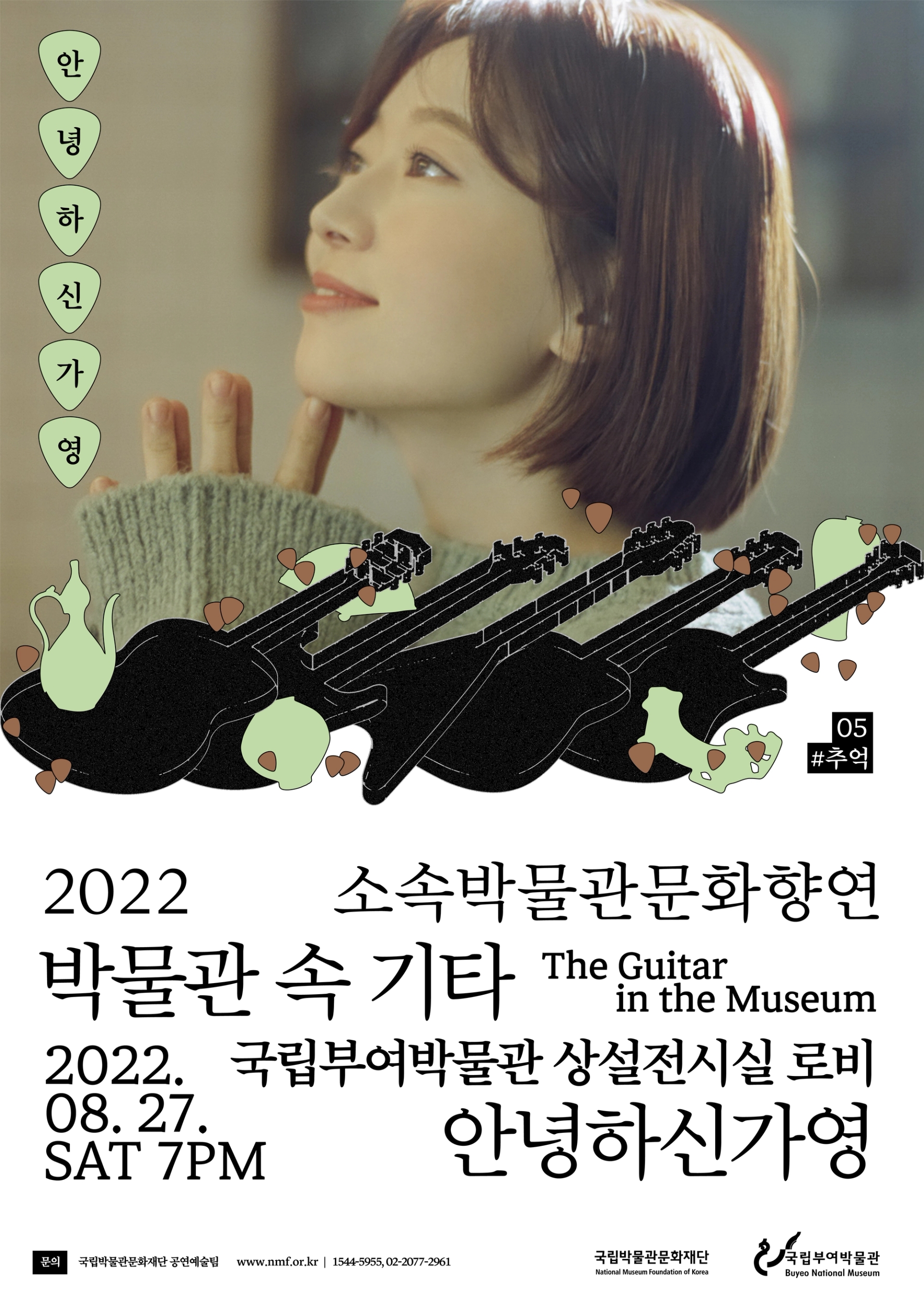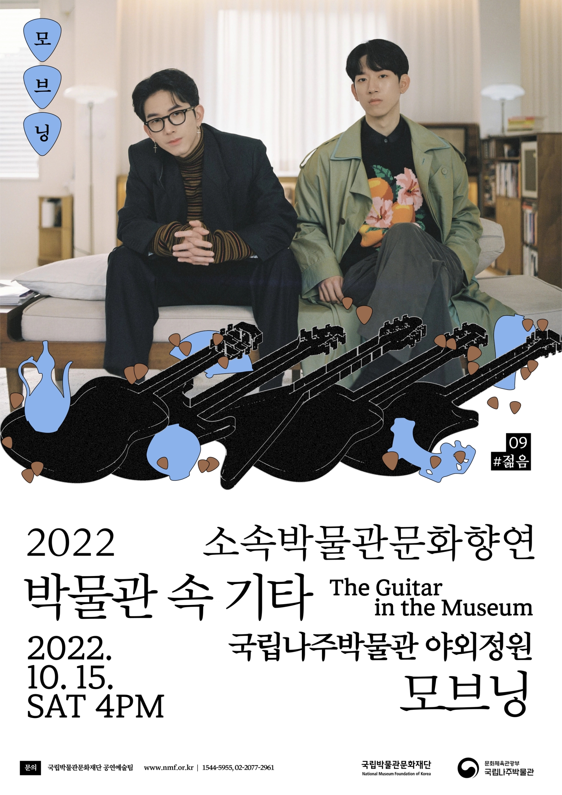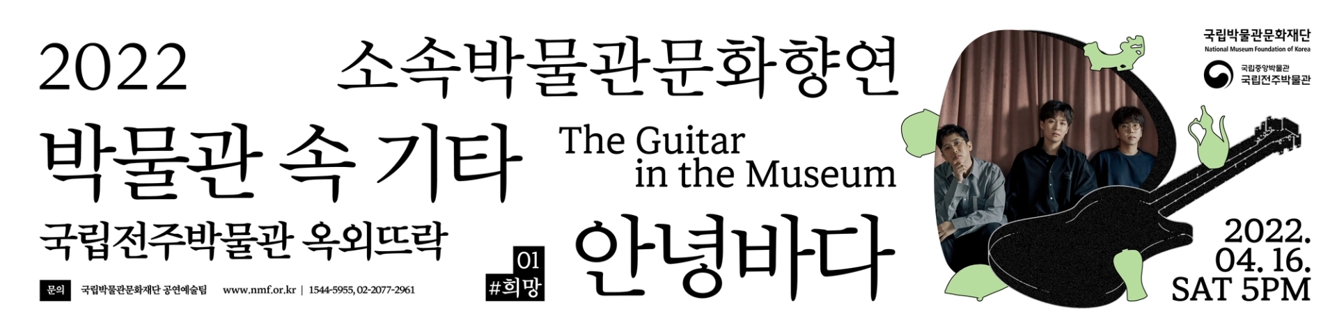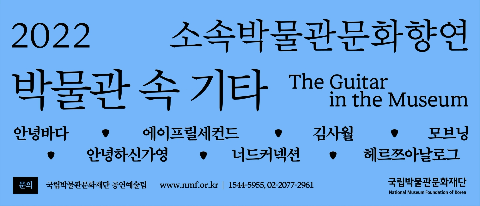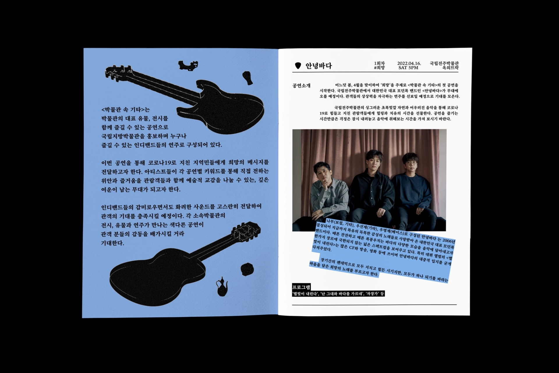 포스터안에는 각기 다른 모양의 개성있는 기타들이 층층이 쌓여있으며, 이는 <박물관 속 기타>에 참여하는 아티스트를 상징한다. 기타 주변에는 박물관을 상징하는 요소(유물)와 그 위로 흩날리는 꽃잎모양의 기타 피크가 둘러싸고있는데, 이를 통해 자유롭고 산뜻한 행사의 분위기를 상상할 수 있도록 하였다. 아티스트 정보와 일시 정보가 담긴 아홉개의 검정 박스를 악보위에 음표처럼 배치시키고, 타이틀과 서브텍스트 등을 상하단에 가지런히 배치하여 포스터의 전체적인 형태가 악보를 연상시키도록 하였다.