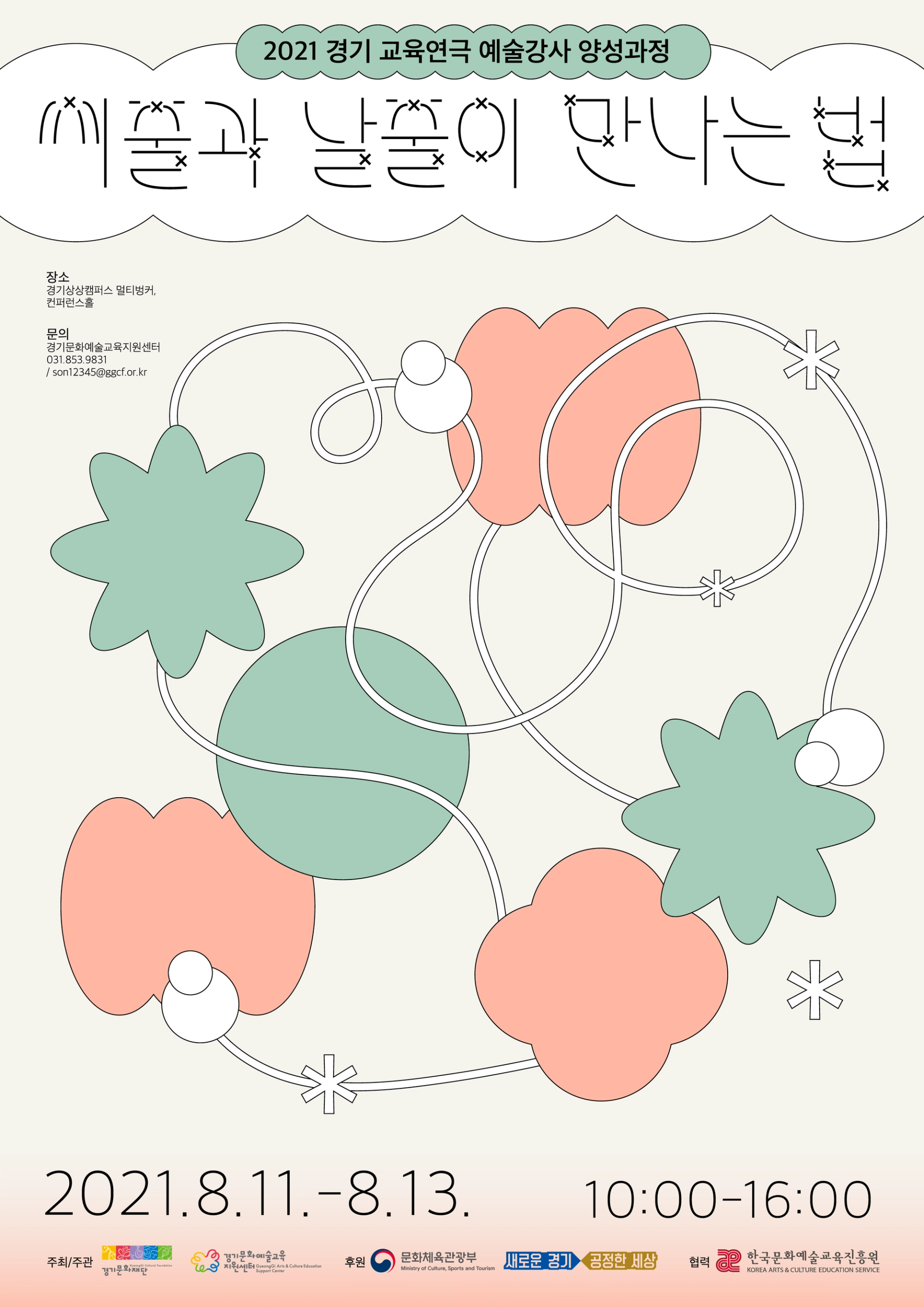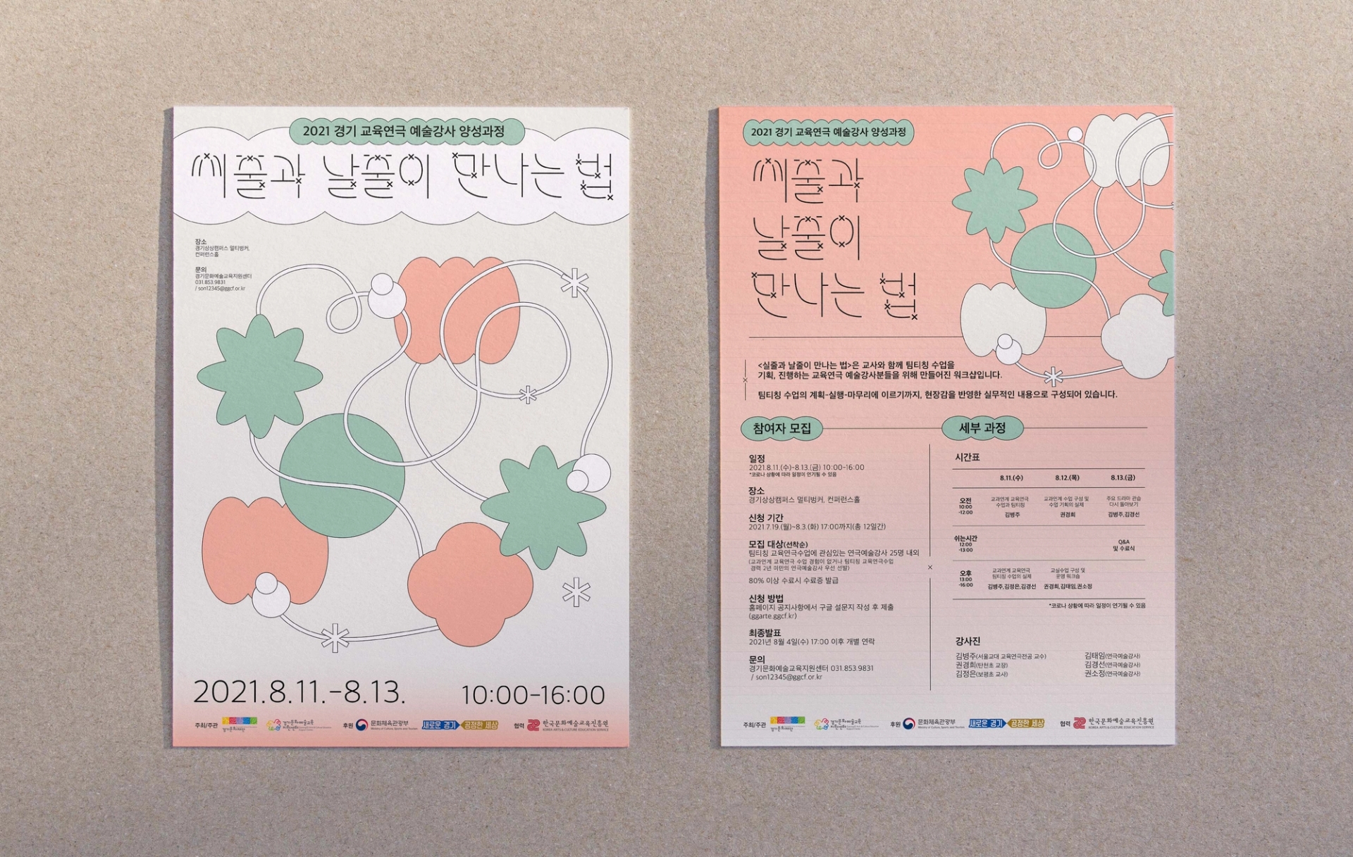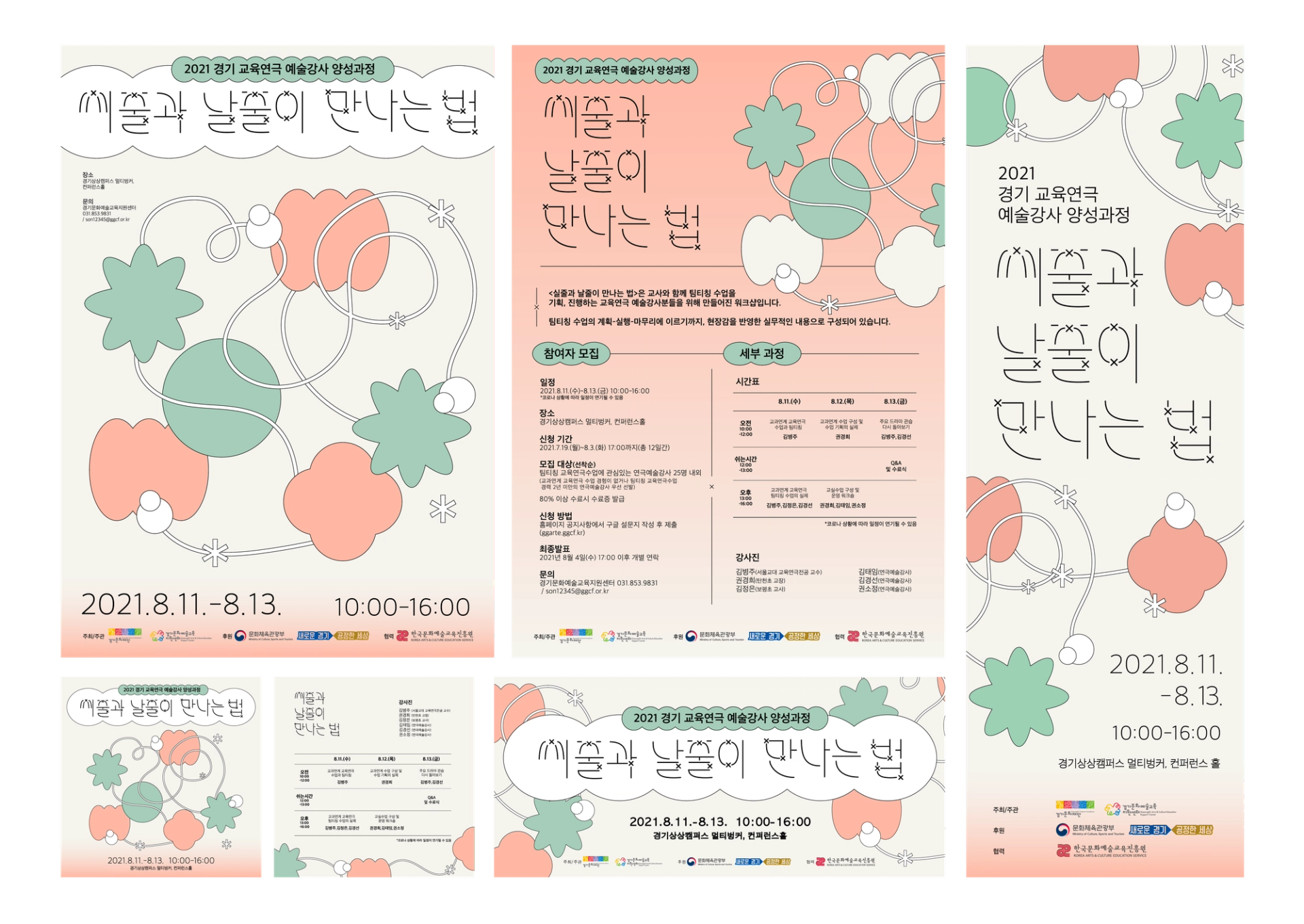 느슨하게 얽혀있는 실을 수단으로 다양한 도형이 교류하는듯한 모습의 그래픽으로 교육연극 예술강사들의 팀티칭 네트워크 프로그램인 ≪씨줄과 날줄이 만나는 법≫을 표현했다. 메인 타이포는 줄과 줄이 만나서 엮이는 부분을 x자의 형태로 구현하여 행사의 주제를 표현했다. typography: 김정은