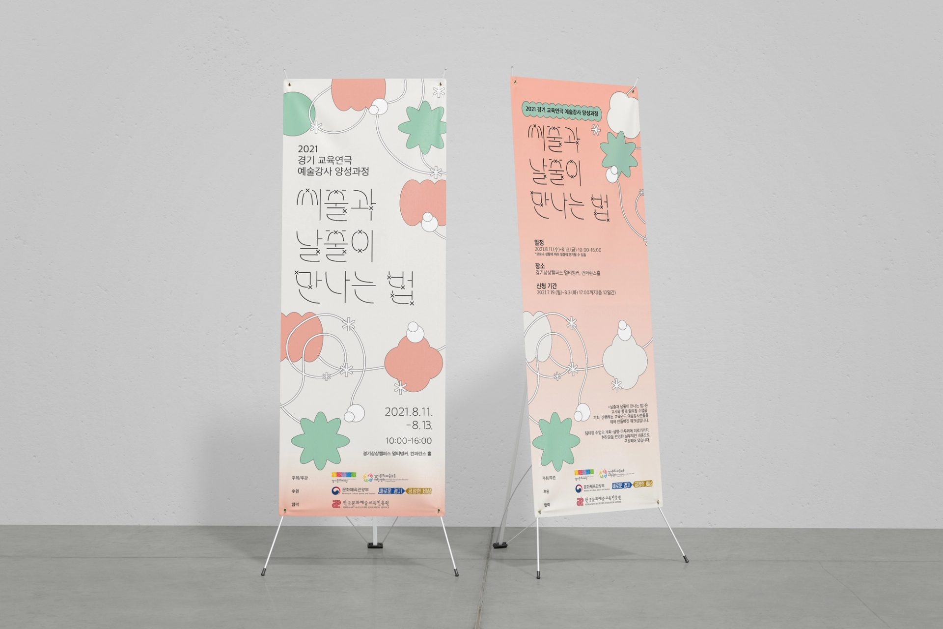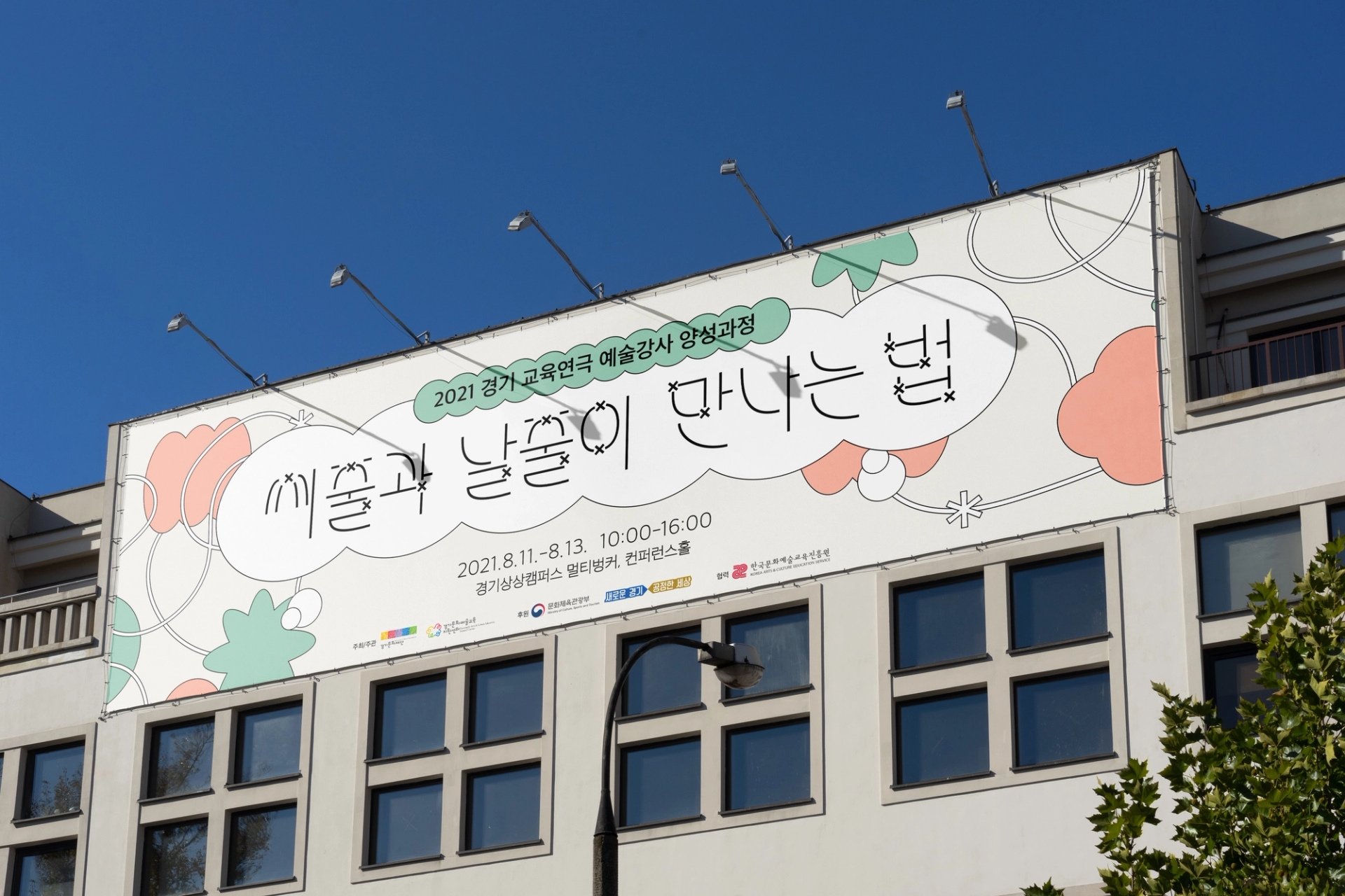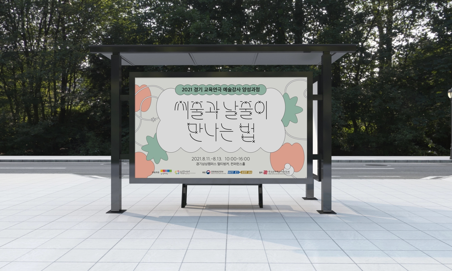 느슨하게 얽혀있는 실을 수단으로 다양한 도형이 교류하는듯한 모습의 그래픽으로 교육연극 예술강사들의 팀티칭 네트워크 프로그램인 ≪씨줄과 날줄이 만나는 법≫을 표현했다. 메인 타이포는 줄과 줄이 만나서 엮이는 부분을 x자의 형태로 구현하여 행사의 주제를 표현했다. typography: 김정은
