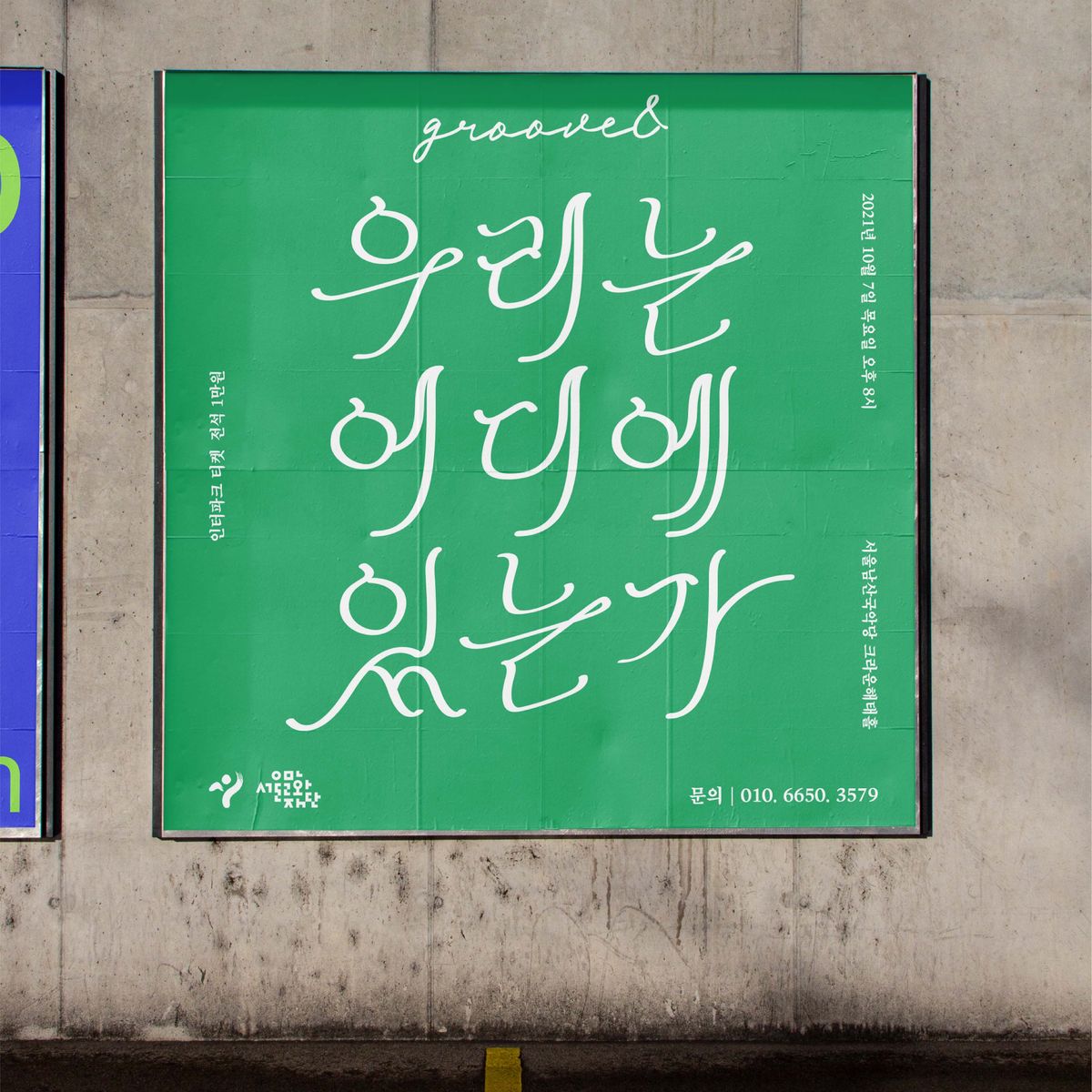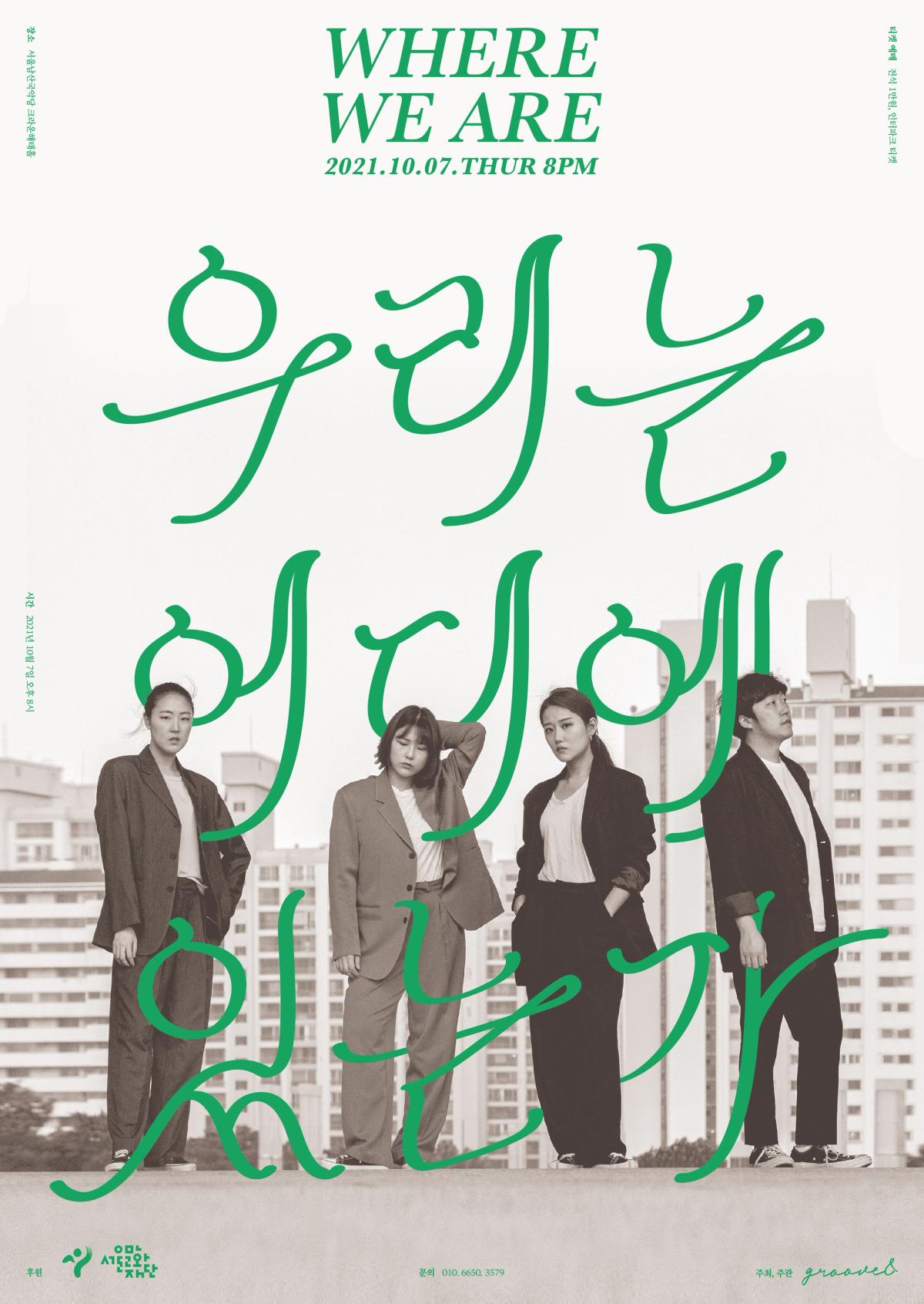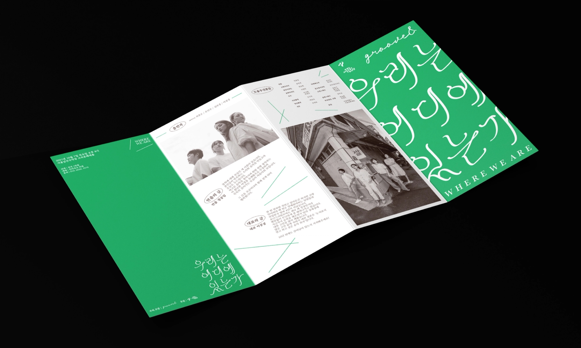 ≪우리는 어디에 있는가≫는 전통 음악을 기반으로 한 여성 타악 앙상블 팀 GROOVE&의 공연이다. 전통적인 획순을 현대적으로 재해석한 타이포그래피를 인물사이에 뒤섞어 놓아 혼란스럽고 불안한 청춘들의 모습을 시각적으로 표현하였다. 리플렛 곳곳에 위치한 직선 요소는 타악기의 음성, 청춘의 갈 곳 잃은 방향성과 혼란스러움을 상징한다. “우리는 어디에 있는가? 어디로 가야하는 것일까?” typography: 김정은