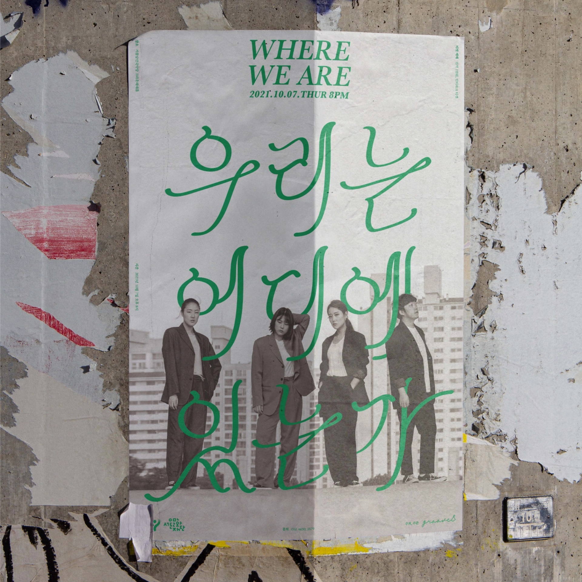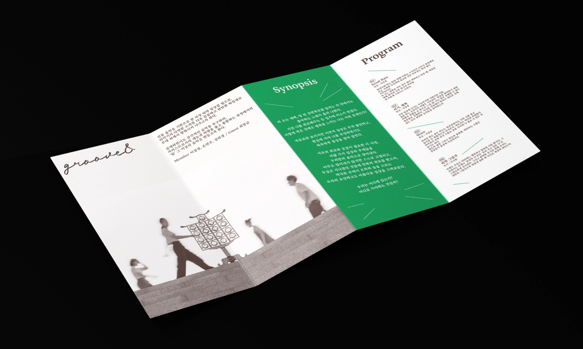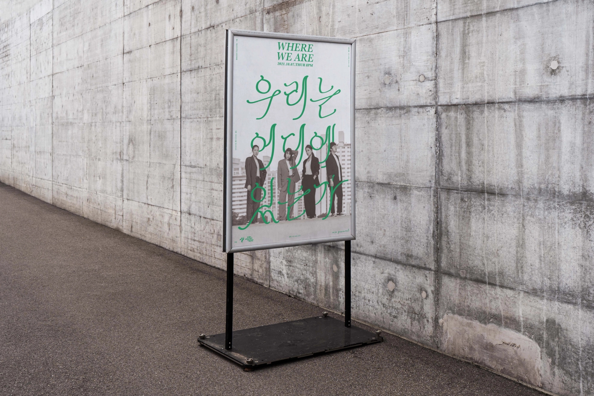 ≪우리는 어디에 있는가≫는 전통 음악을 기반으로 한 여성 타악 앙상블 팀 GROOVE&의 공연이다. 전통적인 획순을 현대적으로 재해석한 타이포그래피를 인물사이에 뒤섞어 놓아 혼란스럽고 불안한 청춘들의 모습을 시각적으로 표현하였다. 리플렛 곳곳에 위치한 직선 요소는 타악기의 음성, 청춘의 갈 곳 잃은 방향성과 혼란스러움을 상징한다. “우리는 어디에 있는가? 어디로 가야하는 것일까?” typography: 김정은