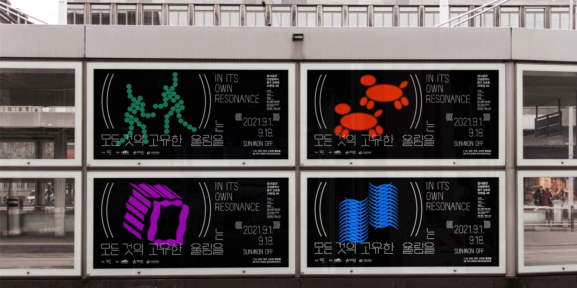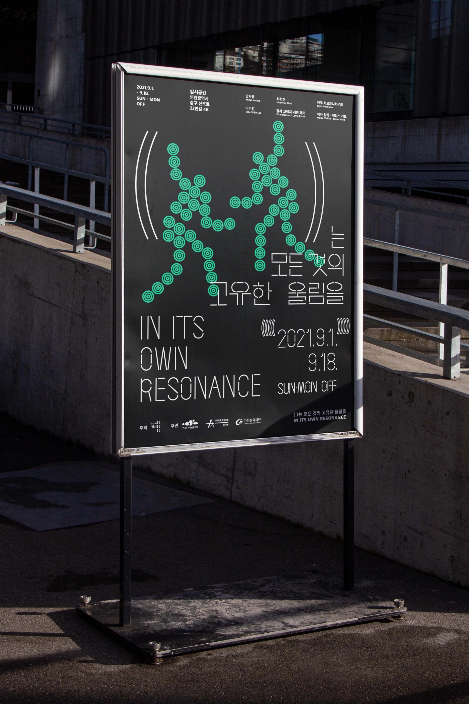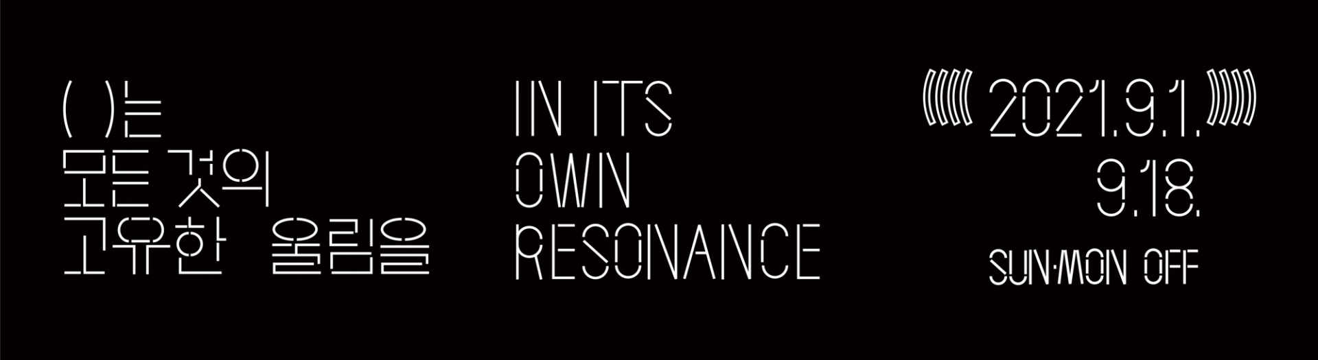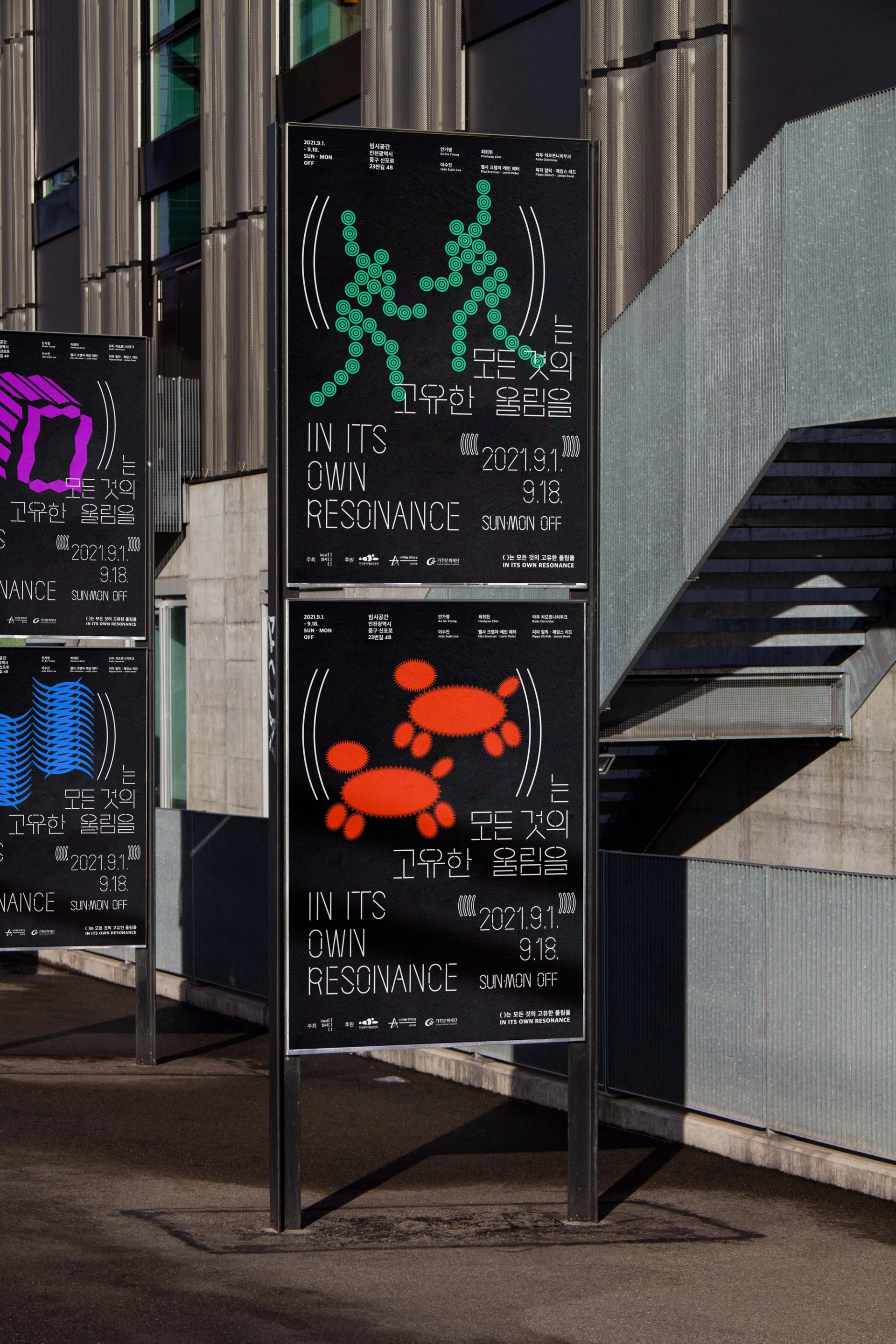 모든 사물이 전하는 울림은 공존한다는 전시의 의미를 전달하기 위해글씨 사이사이 빈 공간을 주어 공명을 표현한 타이포그래피를 중심으로 인간,동물,기계,균 을 표현한 일러스트를 배치하였다. 전시 타이틀의 괄호()를 디자인 요소로 활용하여 일러스트 주변에 반복적으로 배치하여 모든 주체가 고유한 진동을 가지고있음을 표현하였고, 일러스트 하나하나는 진동과, 떨림, 리듬감을 느낄 수 있는 요소로 이루어져있다.