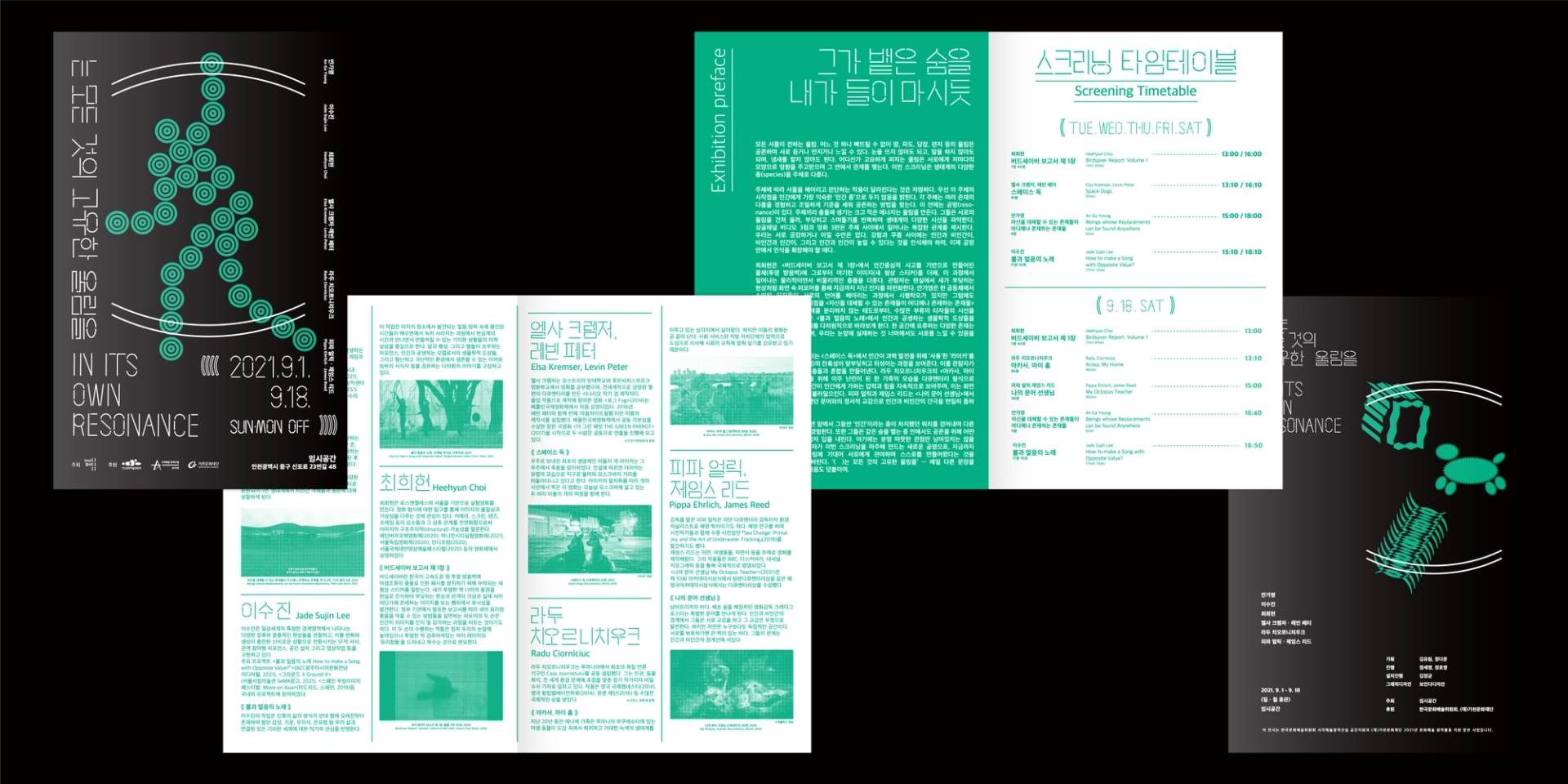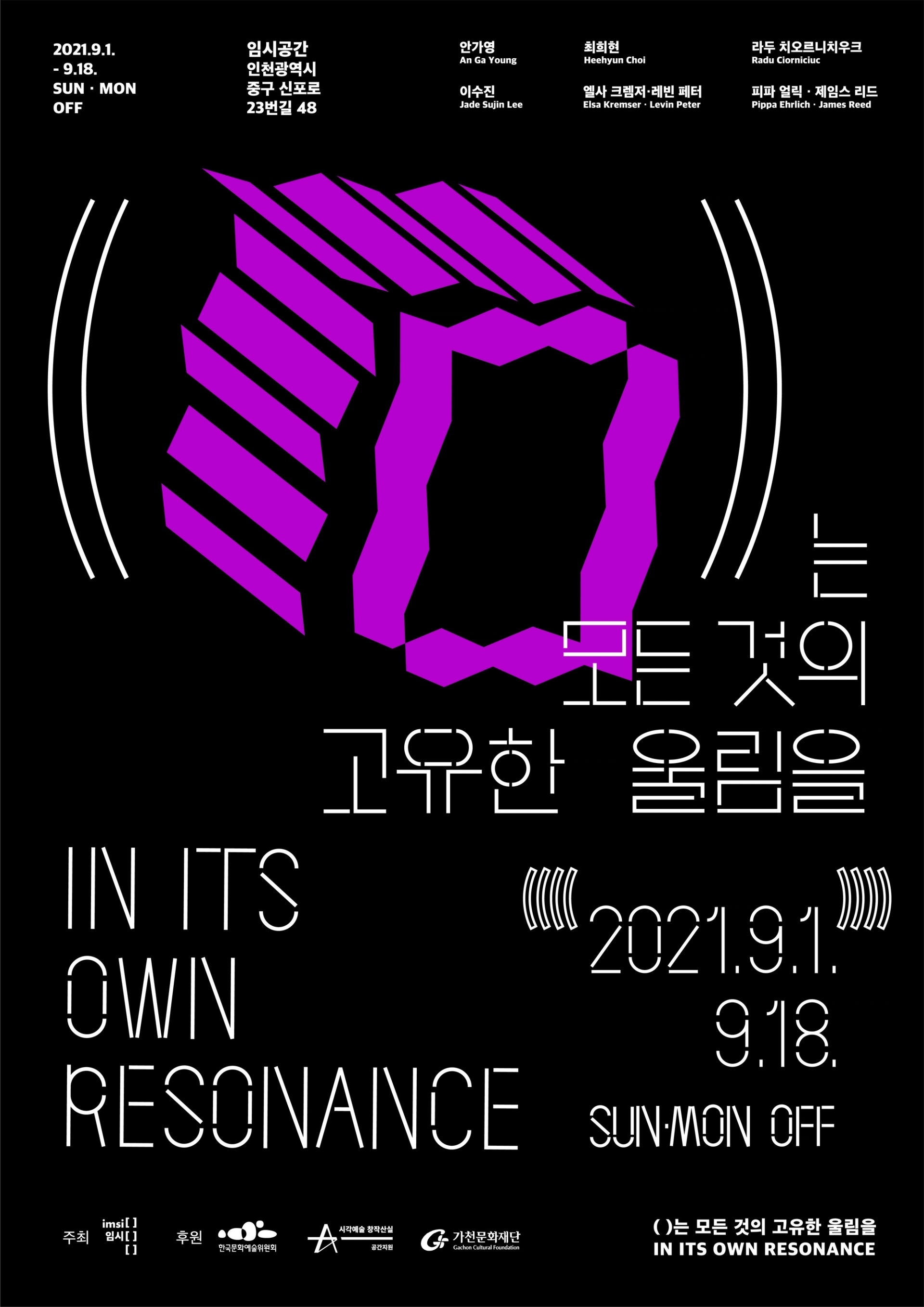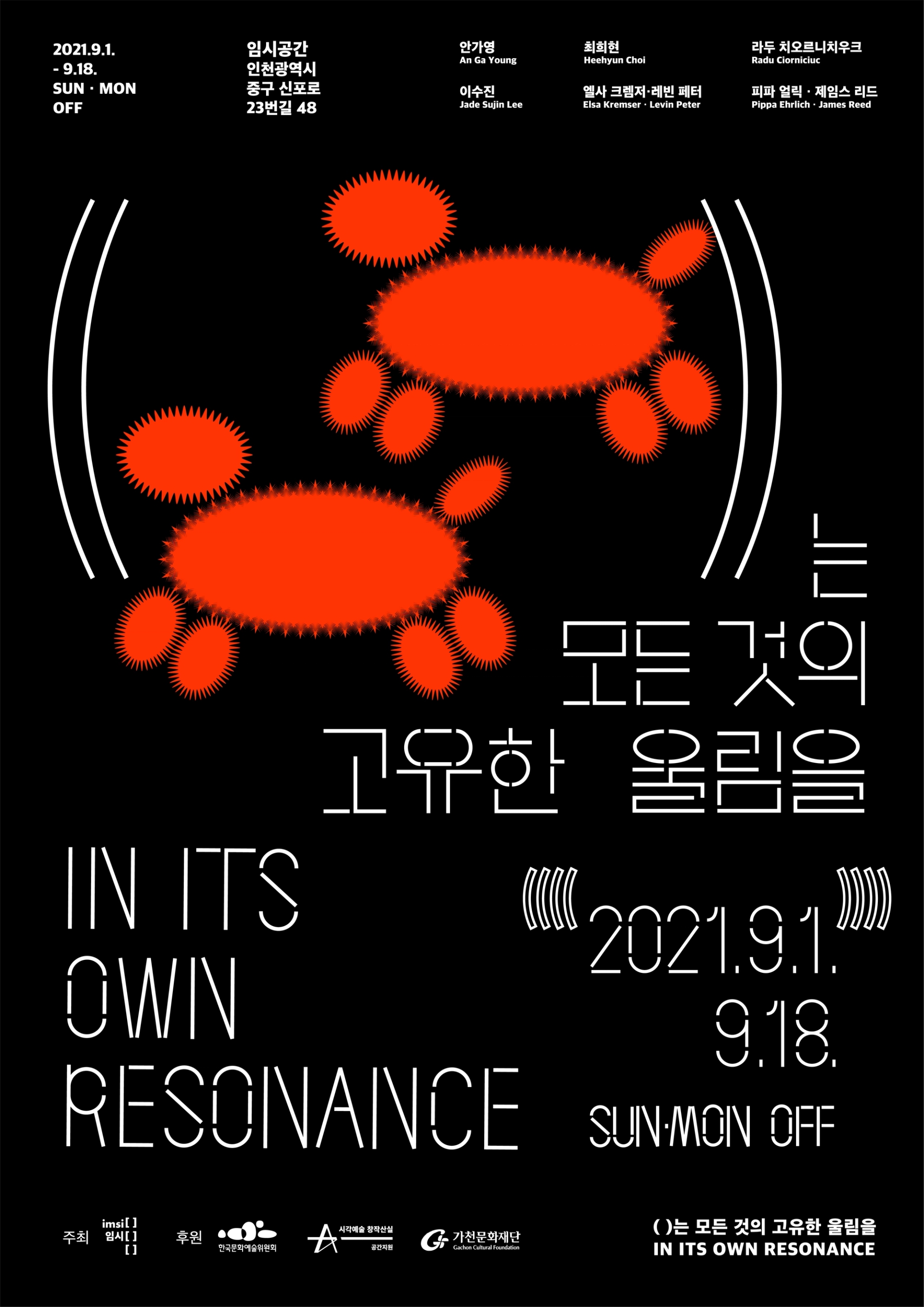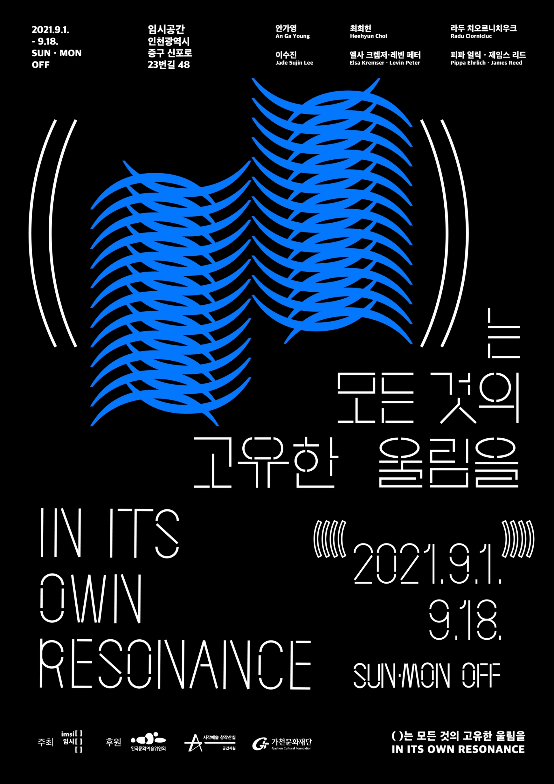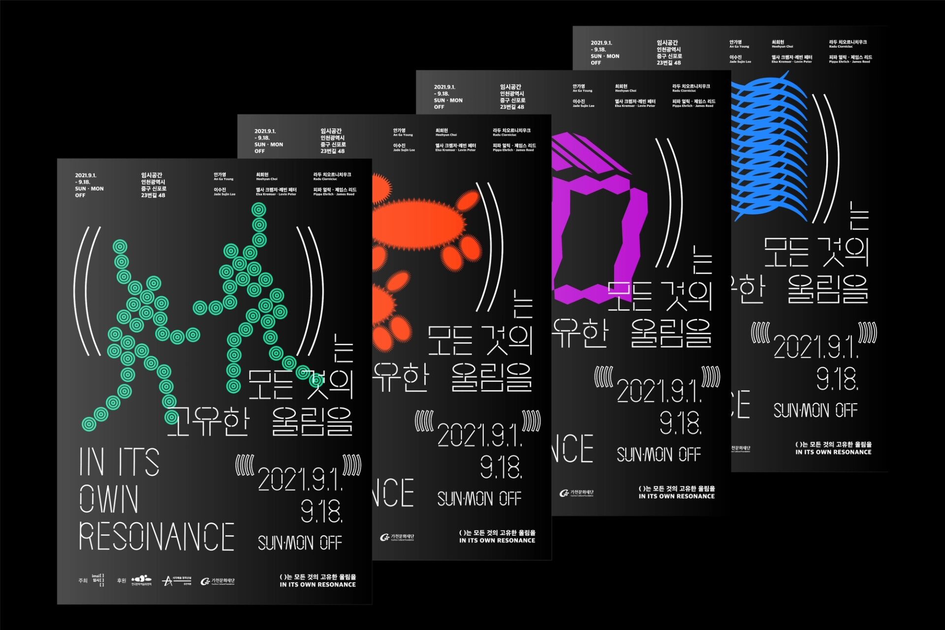 모든 사물이 전하는 울림은 공존한다는 전시의 의미를 전달하기 위해글씨 사이사이 빈 공간을 주어 공명을 표현한 타이포그래피를 중심으로 인간,동물,기계,균 을 표현한 일러스트를 배치하였다. 전시 타이틀의 괄호()를 디자인 요소로 활용하여 일러스트 주변에 반복적으로 배치하여 모든 주체가 고유한 진동을 가지고있음을 표현하였고, 일러스트 하나하나는 진동과, 떨림, 리듬감을 느낄 수 있는 요소로 이루어져있다.
