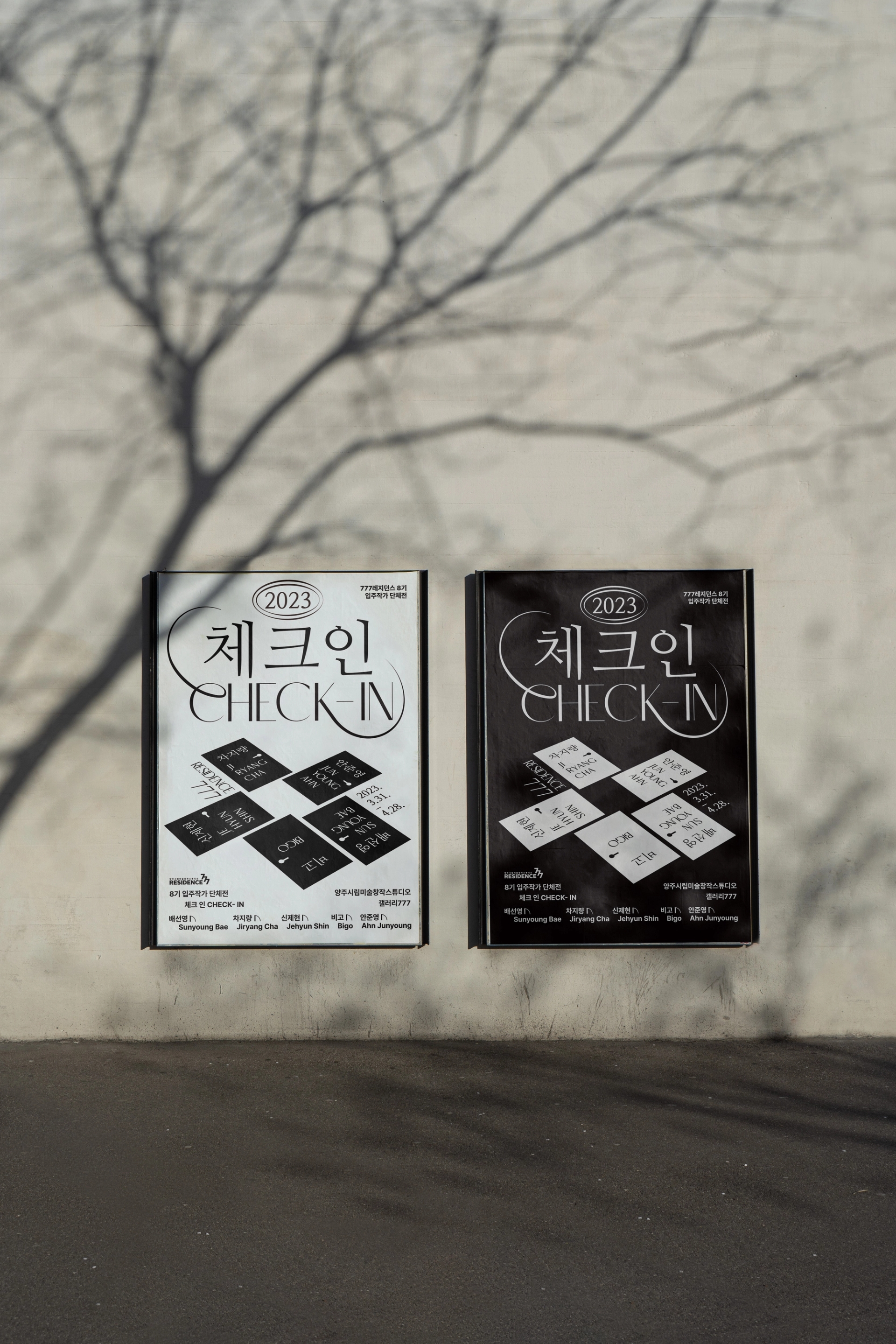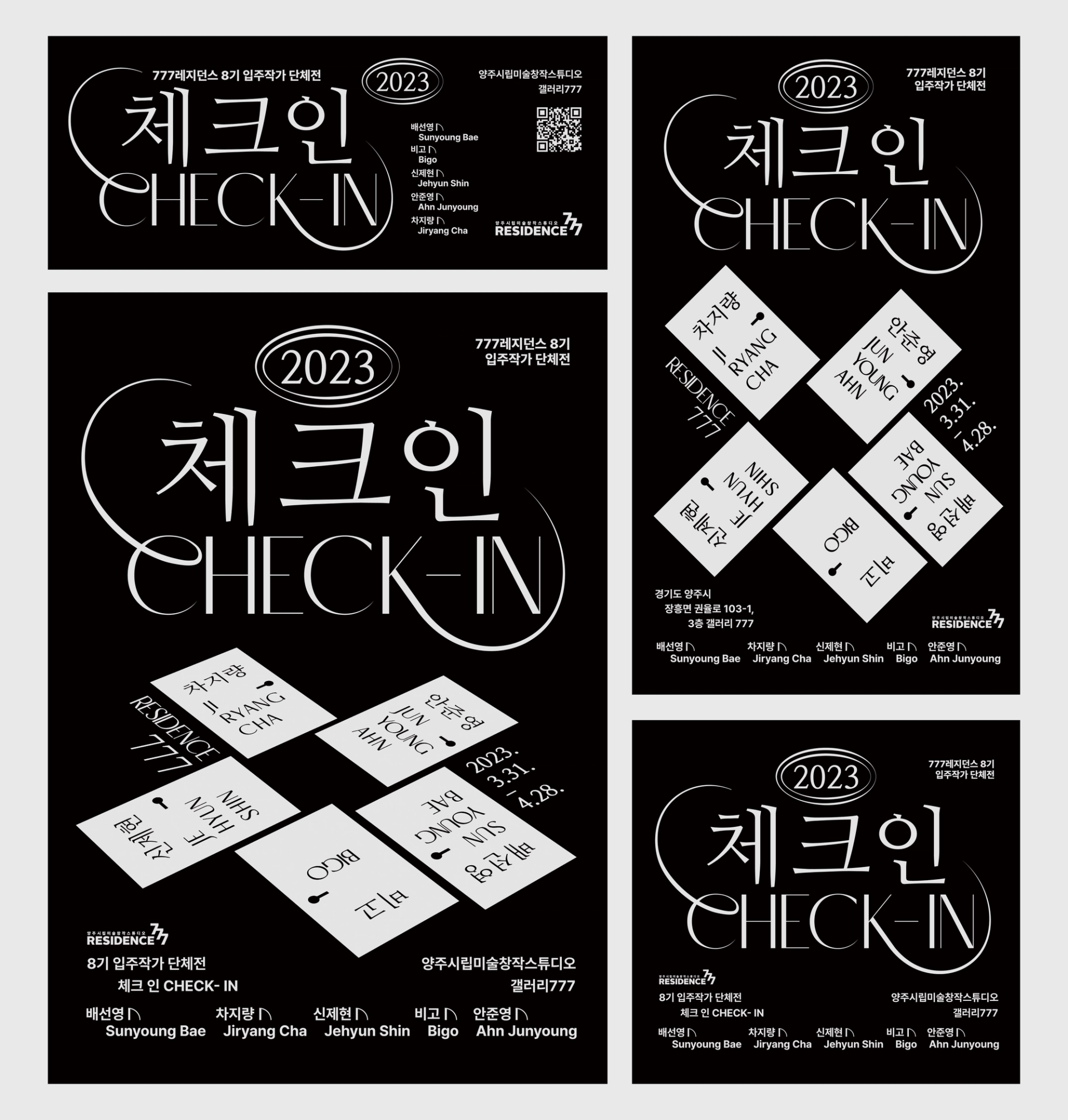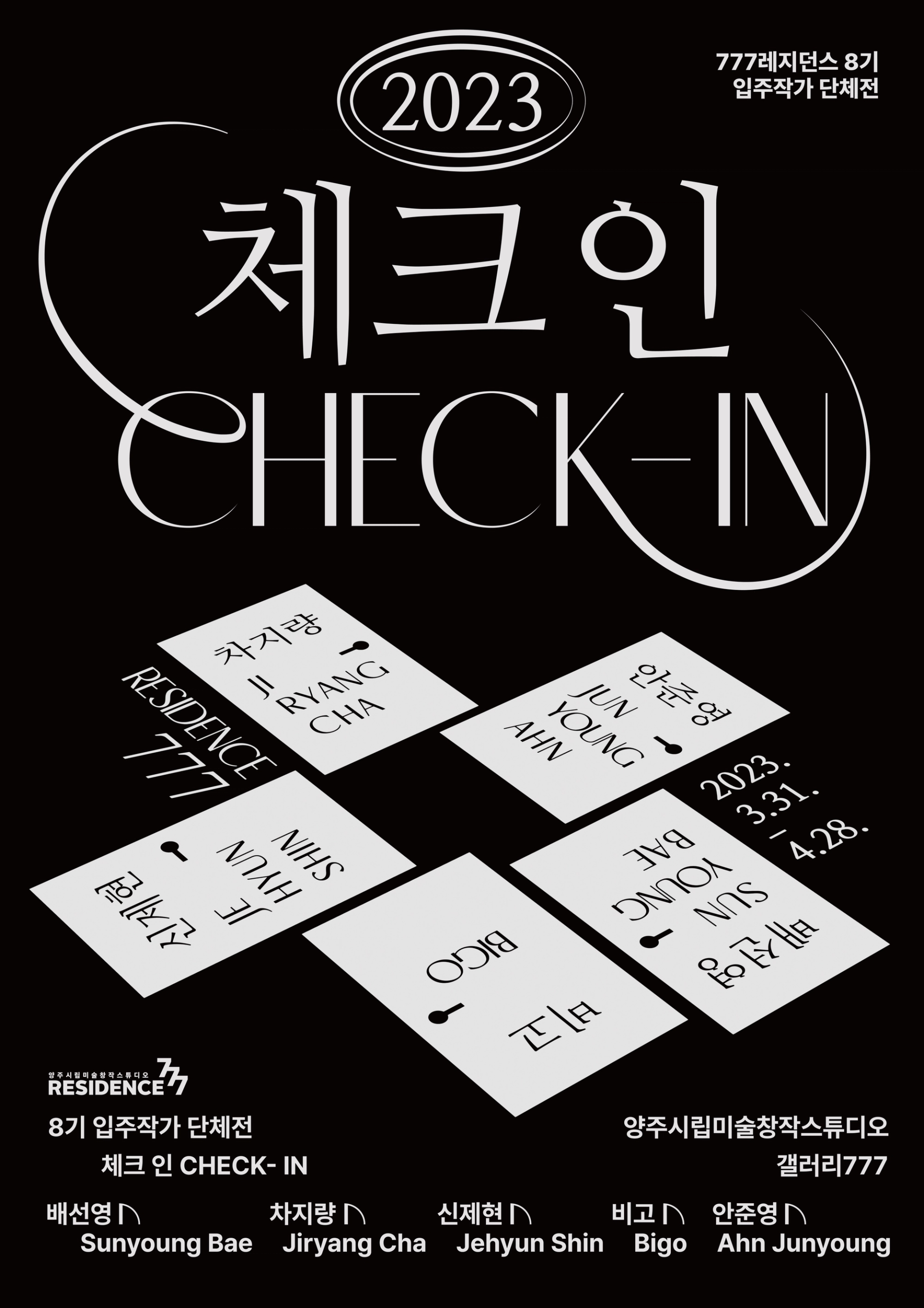<체크인> 포스터의 중심에 자리잡은 그래픽은 “다섯 명의 작가의 세계로 체크인할 수 있는 문”이다. 모텔 건물을 리모델링하여 전시장으로 활용하고있는 공간적 특이성과 <체크인>이라는 전시명을 직관적으로 표현하고자 하였다. 관람객으로 하여금 작가들의 이름이 적혀있는 문고리를 열어 작가 개개인의 세계관으로 체크인하는 듯한 설렘을 느끼게하고, 문 너머로 어떠한 세상이 펼쳐질지 궁금증을 느끼게 디자인하였다. 메인 타이틀 ‘Check-in’ 타이포그라피는 각각의 개성 있는 아티스트들을 연결시켜주는 ‘777레지던스’를 표현하기 위해 선을 연장해서 형태를 변형하였고, 동시에 구 모텔건물이라는 장소 특유의 장식적이고 고전적인 느낌을 연상시키도록 하였다. 매해 777레지던스에 입주한 작가들을 소개하는 연례적인 행사이니만큼, 2023이라는 숫자를 모텔의 방 번호 호실판처럼 표현하였다.