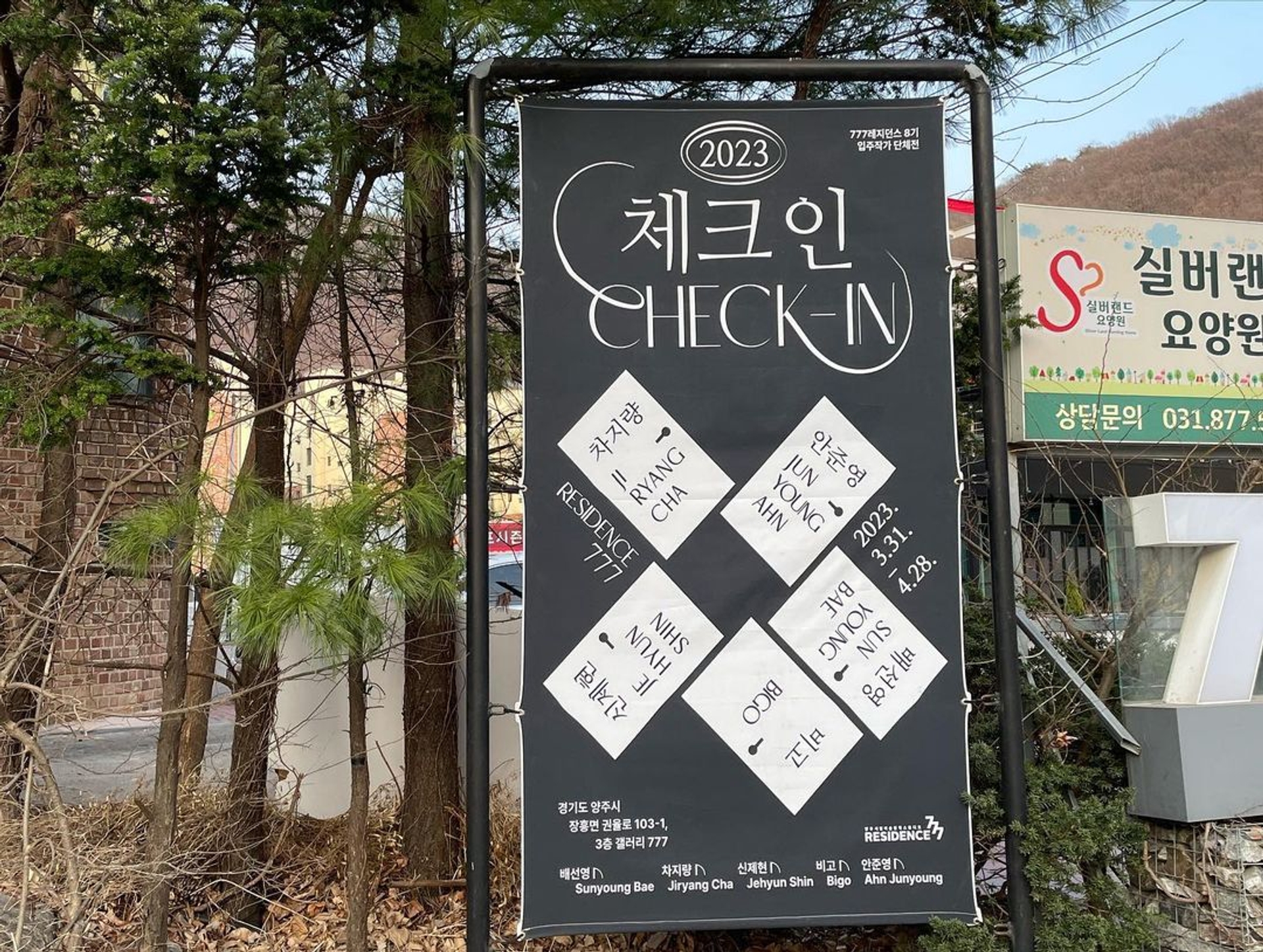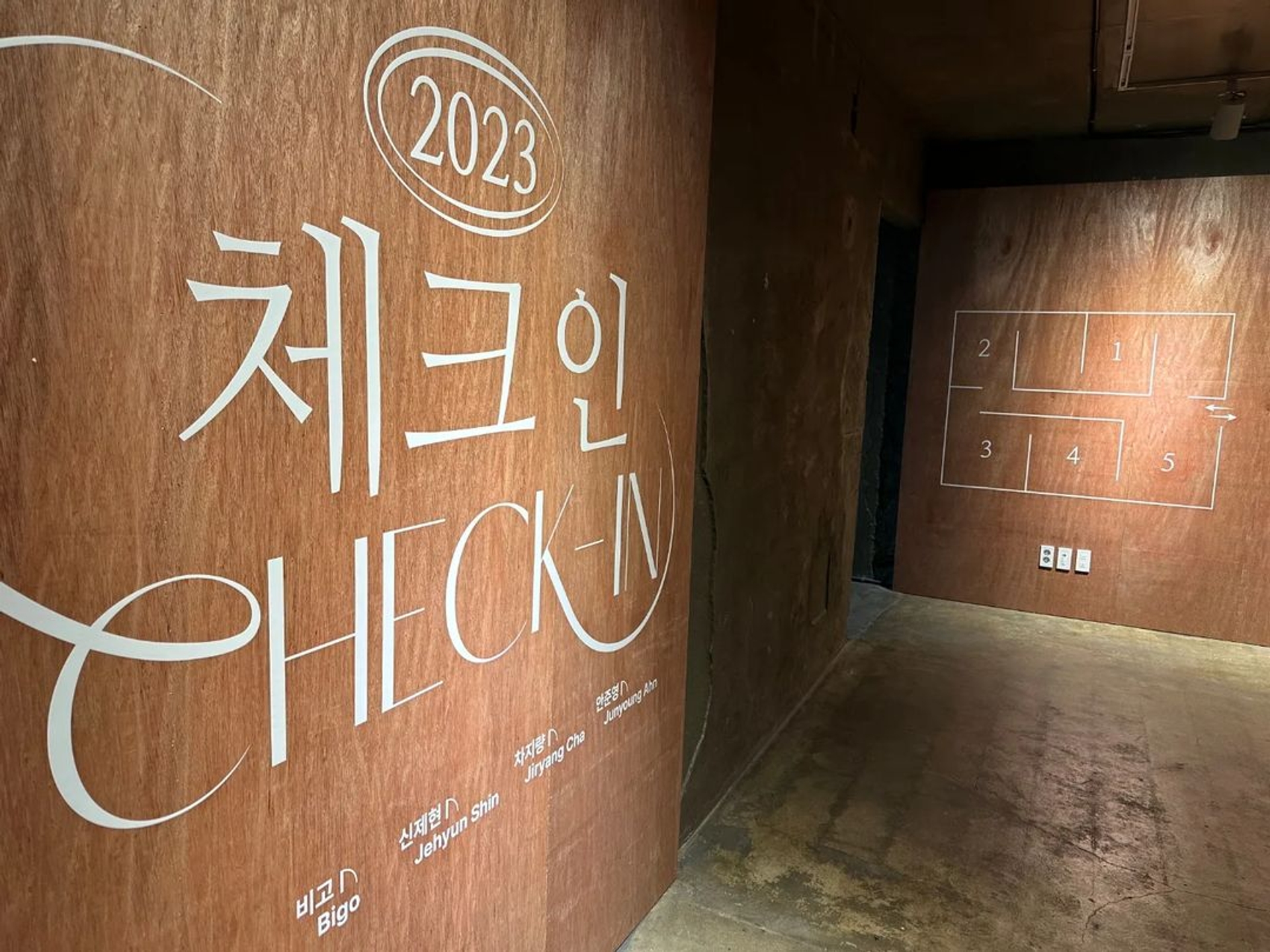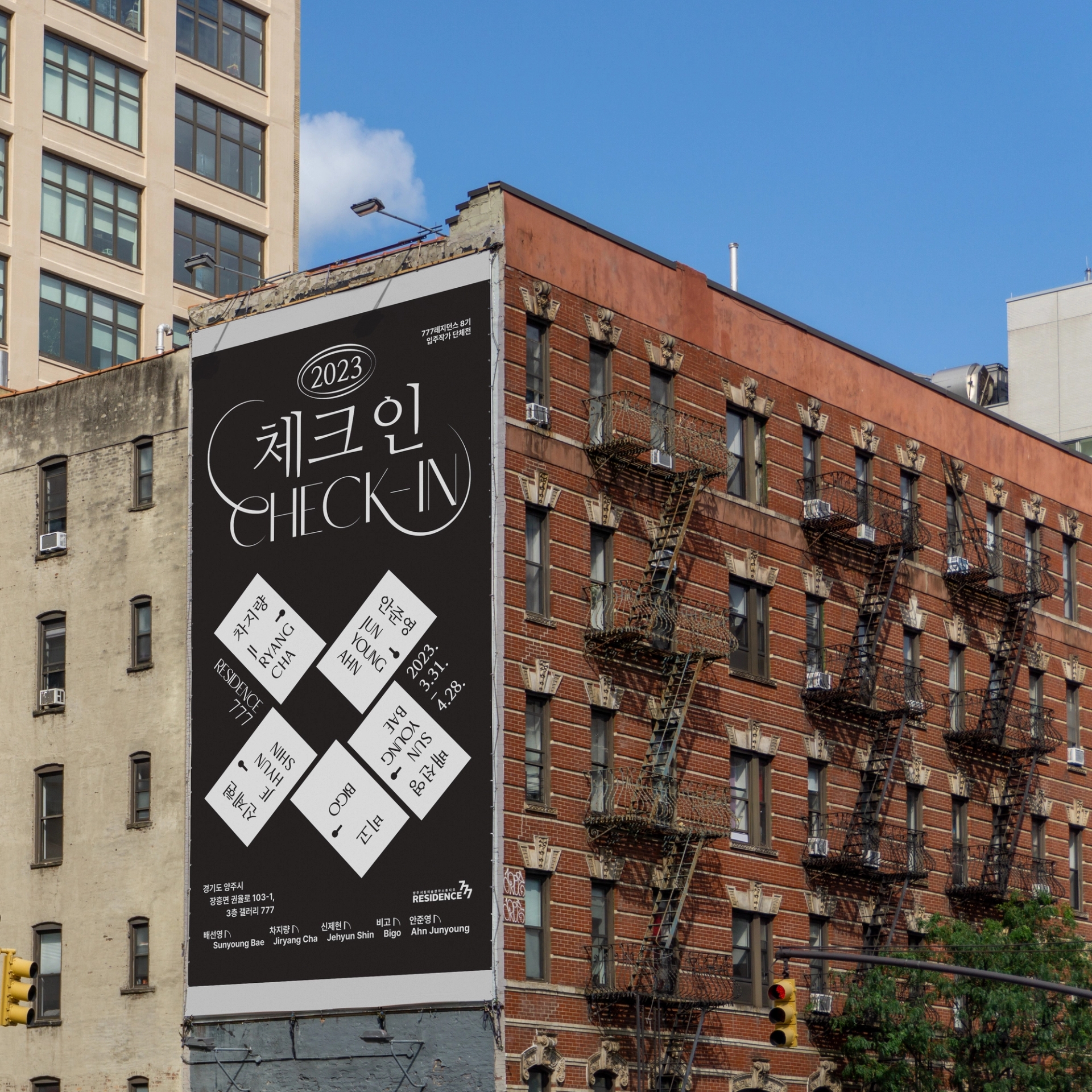 <체크인> 포스터의 중심에 자리잡은 그래픽은 “다섯 명의 작가의 세계로 체크인할 수 있는 문”이다. 모텔 건물을 리모델링하여 전시장으로 활용하고있는 공간적 특이성과 <체크인>이라는 전시명을 직관적으로 표현하고자 하였다. 관람객으로 하여금 작가들의 이름이 적혀있는 문고리를 열어 작가 개개인의 세계관으로 체크인하는 듯한 설렘을 느끼게하고, 문 너머로 어떠한 세상이 펼쳐질지 궁금증을 느끼게 디자인하였다. 메인 타이틀 ‘Check-in’ 타이포그라피는 각각의 개성 있는 아티스트들을 연결시켜주는 ‘777레지던스’를 표현하기 위해 선을 연장해서 형태를 변형하였고, 동시에 구 모텔건물이라는 장소 특유의 장식적이고 고전적인 느낌을 연상시키도록 하였다. 매해 777레지던스에 입주한 작가들을 소개하는 연례적인 행사이니만큼, 2023이라는 숫자를 모텔의 방 번호 호실판처럼 표현하였다.