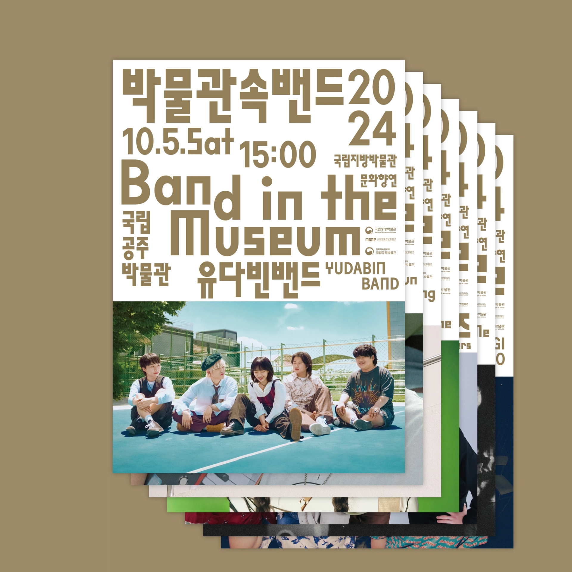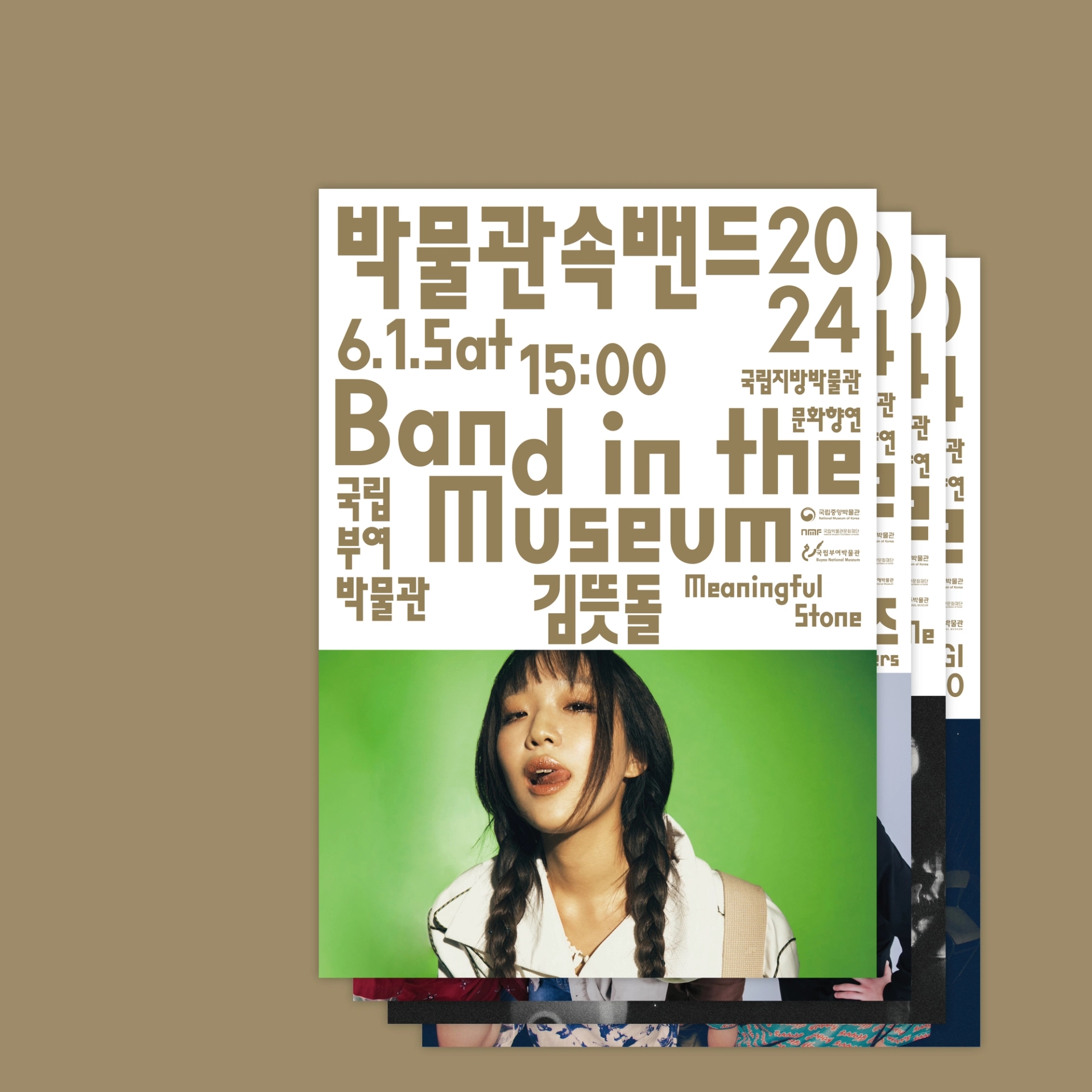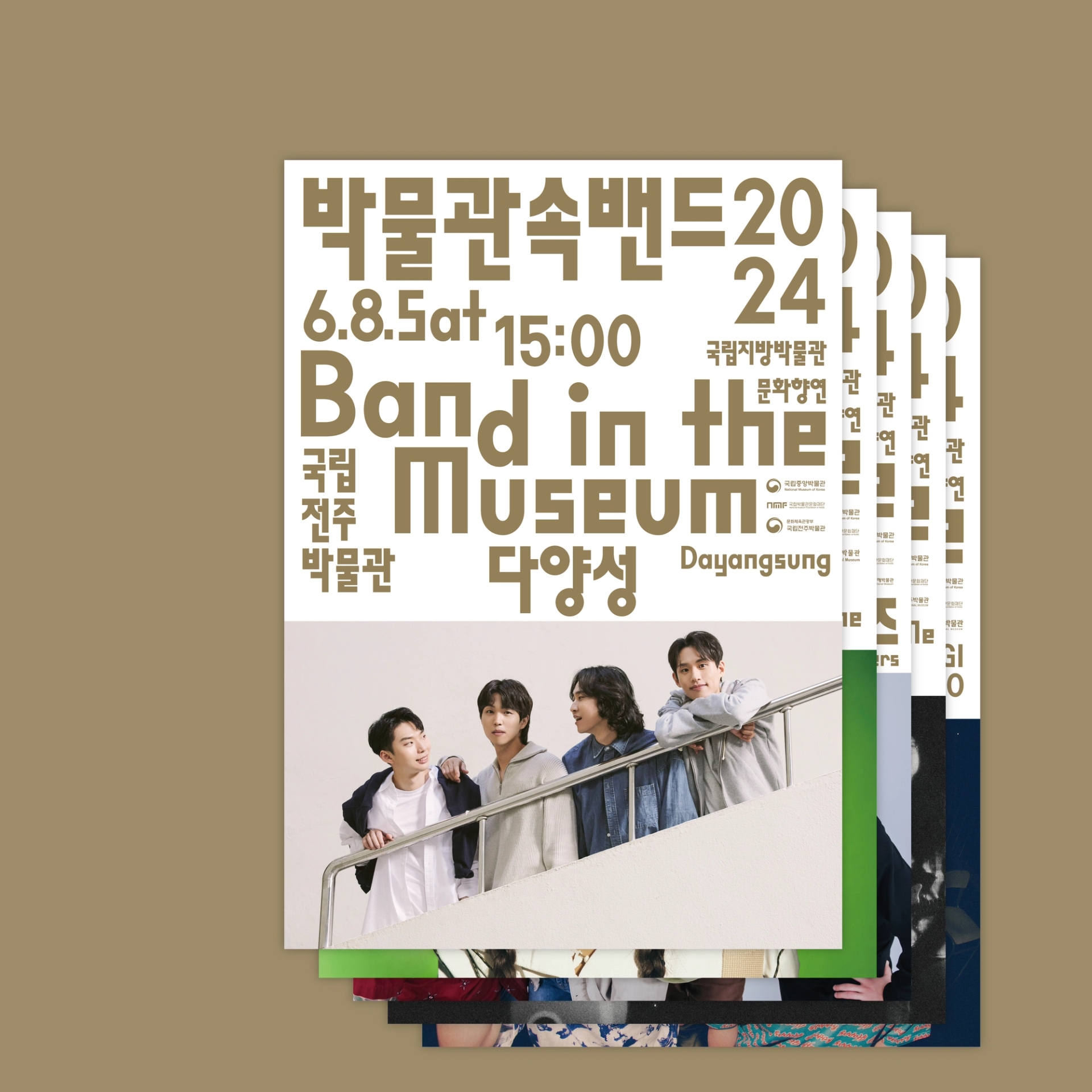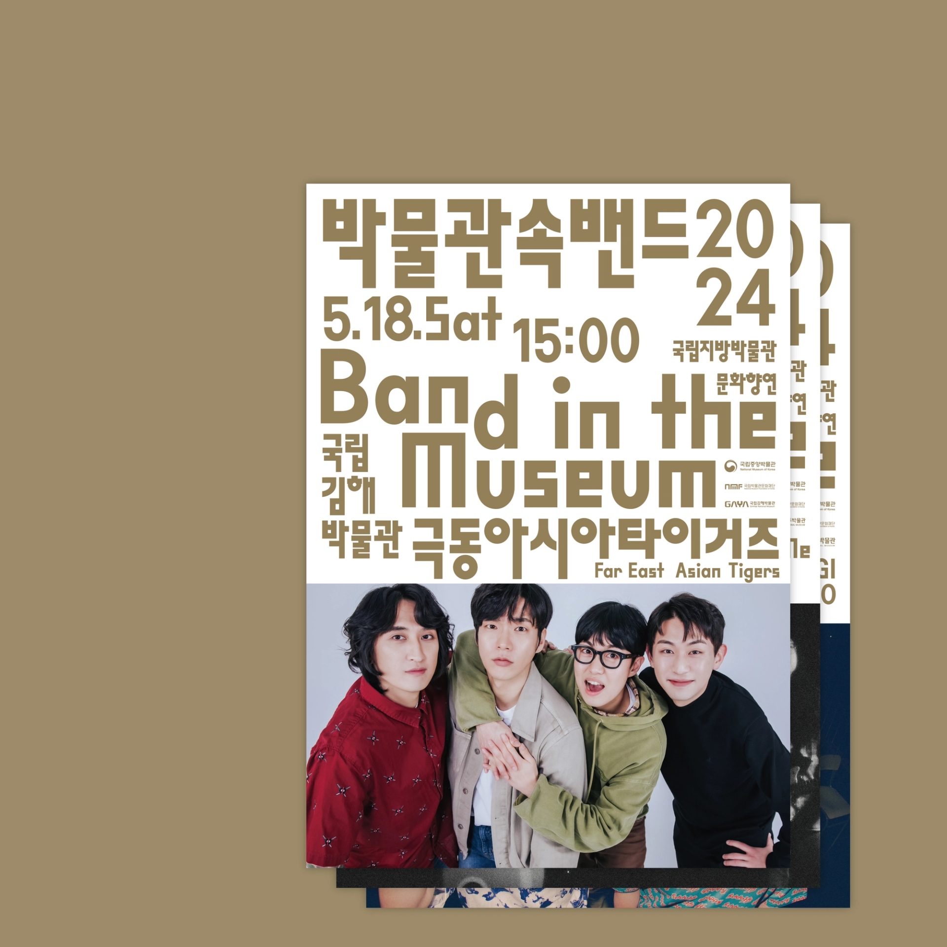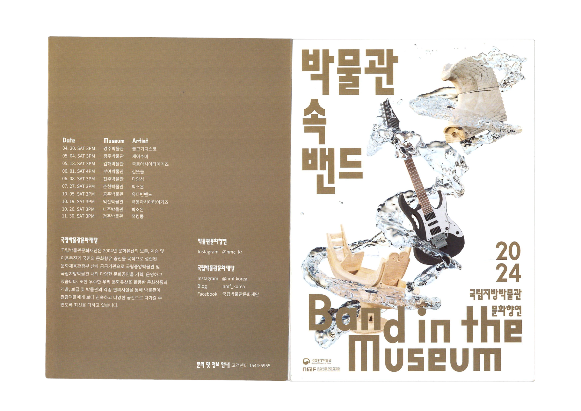 국립지방박물관 문화향연 <박물관 속 기타>의 그래픽디자인을 진행했습니다. 🎸 국립지방박물관의 주요 관람객층인 어린이, 가족, 노년층을 넘어, 청년들의 공연관람과 박물관 방문을 유도하기 위해 국립박물관을 직관적으로 떠오르게 만드는 이미지인 유물을 국립박물관의 3D 데이터 소장품을 활용하여 제작하고, 밴드를 직관적으로 표현하는 상징으로 ‘기타’를 선정해 포스터의 키비주얼로 제작하였습니다. 국립박물관(소장품)과 밴드(기타)를 하나로 묶어주는 존재인 ‘관객’과 ‘국립박물관문화재단’을 설명하기 위한 상징으로 파도치는 물결을 함께 배치하였습니다. 국립지방박물관 안에서 전시부터 공연까지 즐길 수 있는 <박물관속밴드>의 취지를 유물부터 기타로, 기타에서 유물로 이어지는 물결의 흐름으로 표현했습니다. 메인 타이틀에 사용된 타이포그래피는 기존 관람객인 노년층에게 친숙함을 주고, 신규 관람객인 청년층에게 새로움을 줄 수 있는 복고풍 폰트를 활용해 리듬감있게 배치하였습니다. 한글의 받침의 유무, 영문의 기둥의 유무에 따라 높이의 리듬감이 느껴지는 형태는 밴드 음악의 자유로움을 느끼게 해주며, 퍼즐처럼 결합되어 배치된 텍스트들은 안정된 레이아웃을 만들어 주어 국립박물관의 편안하고 견고한 느낌을 연상시키게 합니다. 공연일시와 장소, 아티스트에 대한 정보는 가장 상단부터 시계 반대방향으로 메인 그래픽을 감싸고 있습니다. 공연 순서대로 넘버링된 숫자는 기타피크의 모양을 본따 제작되었으며, 동시에 위치를 표시하는 기호처럼 보여져 전국에서 펼쳐지는 문화행사임을 암시합니다. 이러한 자유롭고 생동감있는 배치는 다소 딱딱하고 경직된 공간으로 인식되어있던 국립지방박물관에 대한 선입견을 깨주는 역할을 수행합니다.