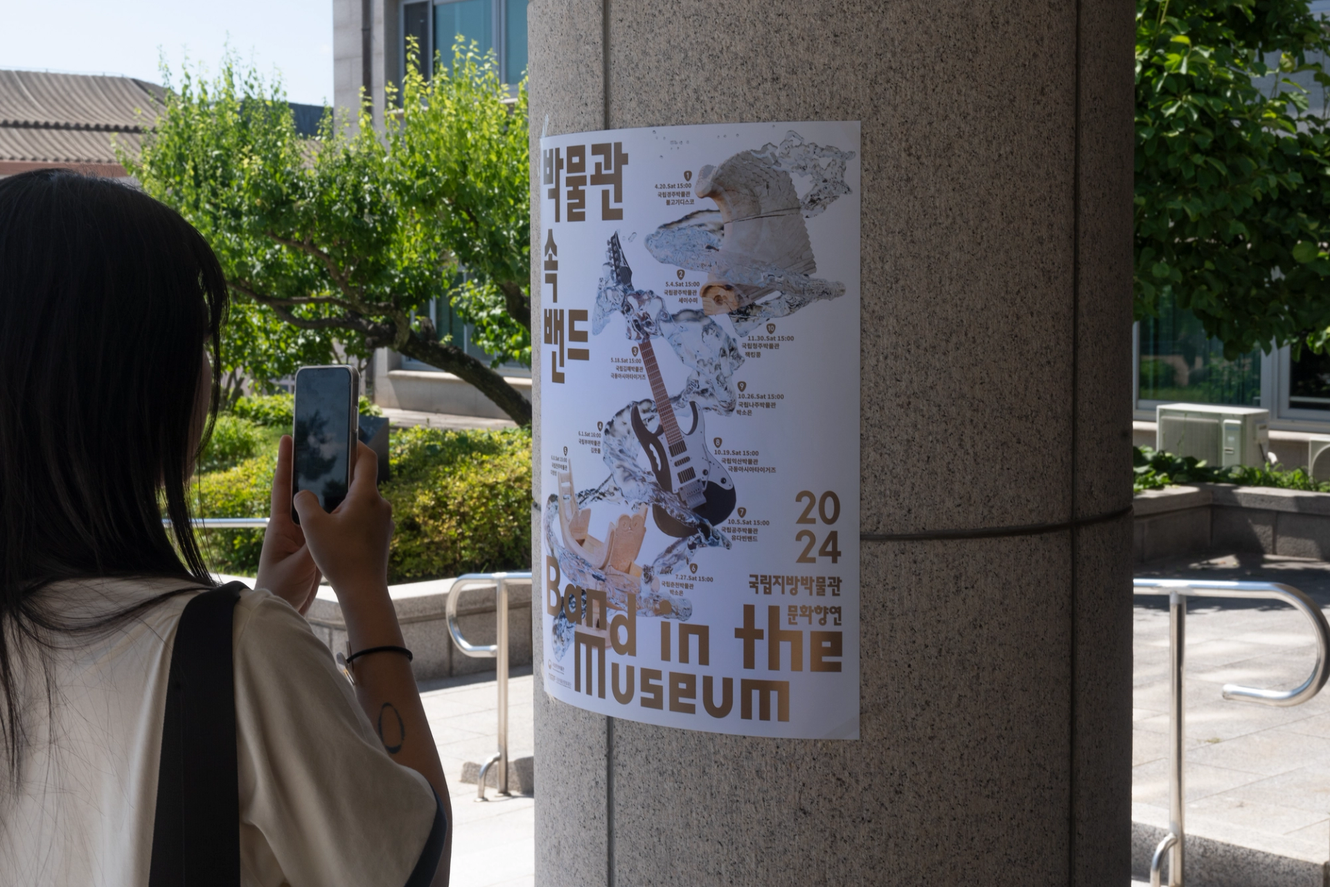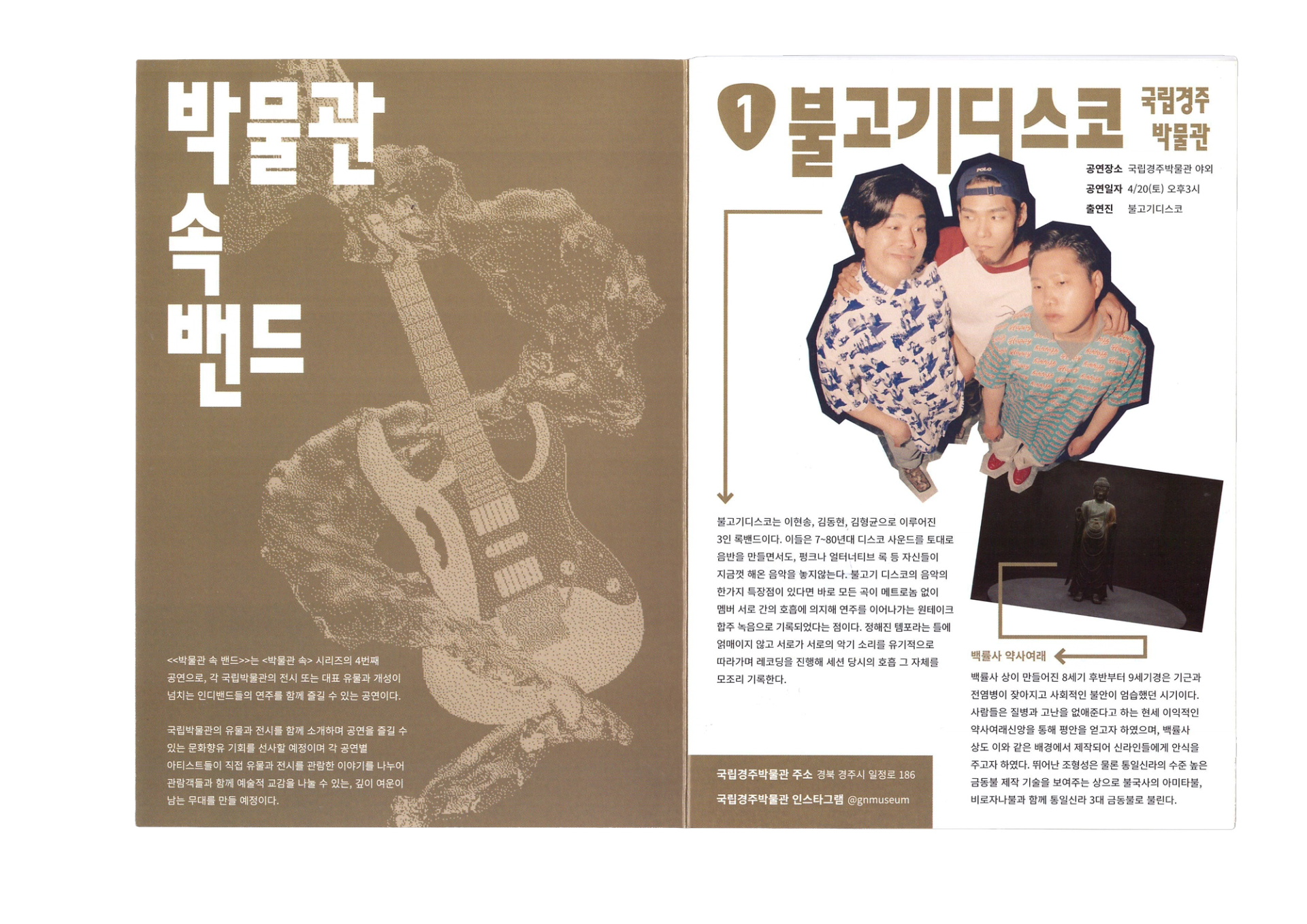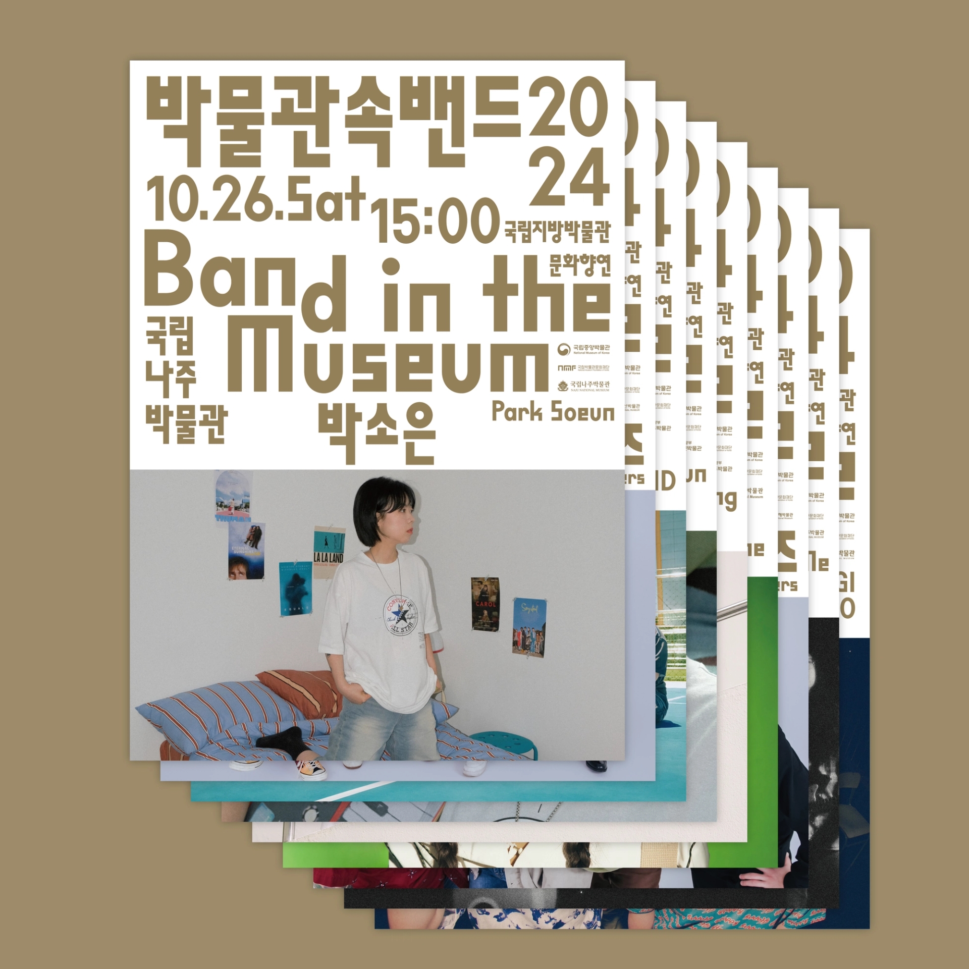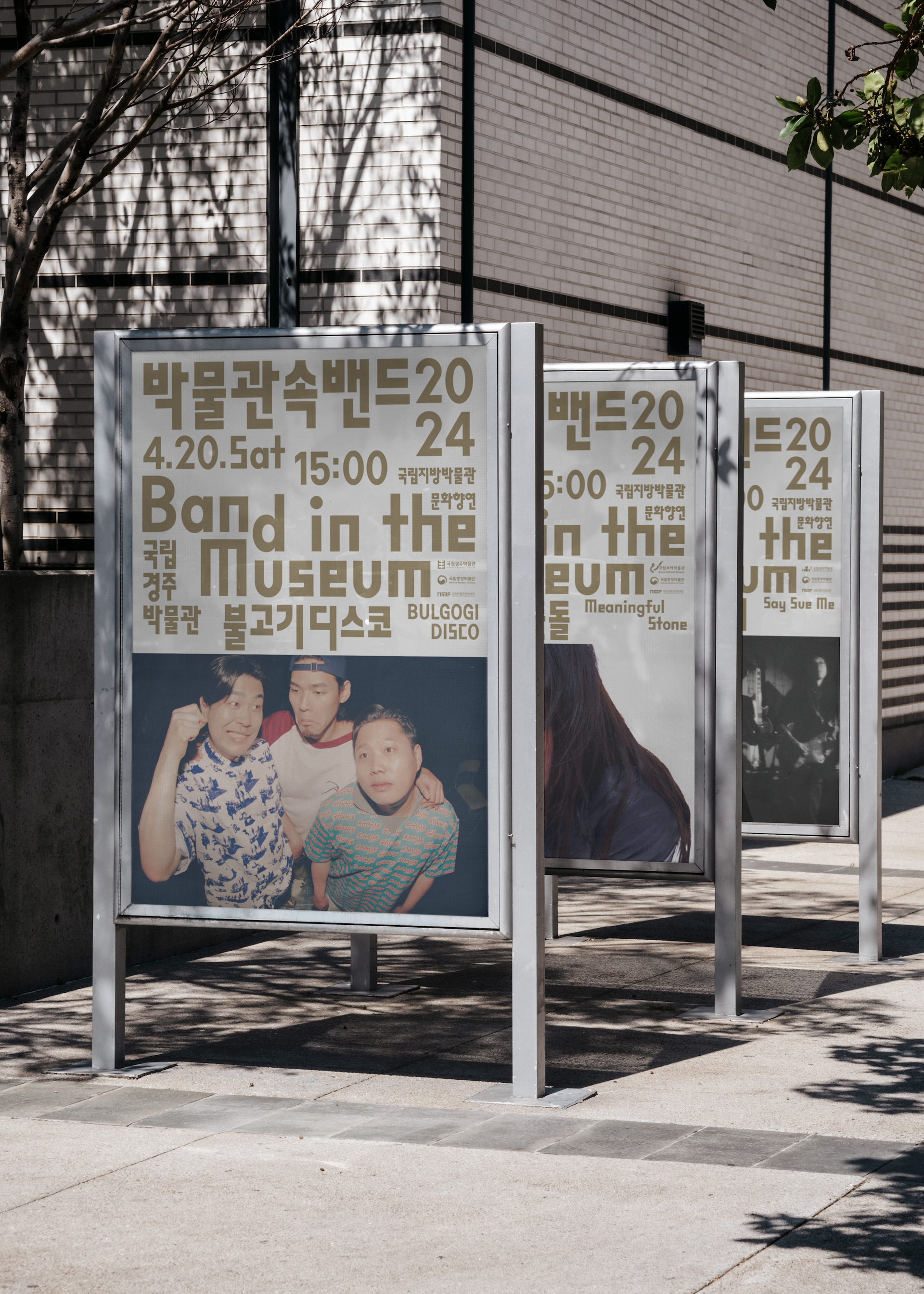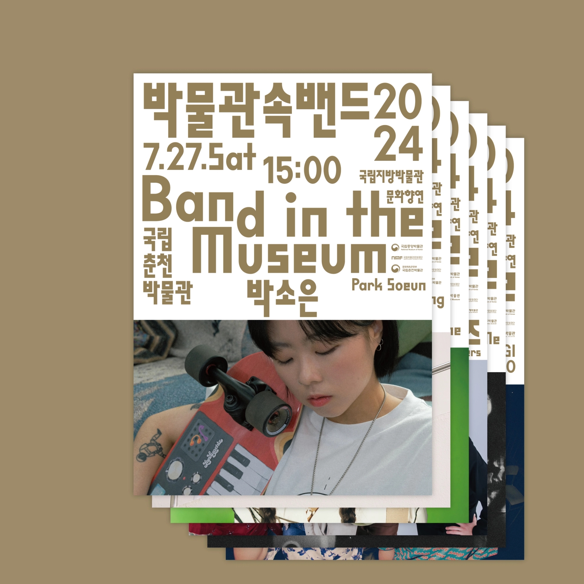 국립지방박물관 문화향연 <박물관 속 기타>의 그래픽디자인을 진행했습니다. 🎸 국립지방박물관의 주요 관람객층인 어린이, 가족, 노년층을 넘어, 청년들의 공연관람과 박물관 방문을 유도하기 위해 국립박물관을 직관적으로 떠오르게 만드는 이미지인 유물을 국립박물관의 3D 데이터 소장품을 활용하여 제작하고, 밴드를 직관적으로 표현하는 상징으로 ‘기타’를 선정해 포스터의 키비주얼로 제작하였습니다. 국립박물관(소장품)과 밴드(기타)를 하나로 묶어주는 존재인 ‘관객’과 ‘국립박물관문화재단’을 설명하기 위한 상징으로 파도치는 물결을 함께 배치하였습니다. 국립지방박물관 안에서 전시부터 공연까지 즐길 수 있는 <박물관속밴드>의 취지를 유물부터 기타로, 기타에서 유물로 이어지는 물결의 흐름으로 표현했습니다. 메인 타이틀에 사용된 타이포그래피는 기존 관람객인 노년층에게 친숙함을 주고, 신규 관람객인 청년층에게 새로움을 줄 수 있는 복고풍 폰트를 활용해 리듬감있게 배치하였습니다. 한글의 받침의 유무, 영문의 기둥의 유무에 따라 높이의 리듬감이 느껴지는 형태는 밴드 음악의 자유로움을 느끼게 해주며, 퍼즐처럼 결합되어 배치된 텍스트들은 안정된 레이아웃을 만들어 주어 국립박물관의 편안하고 견고한 느낌을 연상시키게 합니다. 공연일시와 장소, 아티스트에 대한 정보는 가장 상단부터 시계 반대방향으로 메인 그래픽을 감싸고 있습니다. 공연 순서대로 넘버링된 숫자는 기타피크의 모양을 본따 제작되었으며, 동시에 위치를 표시하는 기호처럼 보여져 전국에서 펼쳐지는 문화행사임을 암시합니다. 이러한 자유롭고 생동감있는 배치는 다소 딱딱하고 경직된 공간으로 인식되어있던 국립지방박물관에 대한 선입견을 깨주는 역할을 수행합니다.