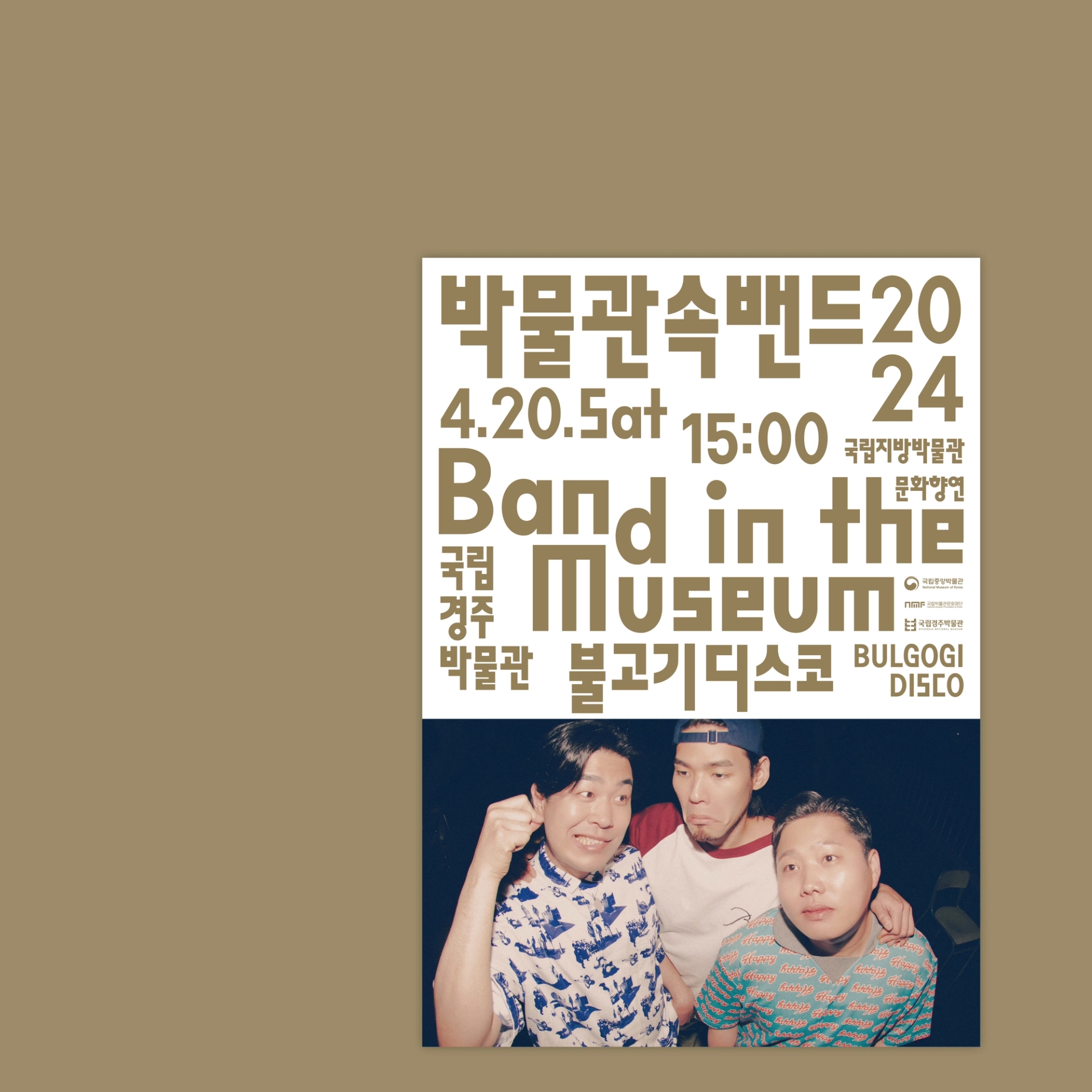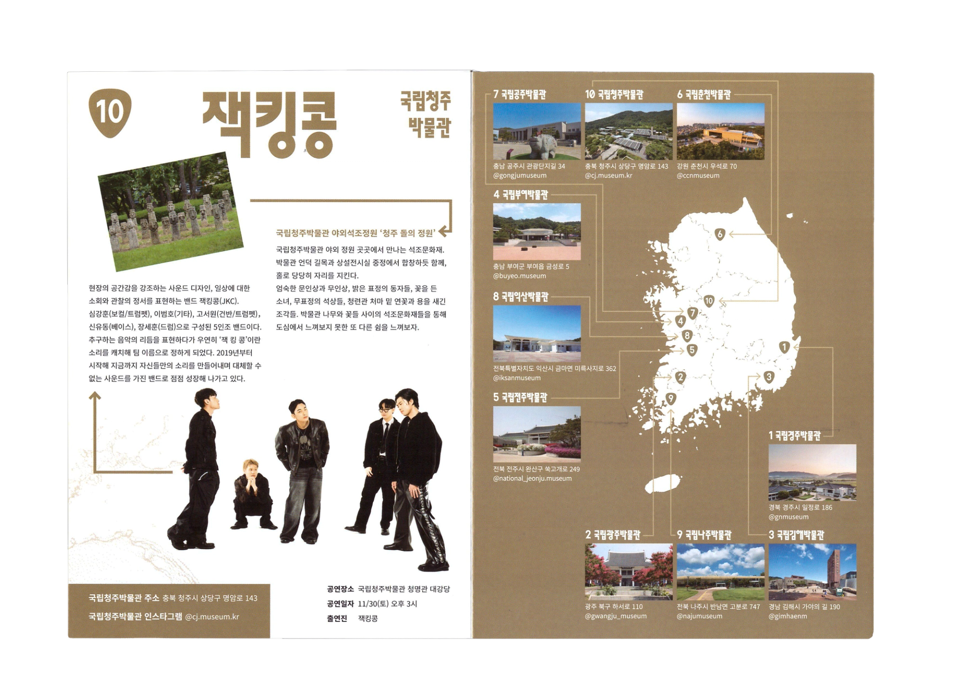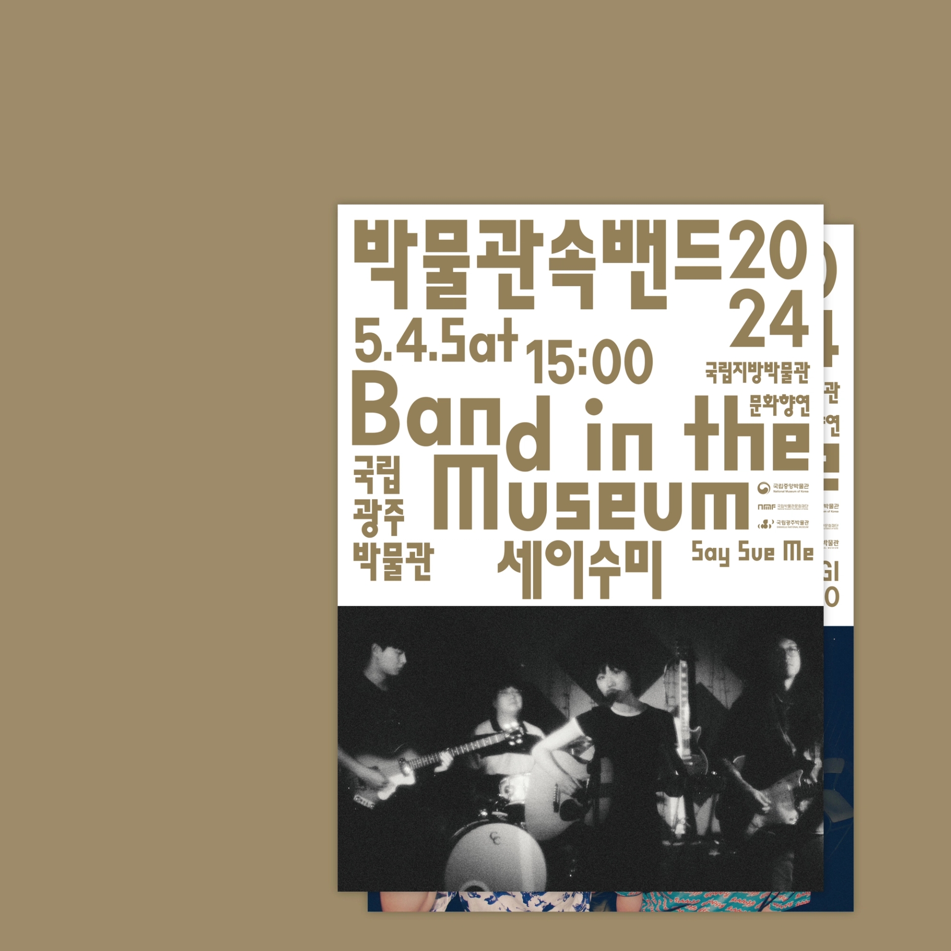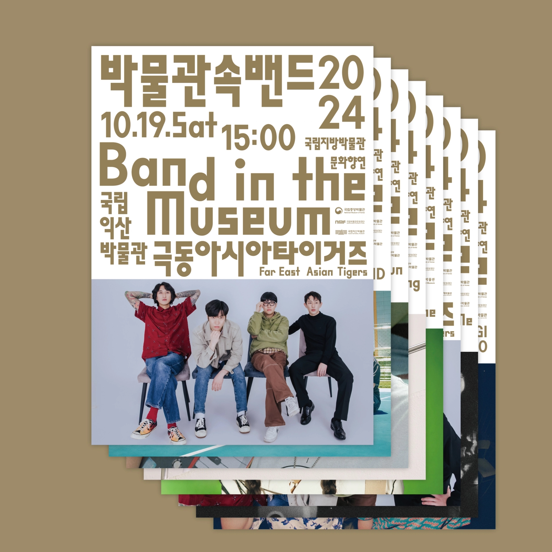 국립지방박물관 문화향연 <박물관 속 기타>의 그래픽디자인을 진행했습니다. 🎸 국립지방박물관의 주요 관람객층인 어린이, 가족, 노년층을 넘어, 청년들의 공연관람과 박물관 방문을 유도하기 위해 국립박물관을 직관적으로 떠오르게 만드는 이미지인 유물을 국립박물관의 3D 데이터 소장품을 활용하여 제작하고, 밴드를 직관적으로 표현하는 상징으로 ‘기타’를 선정해 포스터의 키비주얼로 제작하였습니다. 국립박물관(소장품)과 밴드(기타)를 하나로 묶어주는 존재인 ‘관객’과 ‘국립박물관문화재단’을 설명하기 위한 상징으로 파도치는 물결을 함께 배치하였습니다. 국립지방박물관 안에서 전시부터 공연까지 즐길 수 있는 <박물관속밴드>의 취지를 유물부터 기타로, 기타에서 유물로 이어지는 물결의 흐름으로 표현했습니다. 메인 타이틀에 사용된 타이포그래피는 기존 관람객인 노년층에게 친숙함을 주고, 신규 관람객인 청년층에게 새로움을 줄 수 있는 복고풍 폰트를 활용해 리듬감있게 배치하였습니다. 한글의 받침의 유무, 영문의 기둥의 유무에 따라 높이의 리듬감이 느껴지는 형태는 밴드 음악의 자유로움을 느끼게 해주며, 퍼즐처럼 결합되어 배치된 텍스트들은 안정된 레이아웃을 만들어 주어 국립박물관의 편안하고 견고한 느낌을 연상시키게 합니다. 공연일시와 장소, 아티스트에 대한 정보는 가장 상단부터 시계 반대방향으로 메인 그래픽을 감싸고 있습니다. 공연 순서대로 넘버링된 숫자는 기타피크의 모양을 본따 제작되었으며, 동시에 위치를 표시하는 기호처럼 보여져 전국에서 펼쳐지는 문화행사임을 암시합니다. 이러한 자유롭고 생동감있는 배치는 다소 딱딱하고 경직된 공간으로 인식되어있던 국립지방박물관에 대한 선입견을 깨주는 역할을 수행합니다.
