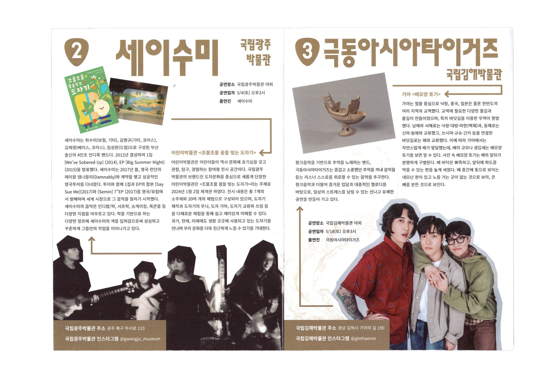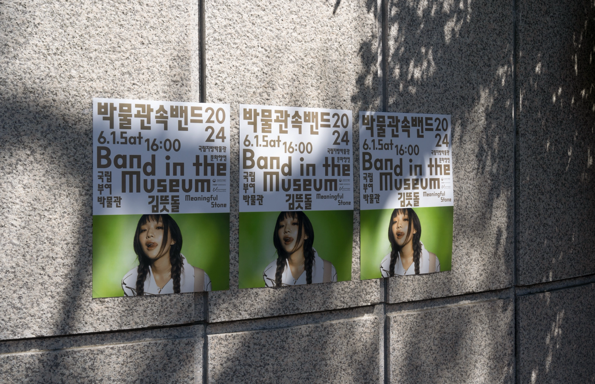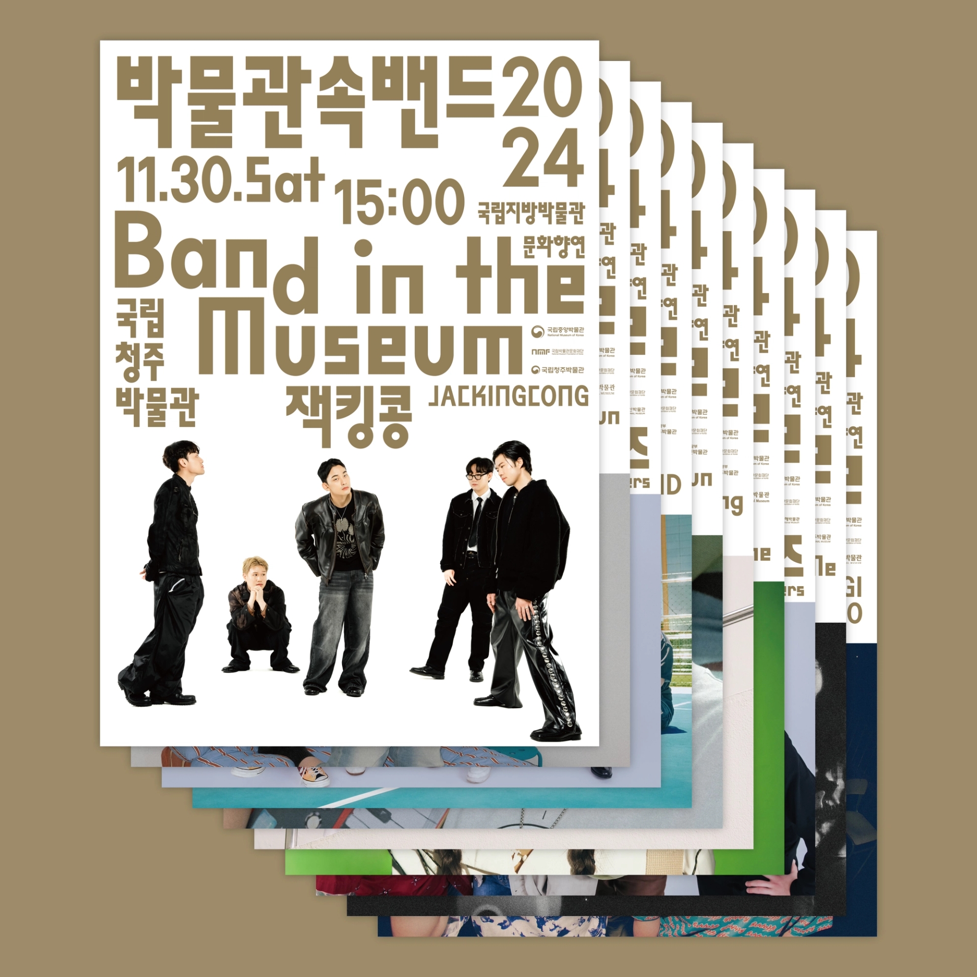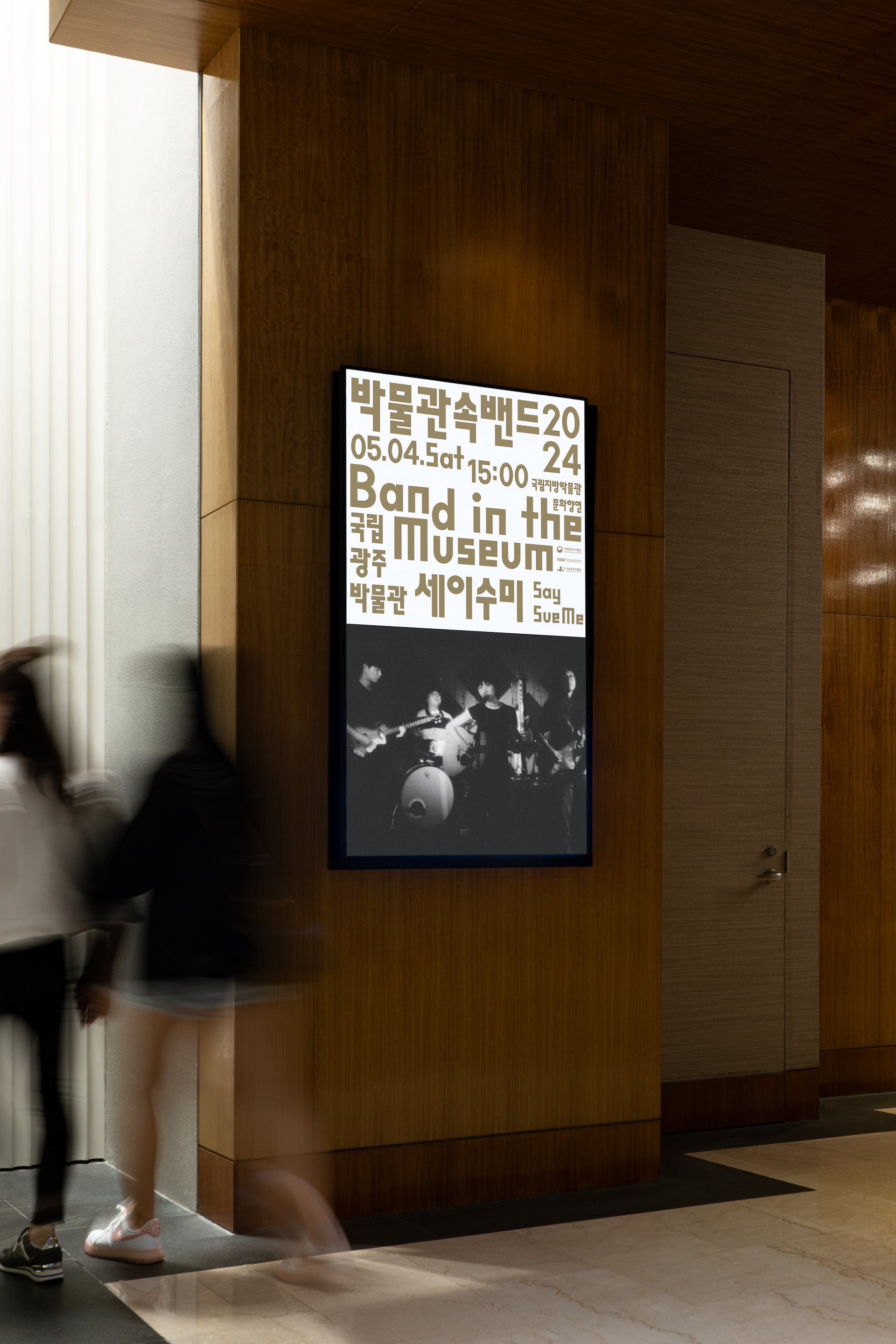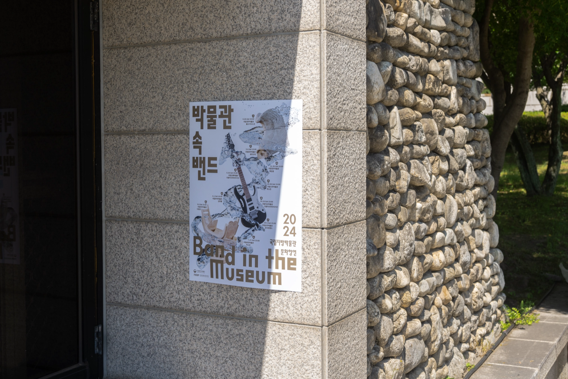 국립지방박물관 문화향연 <박물관 속 기타>의 그래픽디자인을 진행했습니다. 🎸 국립지방박물관의 주요 관람객층인 어린이, 가족, 노년층을 넘어, 청년들의 공연관람과 박물관 방문을 유도하기 위해 국립박물관을 직관적으로 떠오르게 만드는 이미지인 유물을 국립박물관의 3D 데이터 소장품을 활용하여 제작하고, 밴드를 직관적으로 표현하는 상징으로 ‘기타’를 선정해 포스터의 키비주얼로 제작하였습니다. 국립박물관(소장품)과 밴드(기타)를 하나로 묶어주는 존재인 ‘관객’과 ‘국립박물관문화재단’을 설명하기 위한 상징으로 파도치는 물결을 함께 배치하였습니다. 국립지방박물관 안에서 전시부터 공연까지 즐길 수 있는 <박물관속밴드>의 취지를 유물부터 기타로, 기타에서 유물로 이어지는 물결의 흐름으로 표현했습니다. 메인 타이틀에 사용된 타이포그래피는 기존 관람객인 노년층에게 친숙함을 주고, 신규 관람객인 청년층에게 새로움을 줄 수 있는 복고풍 폰트를 활용해 리듬감있게 배치하였습니다. 한글의 받침의 유무, 영문의 기둥의 유무에 따라 높이의 리듬감이 느껴지는 형태는 밴드 음악의 자유로움을 느끼게 해주며, 퍼즐처럼 결합되어 배치된 텍스트들은 안정된 레이아웃을 만들어 주어 국립박물관의 편안하고 견고한 느낌을 연상시키게 합니다. 공연일시와 장소, 아티스트에 대한 정보는 가장 상단부터 시계 반대방향으로 메인 그래픽을 감싸고 있습니다. 공연 순서대로 넘버링된 숫자는 기타피크의 모양을 본따 제작되었으며, 동시에 위치를 표시하는 기호처럼 보여져 전국에서 펼쳐지는 문화행사임을 암시합니다. 이러한 자유롭고 생동감있는 배치는 다소 딱딱하고 경직된 공간으로 인식되어있던 국립지방박물관에 대한 선입견을 깨주는 역할을 수행합니다.