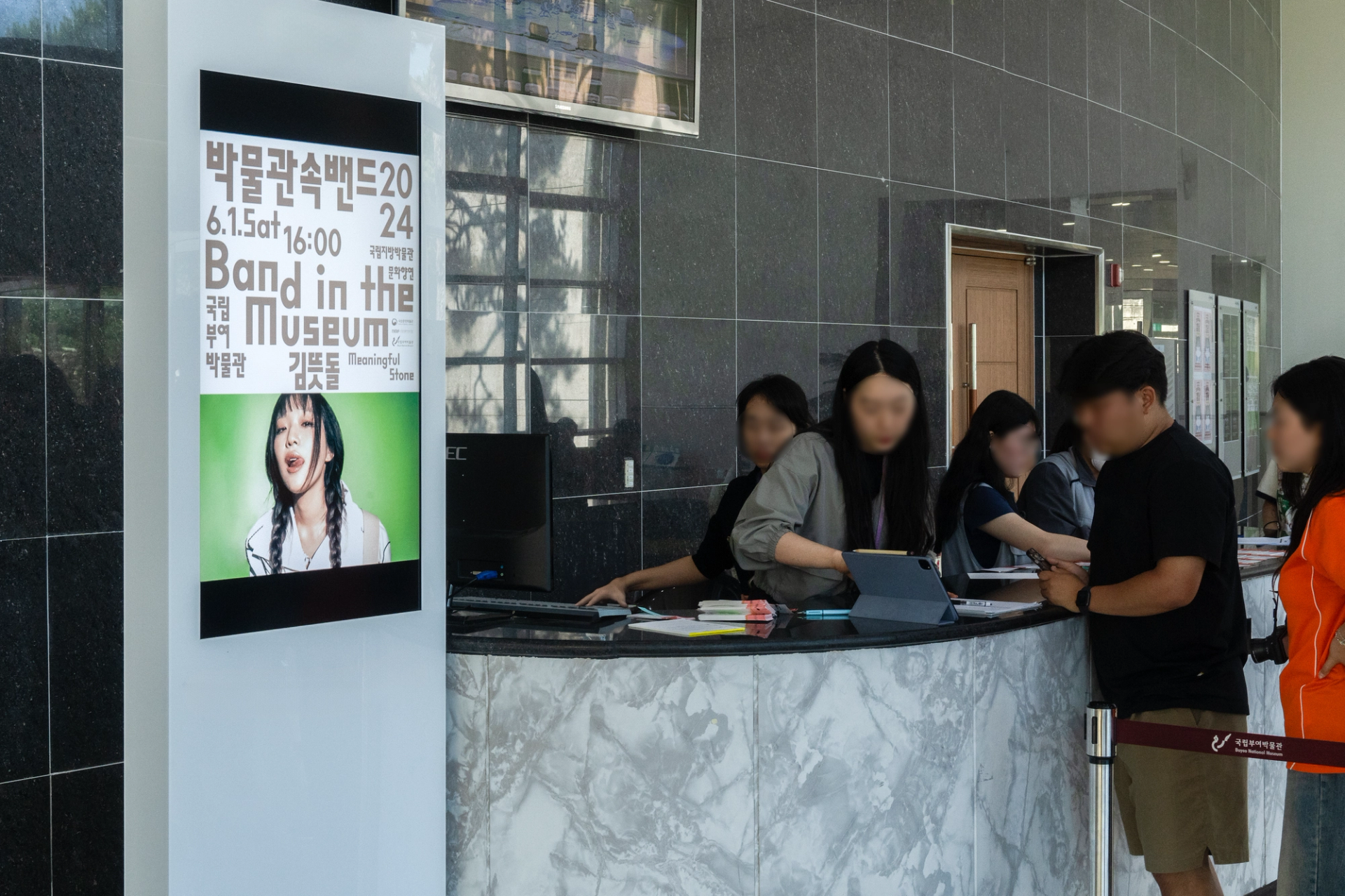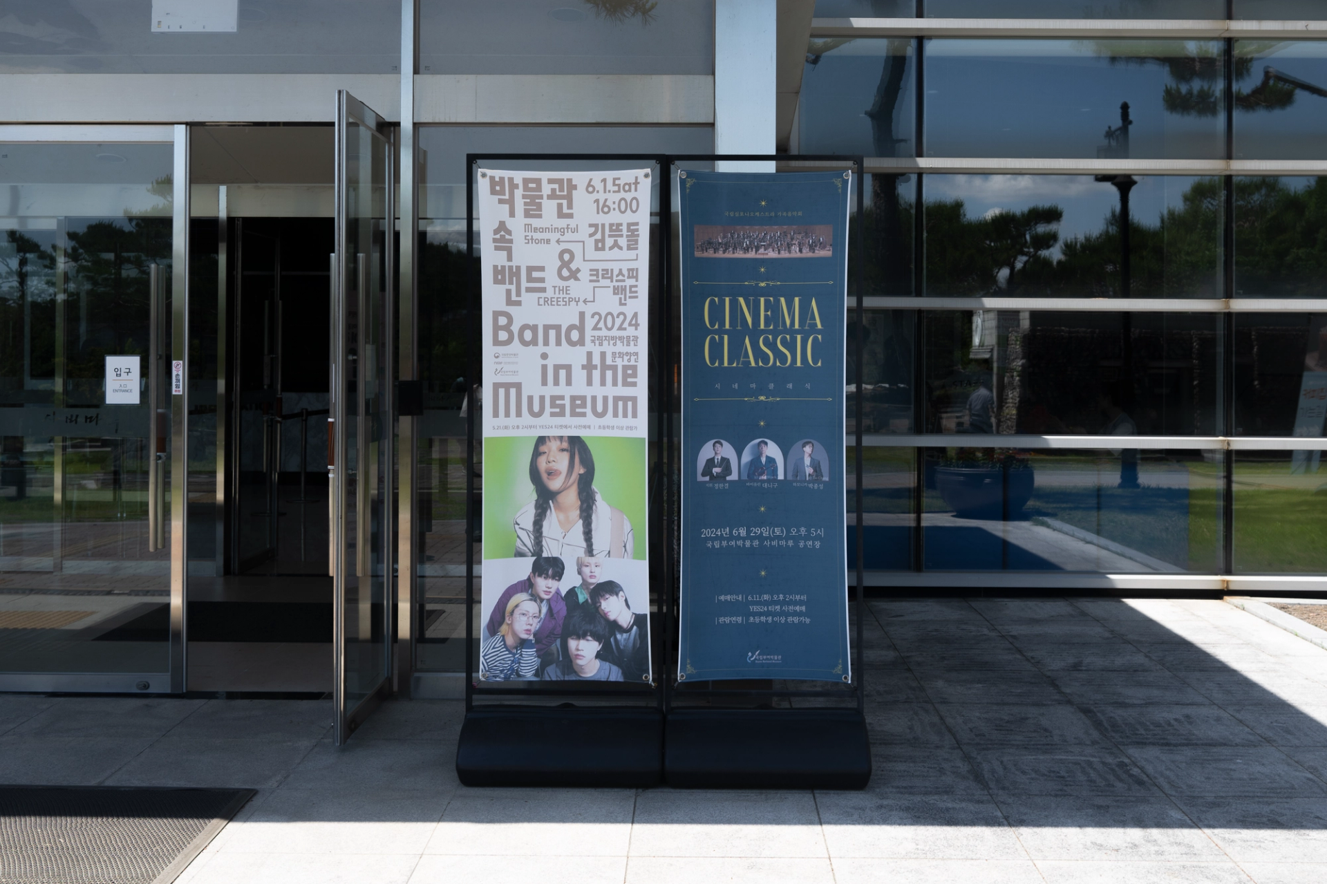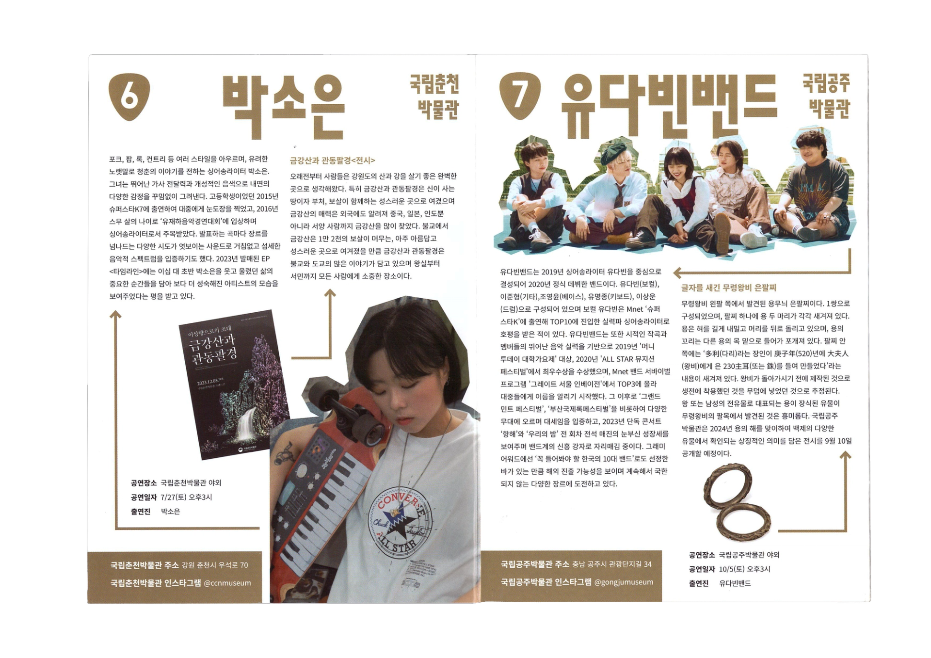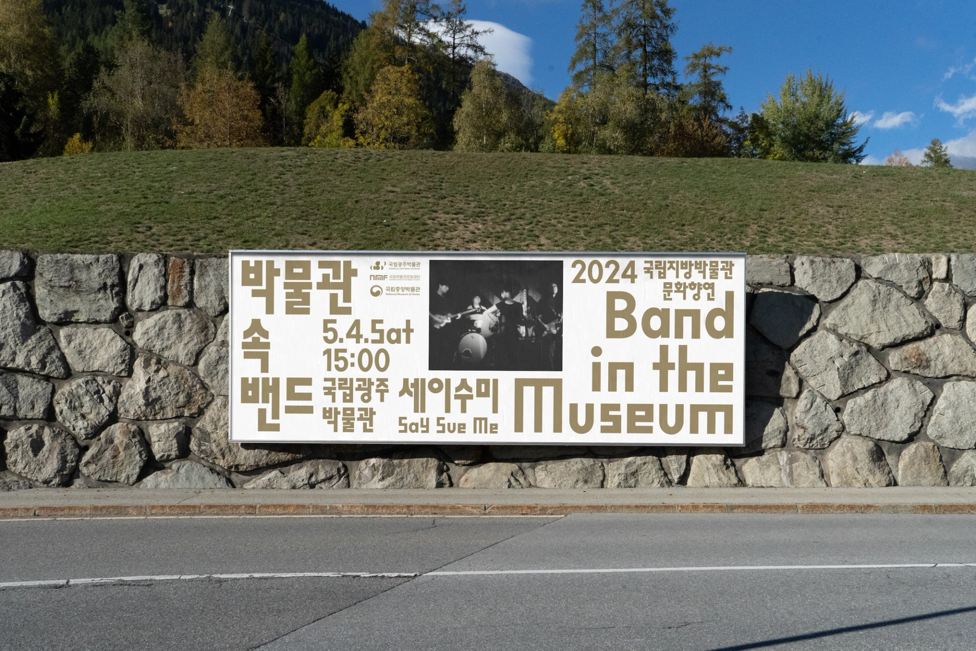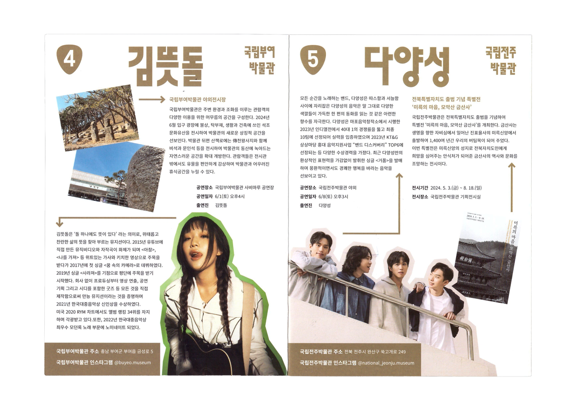 국립지방박물관 문화향연 <박물관 속 기타>의 그래픽디자인을 진행했습니다. 🎸 국립지방박물관의 주요 관람객층인 어린이, 가족, 노년층을 넘어, 청년들의 공연관람과 박물관 방문을 유도하기 위해 국립박물관을 직관적으로 떠오르게 만드는 이미지인 유물을 국립박물관의 3D 데이터 소장품을 활용하여 제작하고, 밴드를 직관적으로 표현하는 상징으로 ‘기타’를 선정해 포스터의 키비주얼로 제작하였습니다. 국립박물관(소장품)과 밴드(기타)를 하나로 묶어주는 존재인 ‘관객’과 ‘국립박물관문화재단’을 설명하기 위한 상징으로 파도치는 물결을 함께 배치하였습니다. 국립지방박물관 안에서 전시부터 공연까지 즐길 수 있는 <박물관속밴드>의 취지를 유물부터 기타로, 기타에서 유물로 이어지는 물결의 흐름으로 표현했습니다. 메인 타이틀에 사용된 타이포그래피는 기존 관람객인 노년층에게 친숙함을 주고, 신규 관람객인 청년층에게 새로움을 줄 수 있는 복고풍 폰트를 활용해 리듬감있게 배치하였습니다. 한글의 받침의 유무, 영문의 기둥의 유무에 따라 높이의 리듬감이 느껴지는 형태는 밴드 음악의 자유로움을 느끼게 해주며, 퍼즐처럼 결합되어 배치된 텍스트들은 안정된 레이아웃을 만들어 주어 국립박물관의 편안하고 견고한 느낌을 연상시키게 합니다. 공연일시와 장소, 아티스트에 대한 정보는 가장 상단부터 시계 반대방향으로 메인 그래픽을 감싸고 있습니다. 공연 순서대로 넘버링된 숫자는 기타피크의 모양을 본따 제작되었으며, 동시에 위치를 표시하는 기호처럼 보여져 전국에서 펼쳐지는 문화행사임을 암시합니다. 이러한 자유롭고 생동감있는 배치는 다소 딱딱하고 경직된 공간으로 인식되어있던 국립지방박물관에 대한 선입견을 깨주는 역할을 수행합니다.