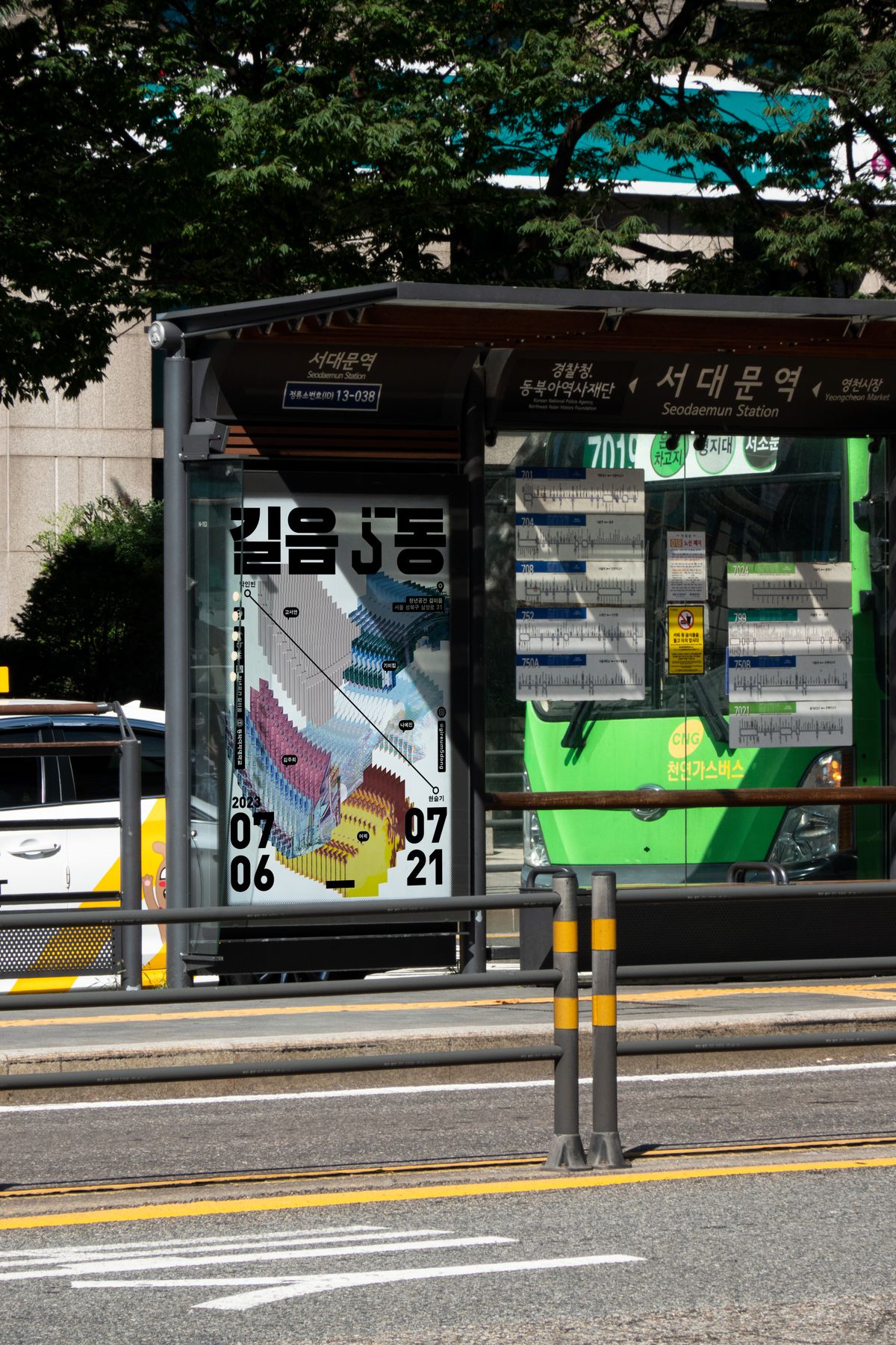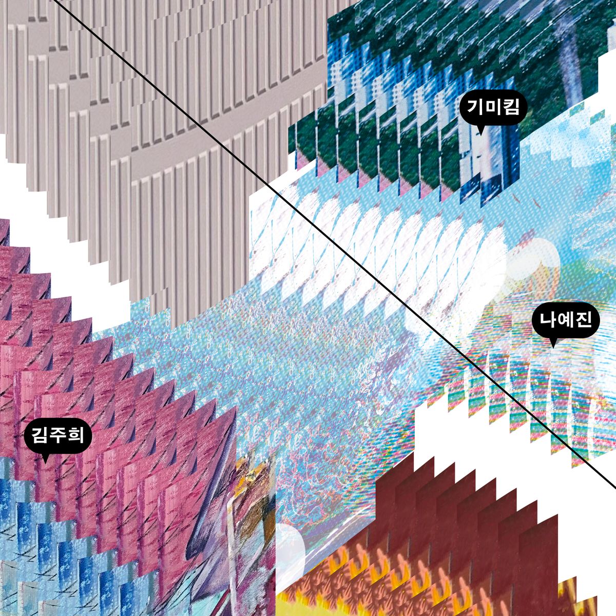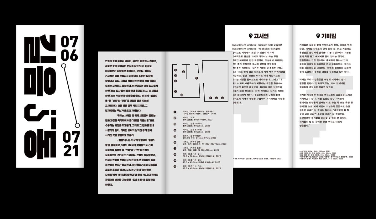 길음동의 지도를 픽셀화하고 조각내어 완전히 새로운 공간처럼 보여지도록 만들어 《길음 5동》이라는 가상의 공간을 표현했다. 길음동의 조각은 총 다섯 개이며 한 조각마다 작가의 이름이 표시되어 있다. 작가의 이름은 가상의 도시 《길음 5동》의 다섯가지 ‘동’이 연상되도록 지도 어플리케이션의 위치 UI의 형태를 본따 제작했다. 조각난 다섯 개의 길음동이 퍼즐처럼 합쳐지면 완전한 《길음 5동》이 완성되는 것을 상상할 수 있도록 의도하였고, 관람객이 《길음 5동》이라는 가상의 공간에 입장하는 것을 길음동의 지도가 뒤틀리듯 산란하며 빨려들어가는 모습으로 표현하였다. 다섯 명의 참여 작가들과 기획자로 참여한 두 명의 학생을 구분할 수 있도록 기획자 명단을 지도 어플리케이션의 면적 측정 UI의 형태를 본떠 디자인하여 표기하였다. 타이틀 《길음 5동》의 “5”를 기호 “물음표(?)”와 연결 지어 가상의 공간을 은유적으로 표현했다. 아파트와 주택 외벽에 페인트로 칠해진 텍스트를 연상시키는 볼드한 서체를 활용하여 전시장의 공간적 특이성을 강조했다.