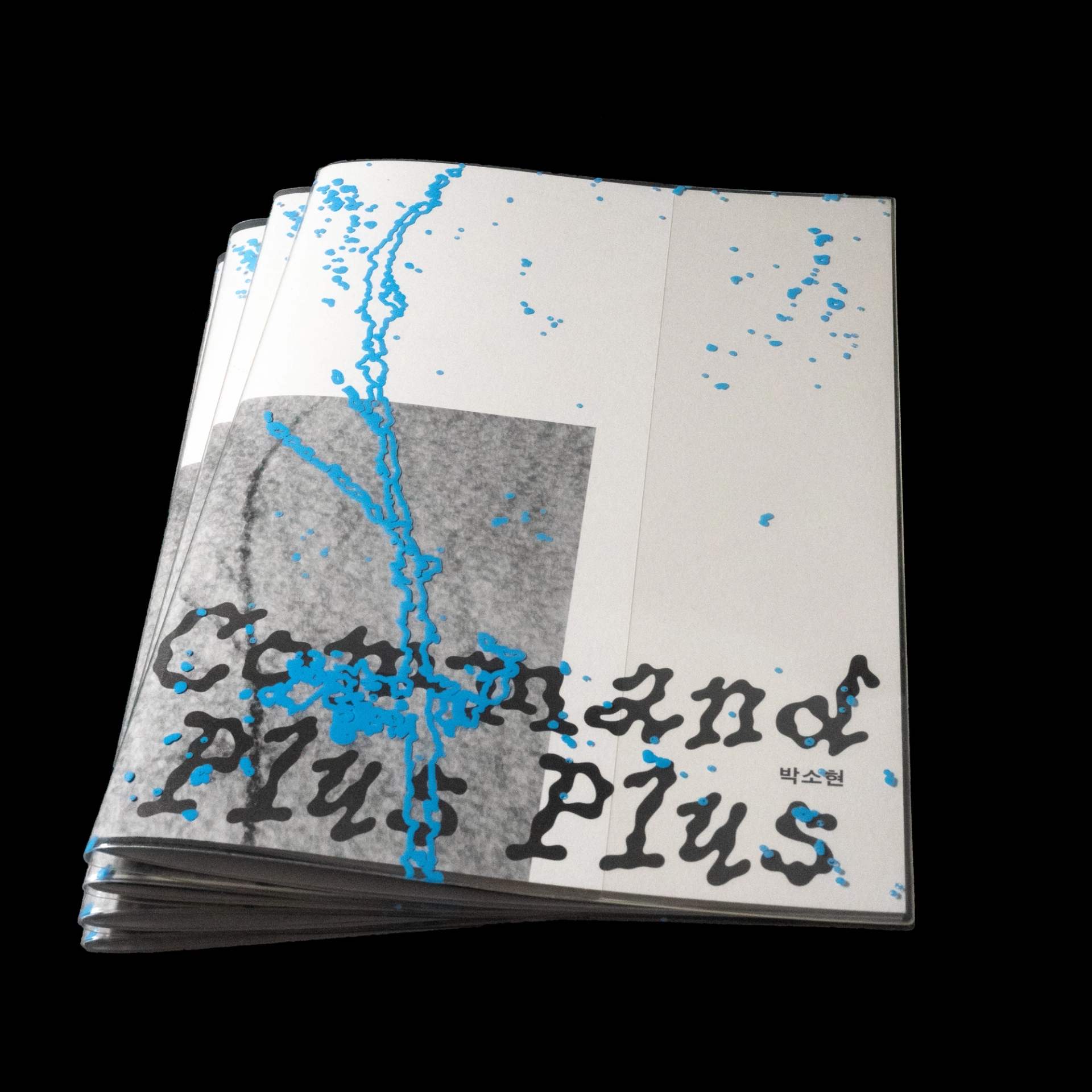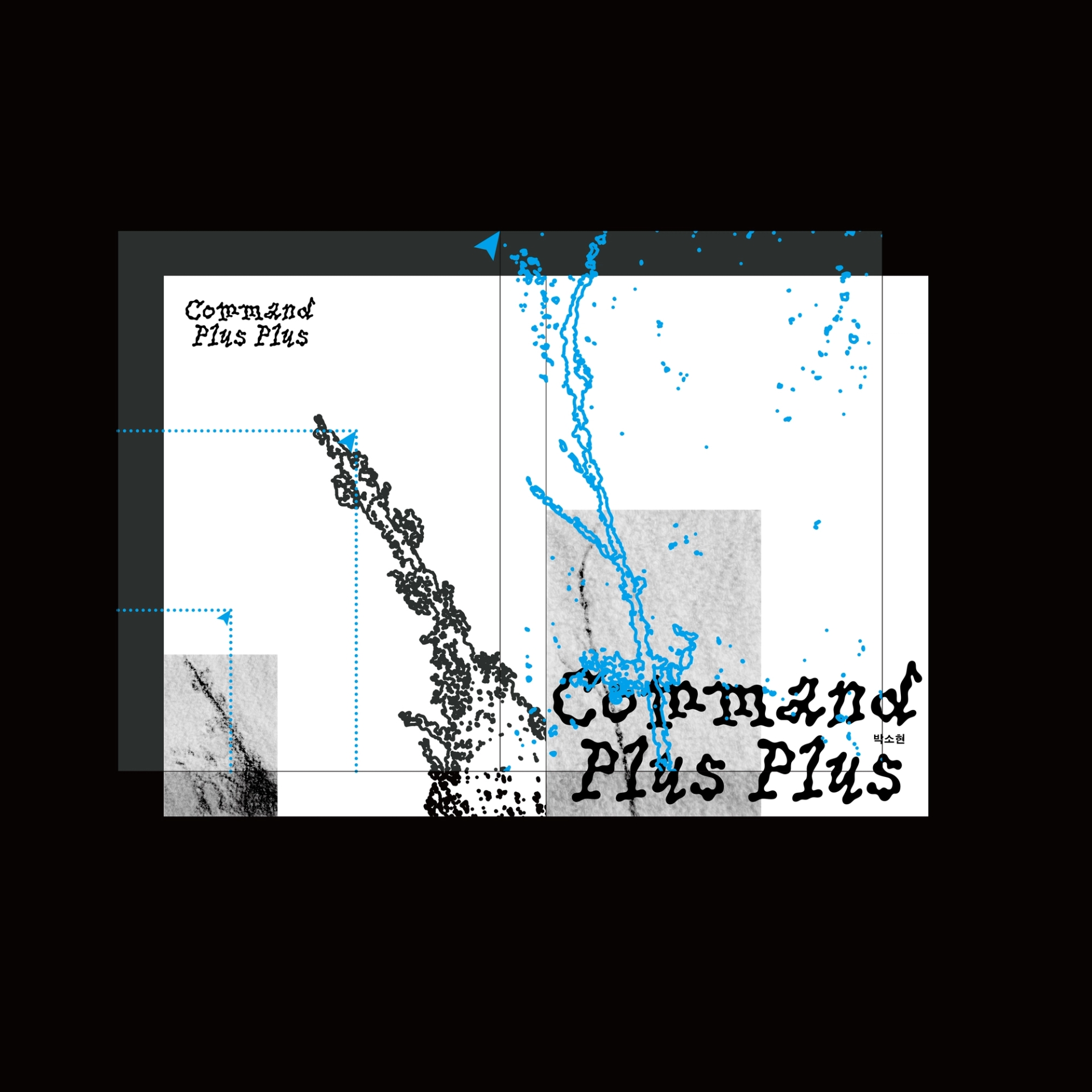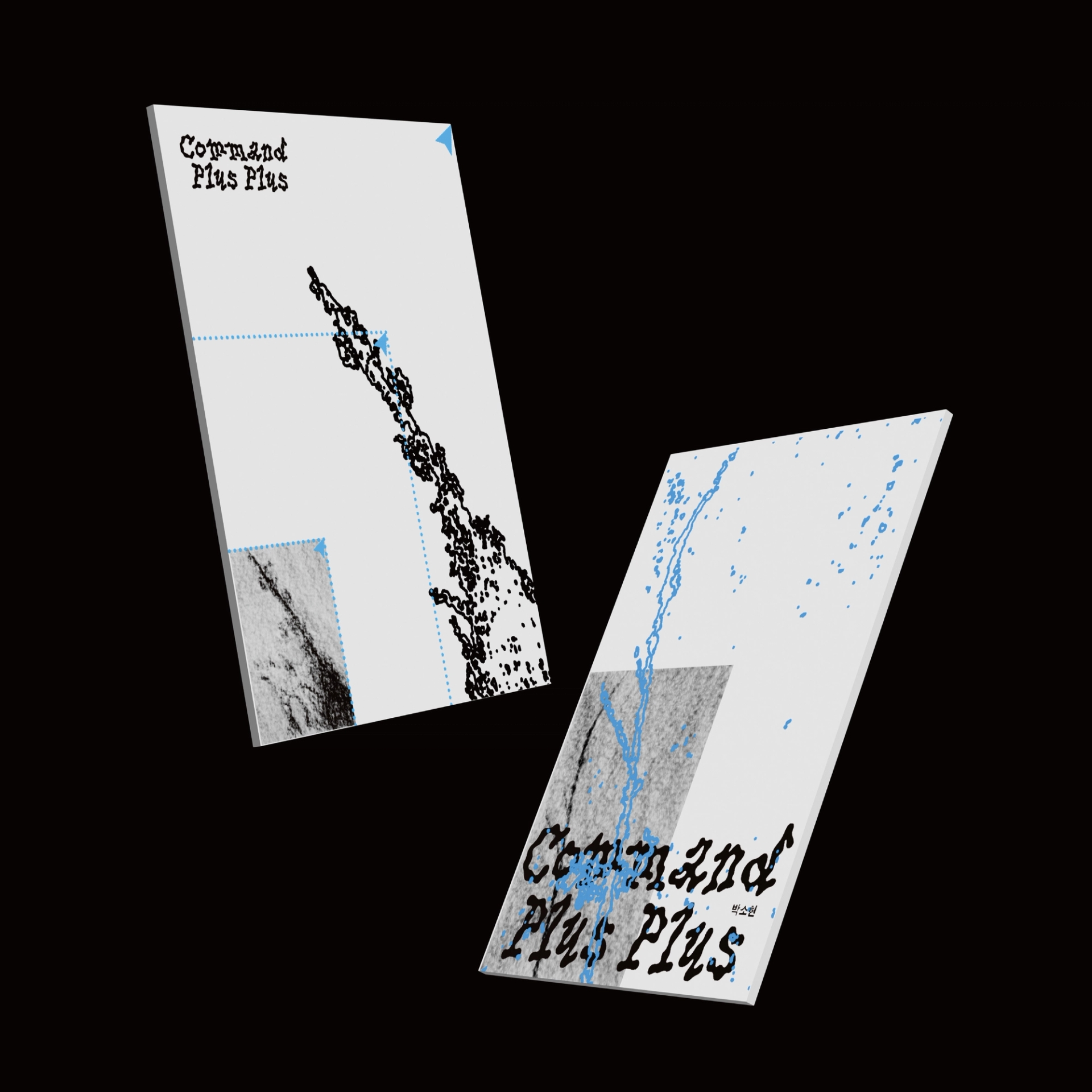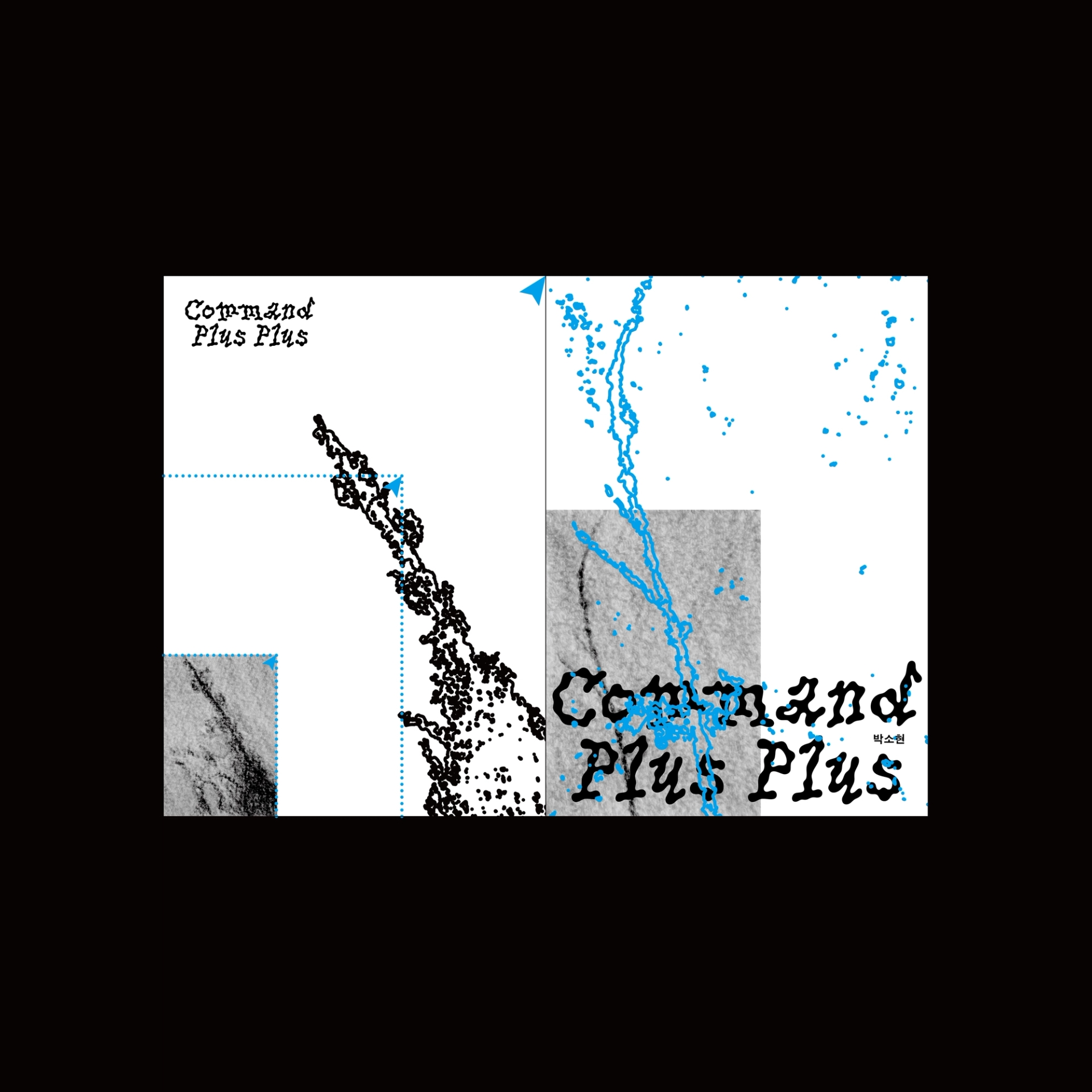 화집의 커버에 한겹의 유리를 연상시키는 PVC커버를 덧대어 작품 사진과 작품 이미지를 재해석한 그래픽을 겹쳐보이게 구성했다. 커버를 드러내면 그제서야 작품의 이미지를 직접적으로 마주할 수 있다. 이것은 편견을 ‘걷어내다’를 행위로서 표현한 것과 동시에 작품이 표현하고자하는 감춰진 이면의 모습을 강조한 것이기도 하다. 작품을 재해석한 그래픽의 경우, adobe illustrator 이미지추적 기능을 사용하여 확대의 이미지를 한 번 더 왜곡시키는 과정을 통해 탄생했다. 여기서의 왜곡은 작품을 책으로 엮어내는 과정 속, 디자이너의 관점에서 발생하는 또 한 번의 확대를 상징한다. 확대할 때 좌측하단부터 우측상단까지 쭈욱 늘이는 행위를 표현하기 위해 작품의 이미지를 좌측 하단에 작게 배치하고, 작품을 재해석한 그래픽을 커버 전체에 꽉차게 배치했다. 좌측하단에 작게 배치된 이미지와 PVC커버에 꽉 차게 그려진 푸른색 그래픽이 대비되는 모습을 통해 독자들이 『Command Plus Plus』라는 화집의 이름과 작품의 의미를 떠올릴 수 있도록 디자인했다. 작가의 작업일화 중 adobe photoshop 프로그램에서 작품 사진의 확대와 축소를 반복하게 되며 새로운 이미지를 발견했던 경험을 표현하기 위해서 후면 커버에 점선과 마우스 커서를 연상하게하는 화살표 요소를 삽입하였다.