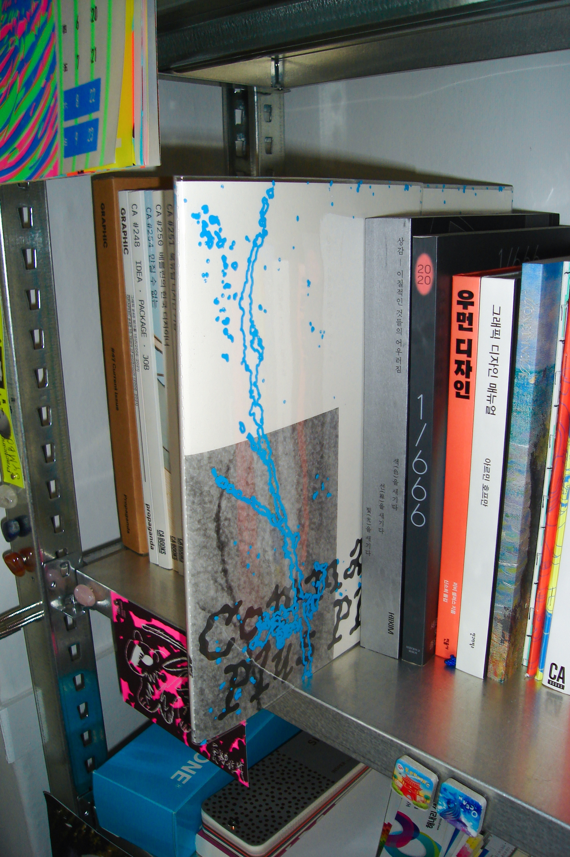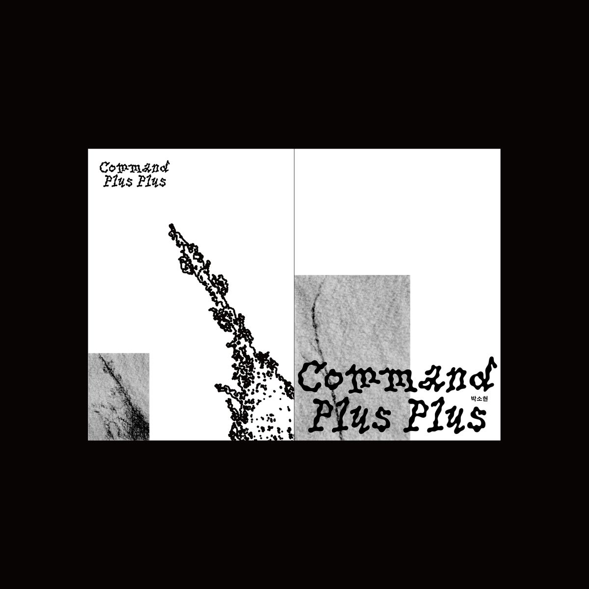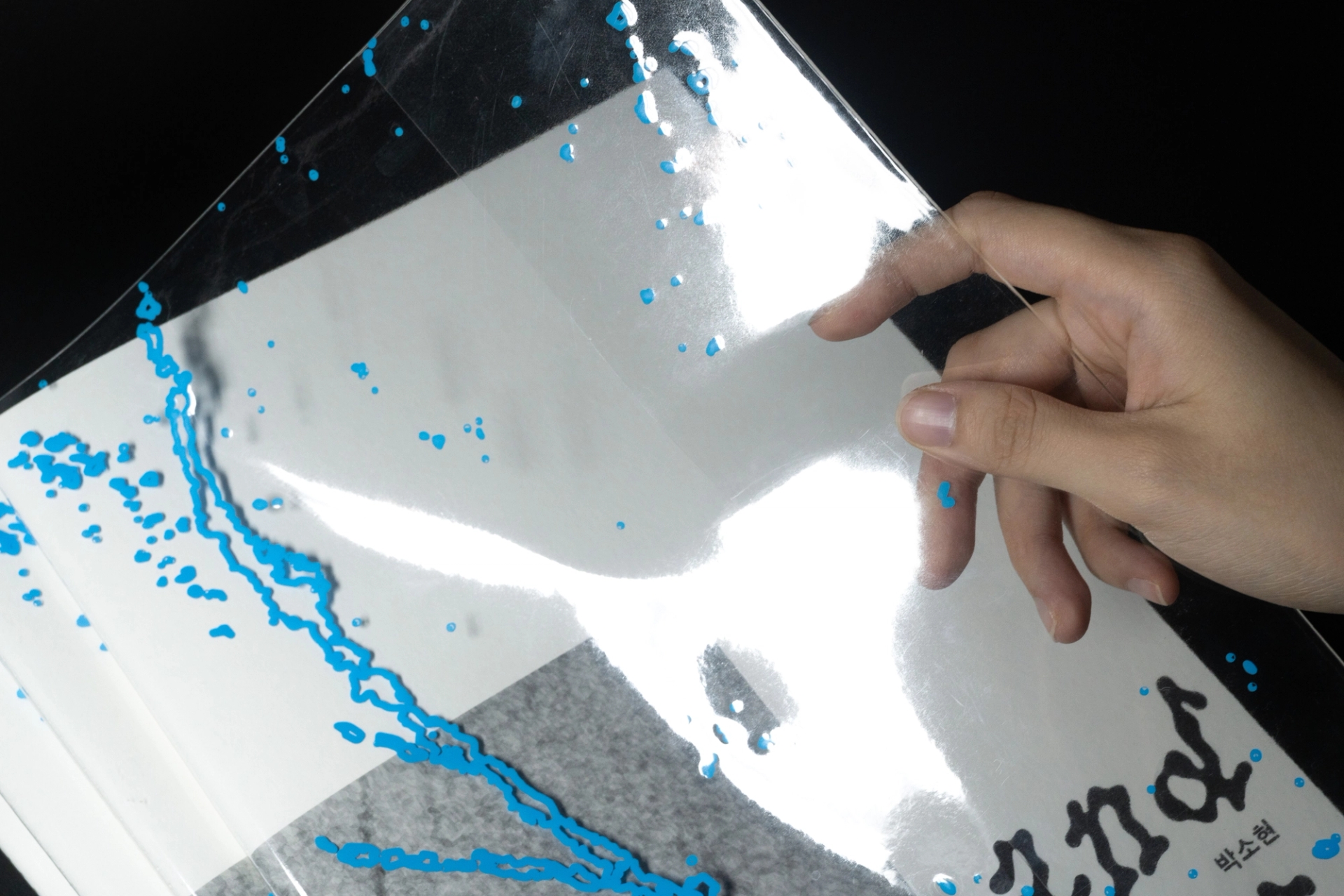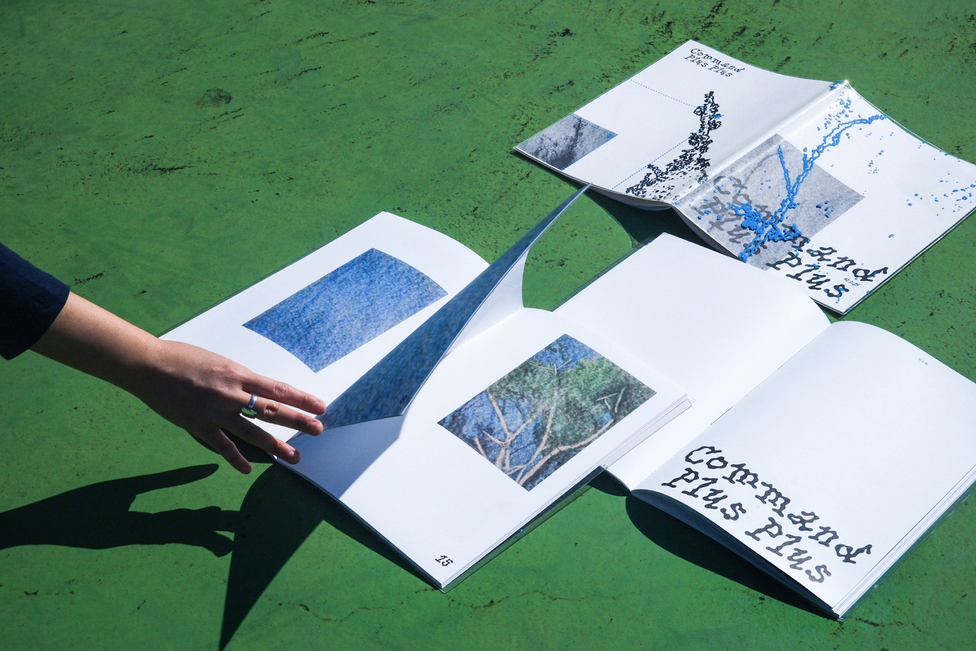 화집의 커버에 한겹의 유리를 연상시키는 PVC커버를 덧대어 작품 사진과 작품 이미지를 재해석한 그래픽을 겹쳐보이게 구성했다. 커버를 드러내면 그제서야 작품의 이미지를 직접적으로 마주할 수 있다. 이것은 편견을 ‘걷어내다’를 행위로서 표현한 것과 동시에 작품이 표현하고자하는 감춰진 이면의 모습을 강조한 것이기도 하다. 작품을 재해석한 그래픽의 경우, adobe illustrator 이미지추적 기능을 사용하여 확대의 이미지를 한 번 더 왜곡시키는 과정을 통해 탄생했다. 여기서의 왜곡은 작품을 책으로 엮어내는 과정 속, 디자이너의 관점에서 발생하는 또 한 번의 확대를 상징한다. 확대할 때 좌측하단부터 우측상단까지 쭈욱 늘이는 행위를 표현하기 위해 작품의 이미지를 좌측 하단에 작게 배치하고, 작품을 재해석한 그래픽을 커버 전체에 꽉차게 배치했다. 좌측하단에 작게 배치된 이미지와 PVC커버에 꽉 차게 그려진 푸른색 그래픽이 대비되는 모습을 통해 독자들이 『Command Plus Plus』라는 화집의 이름과 작품의 의미를 떠올릴 수 있도록 디자인했다. 작가의 작업일화 중 adobe photoshop 프로그램에서 작품 사진의 확대와 축소를 반복하게 되며 새로운 이미지를 발견했던 경험을 표현하기 위해서 후면 커버에 점선과 마우스 커서를 연상하게하는 화살표 요소를 삽입하였다.