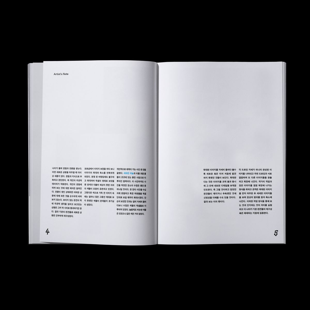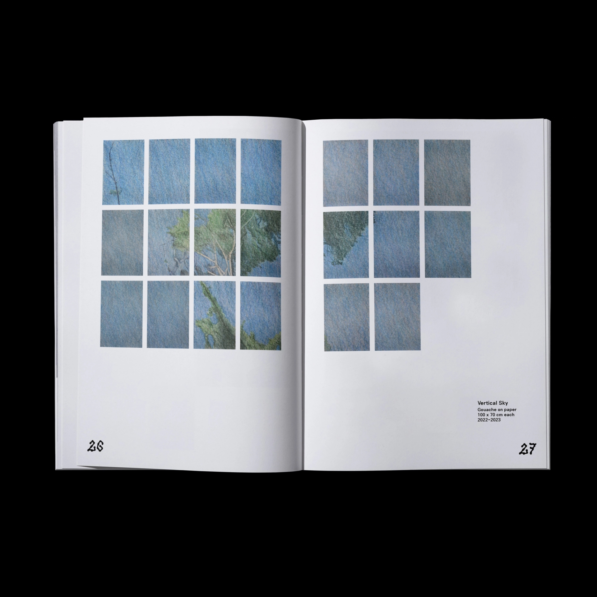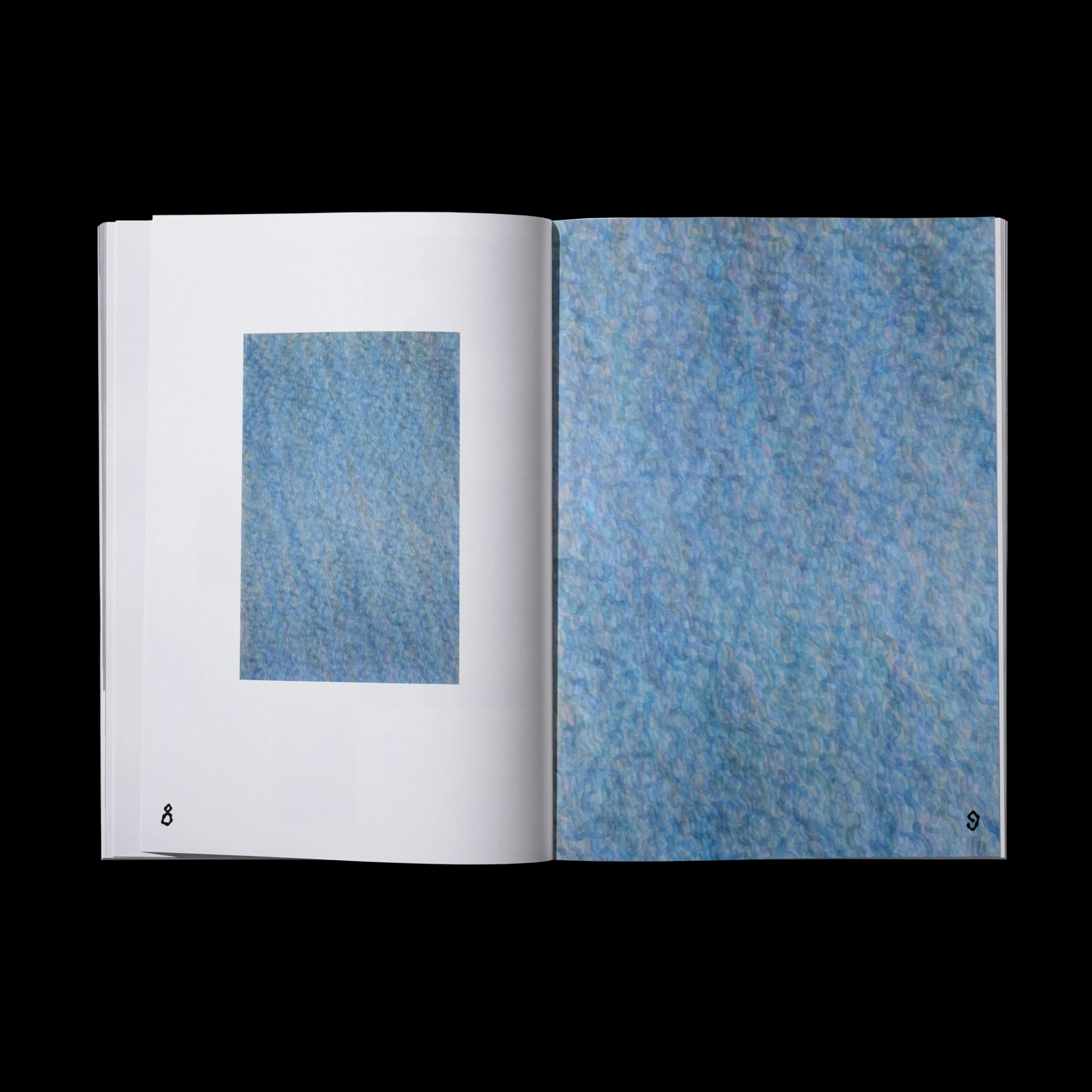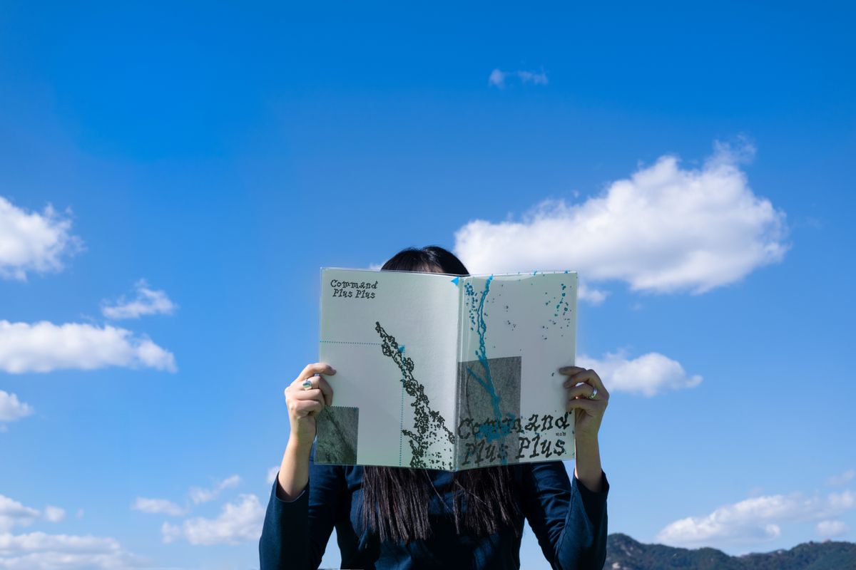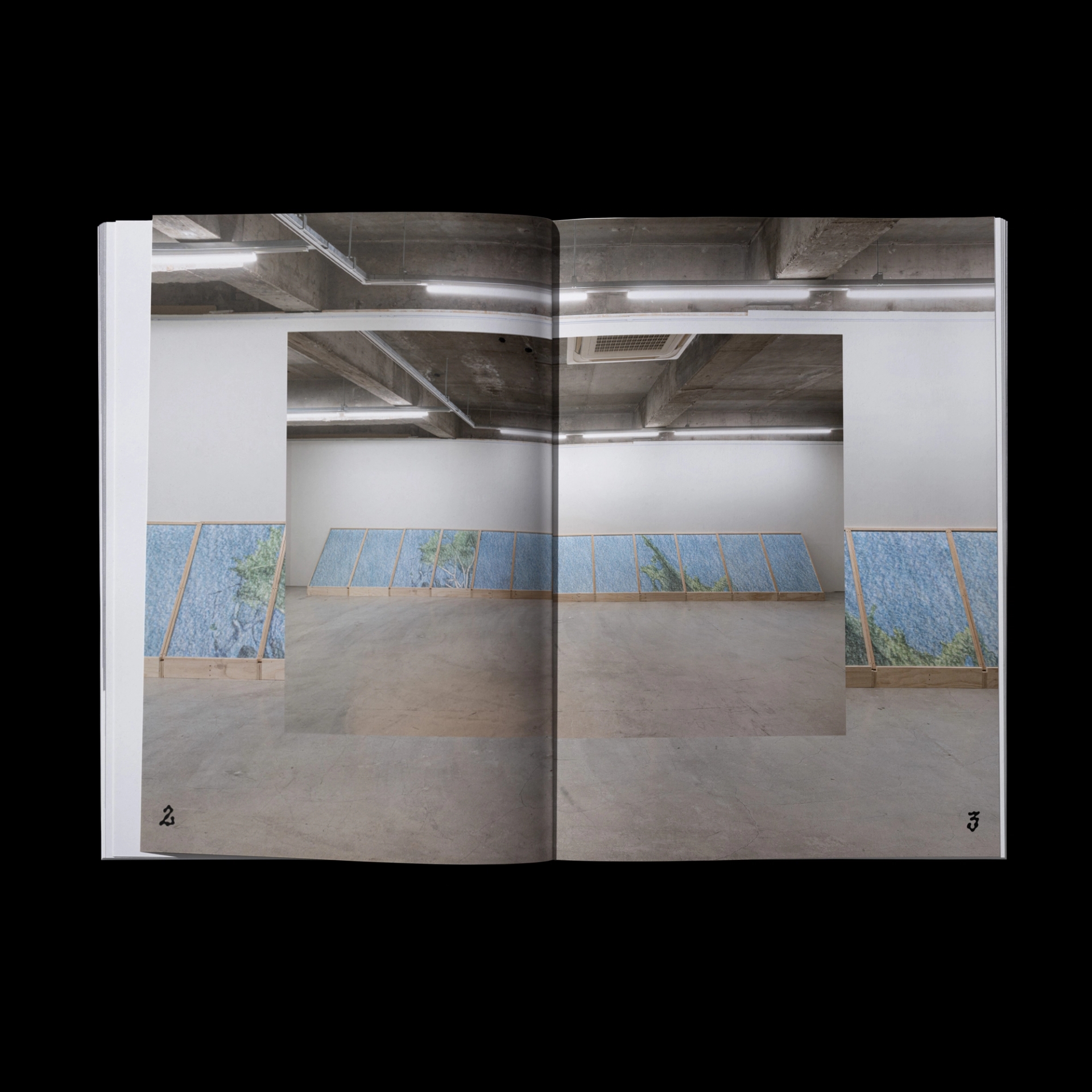 화집의 커버에 한겹의 유리를 연상시키는 PVC커버를 덧대어 작품 사진과 작품 이미지를 재해석한 그래픽을 겹쳐보이게 구성했다. 커버를 드러내면 그제서야 작품의 이미지를 직접적으로 마주할 수 있다. 이것은 편견을 ‘걷어내다’를 행위로서 표현한 것과 동시에 작품이 표현하고자하는 감춰진 이면의 모습을 강조한 것이기도 하다. 작품을 재해석한 그래픽의 경우, adobe illustrator 이미지추적 기능을 사용하여 확대의 이미지를 한 번 더 왜곡시키는 과정을 통해 탄생했다. 여기서의 왜곡은 작품을 책으로 엮어내는 과정 속, 디자이너의 관점에서 발생하는 또 한 번의 확대를 상징한다. 확대할 때 좌측하단부터 우측상단까지 쭈욱 늘이는 행위를 표현하기 위해 작품의 이미지를 좌측 하단에 작게 배치하고, 작품을 재해석한 그래픽을 커버 전체에 꽉차게 배치했다. 좌측하단에 작게 배치된 이미지와 PVC커버에 꽉 차게 그려진 푸른색 그래픽이 대비되는 모습을 통해 독자들이 『Command Plus Plus』라는 화집의 이름과 작품의 의미를 떠올릴 수 있도록 디자인했다. 작가의 작업일화 중 adobe photoshop 프로그램에서 작품 사진의 확대와 축소를 반복하게 되며 새로운 이미지를 발견했던 경험을 표현하기 위해서 후면 커버에 점선과 마우스 커서를 연상하게하는 화살표 요소를 삽입하였다.