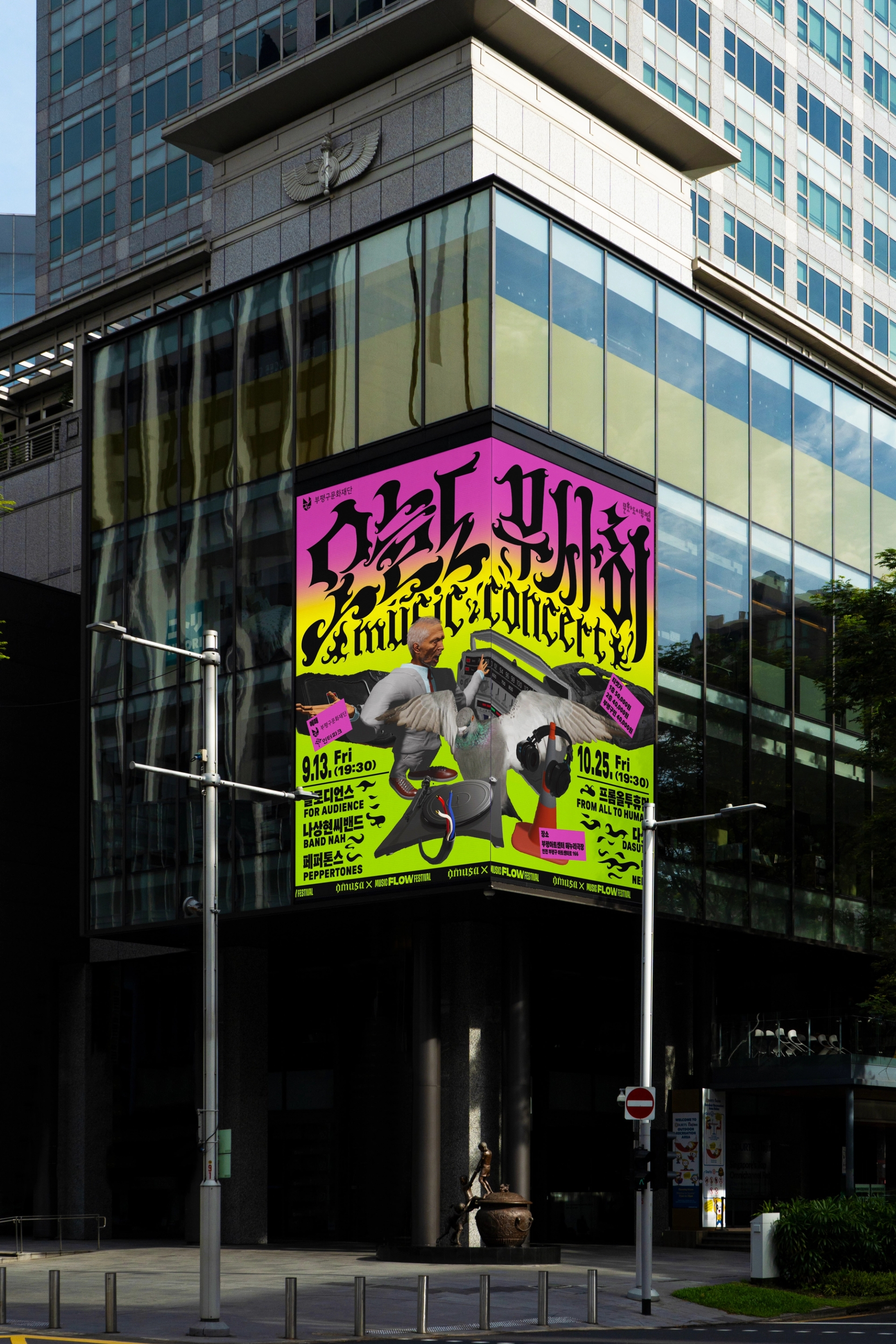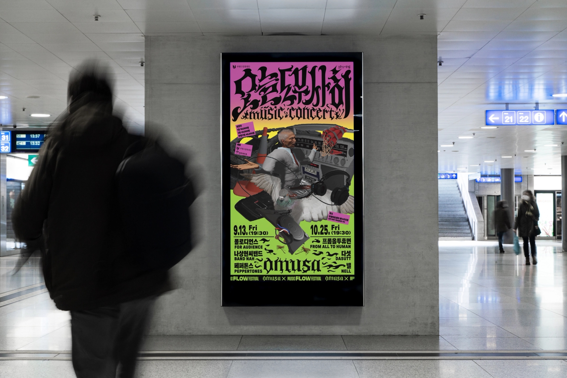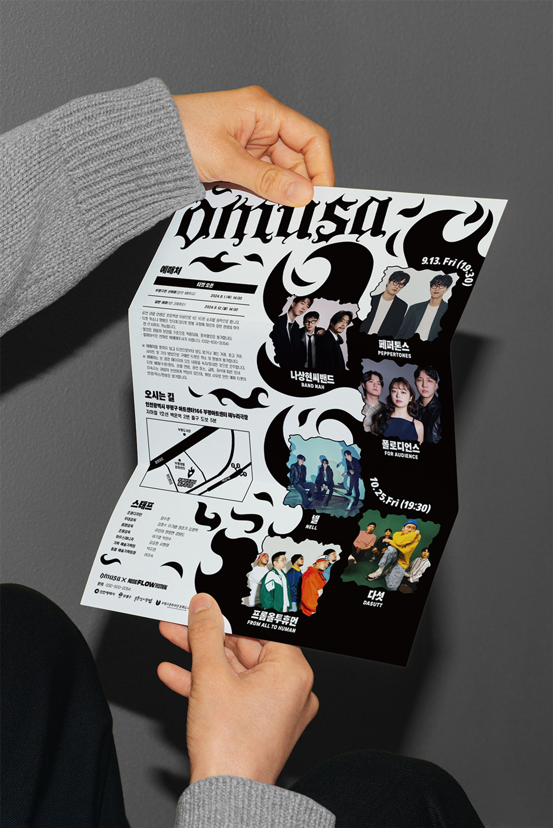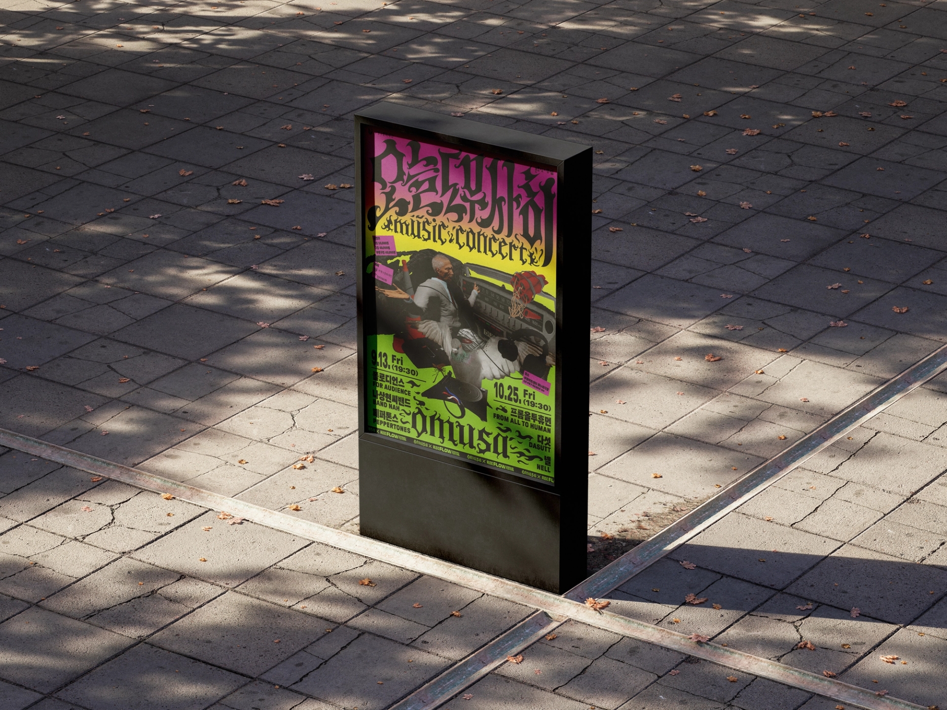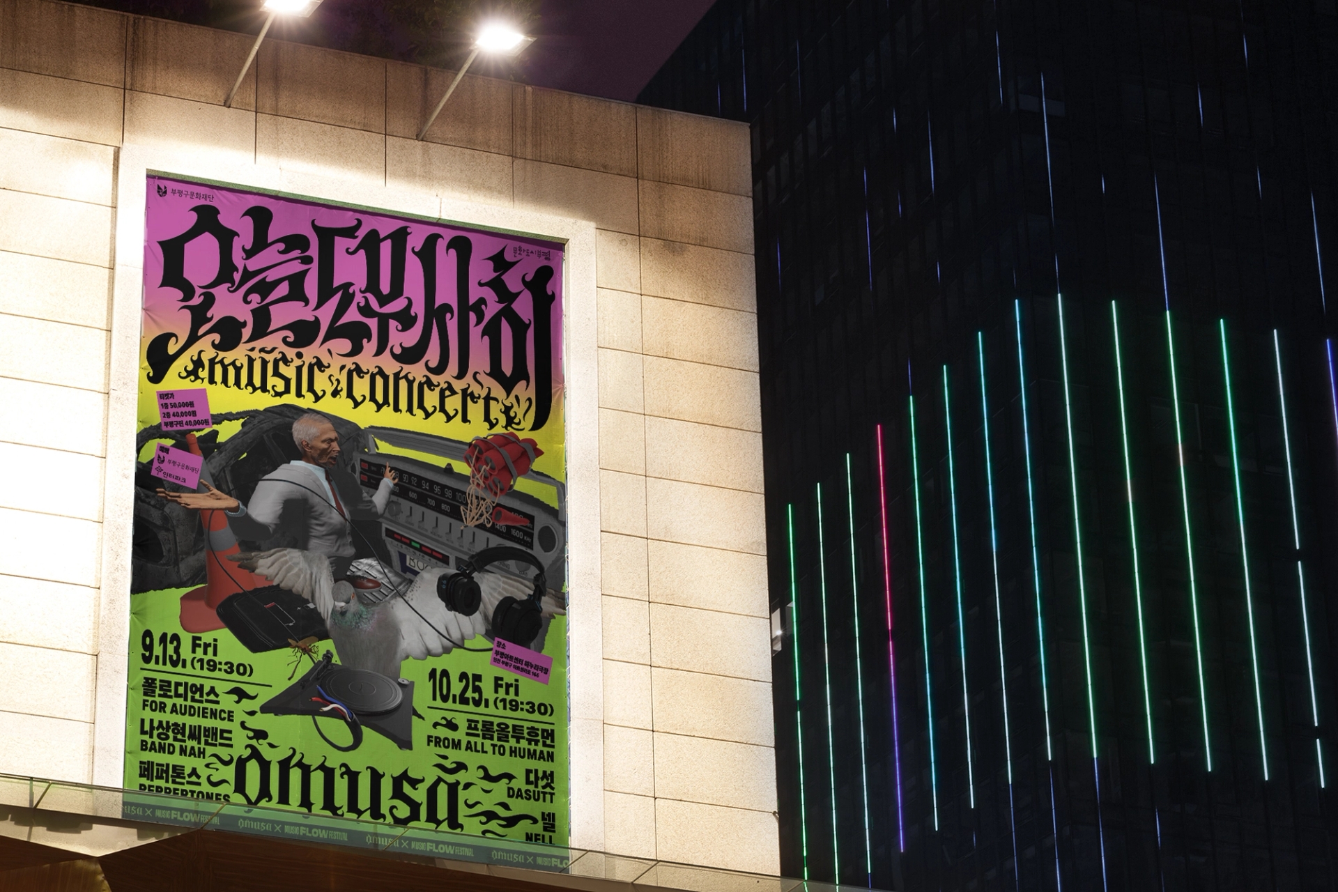 나에게로 날아오는 비둘기, 폭파된 차량, 고함치는 직장 상사, 방전된 휴대폰, 쉴새없이 윙윙대는 모기 … 현대인의 공포를 자극하거나, 크고 작은 위협이 되는 존재들을 로우폴리 3D오브젝트를 통해 시각화했습니다. 포스터 지면 곳곳에 빼곡히 배치된 위험요소로부터 ‘오늘도 무사히’ 살아남은 우리를 표현하여, 역설적으로 그러한 위험요소와 투쟁하여 생존했음에 자신감을 얻을 수 있도록 의도하여 디자인했습니다. 위험을 상징하는 오브젝트를 의도적으로 왜곡해 표현함으로서 《오늘도 무사히》 공연을 유머러스하고 트렌디하게 인식하게 만들고, 편견이 만든 프레임에 저항하고 자유를 추구하는 음악의 정신을 표현했습니다. 이글이글 타오르는 《오늘도 무사히, OMUSA》 타이틀 레터링은 공연의 다이내믹함을 암시합니다. 또한 스트릿 아트의 ‘그래피티’ 표현방식을 통해 락, 힙합, DJ, 비보이 등 다양한 서브컬처 음악장르와 맞닿아있는 《오늘도 무사히》의 아이덴티티로 기능하고, 다양한 MD상품으로 확장할 수 있도록 제작했습니다.
