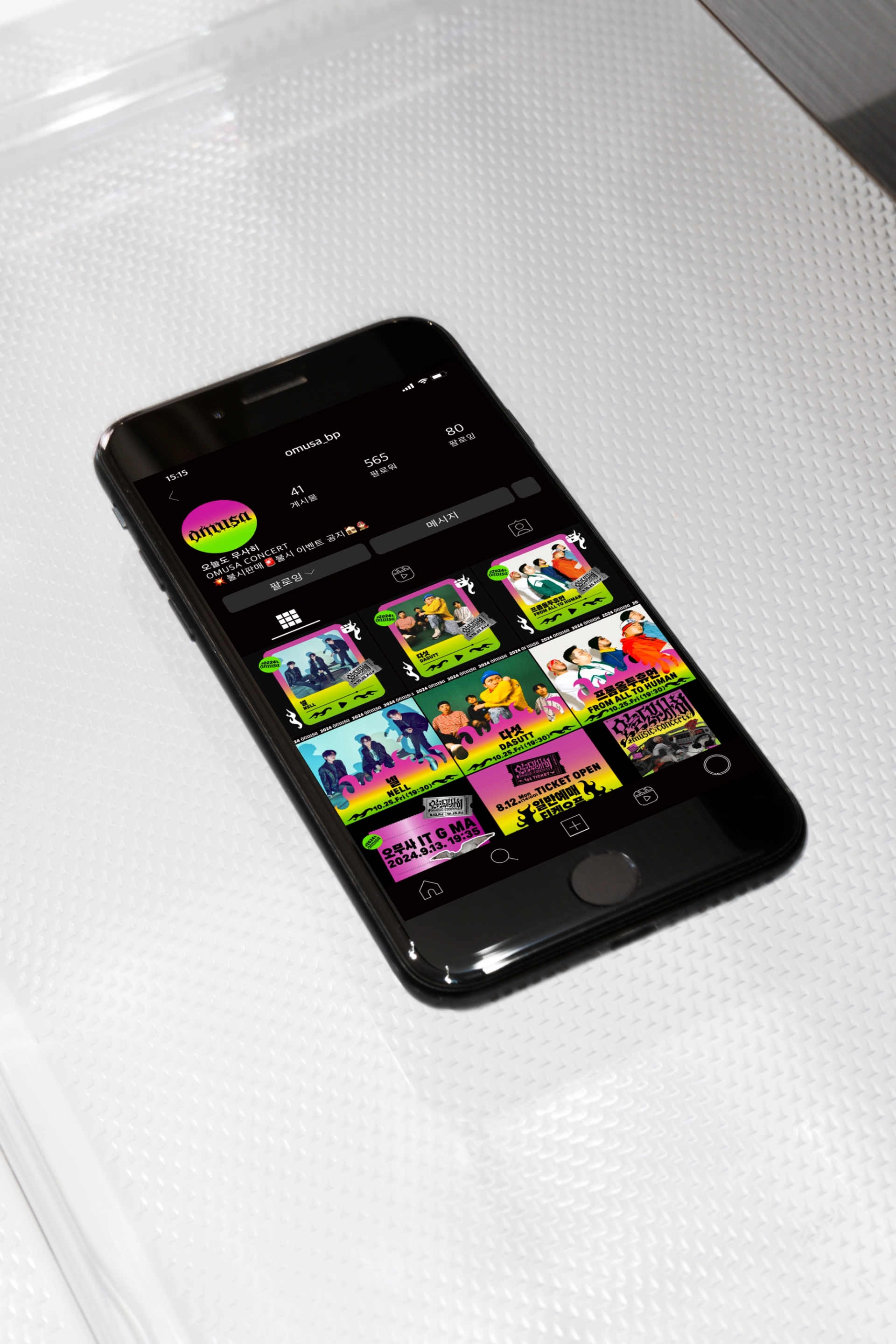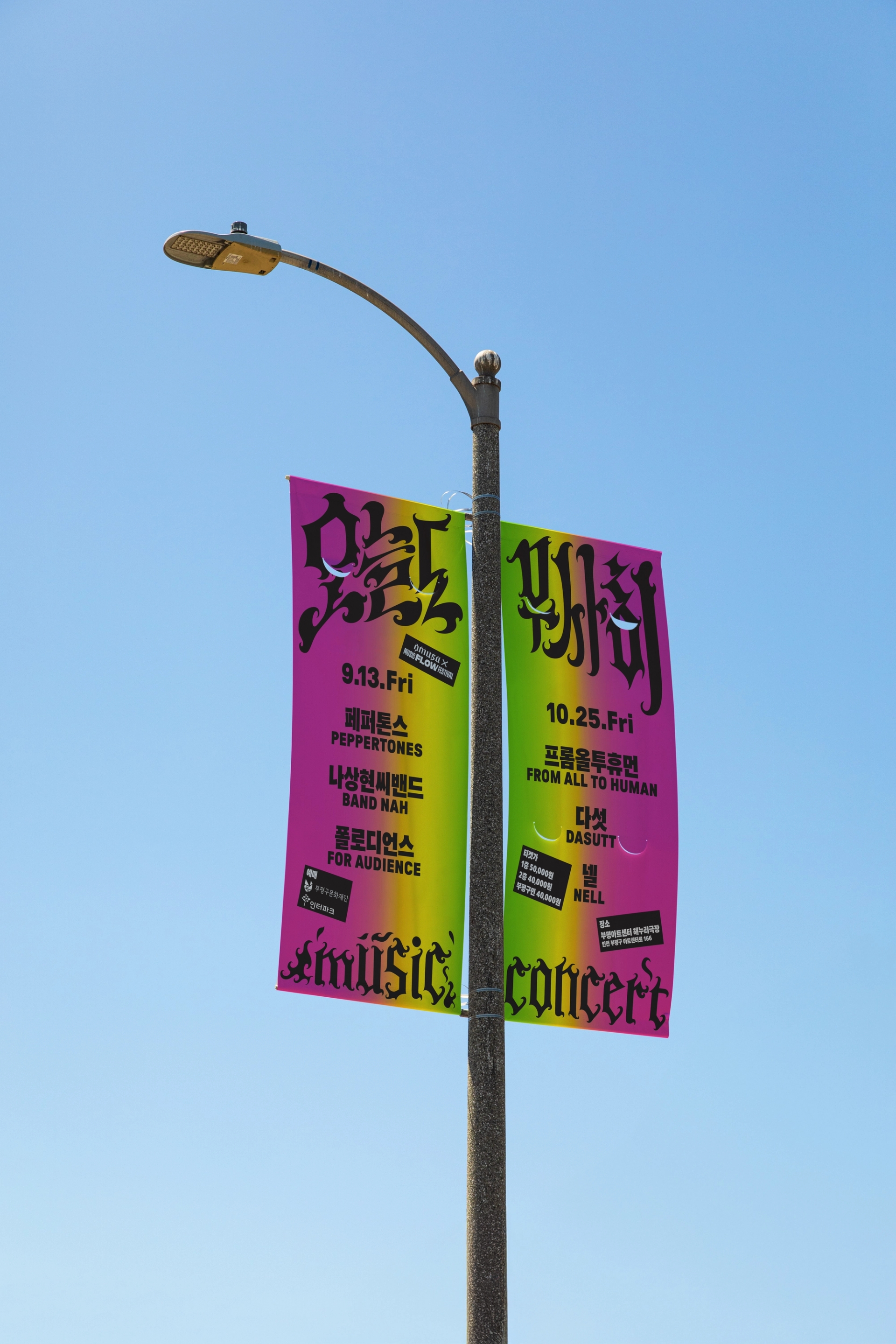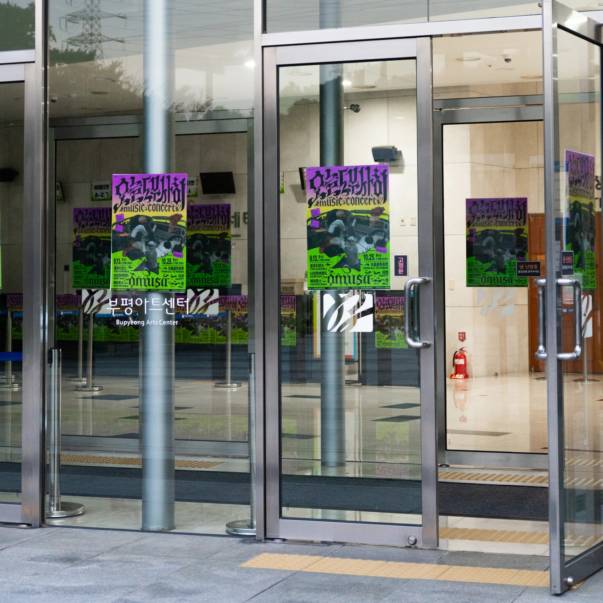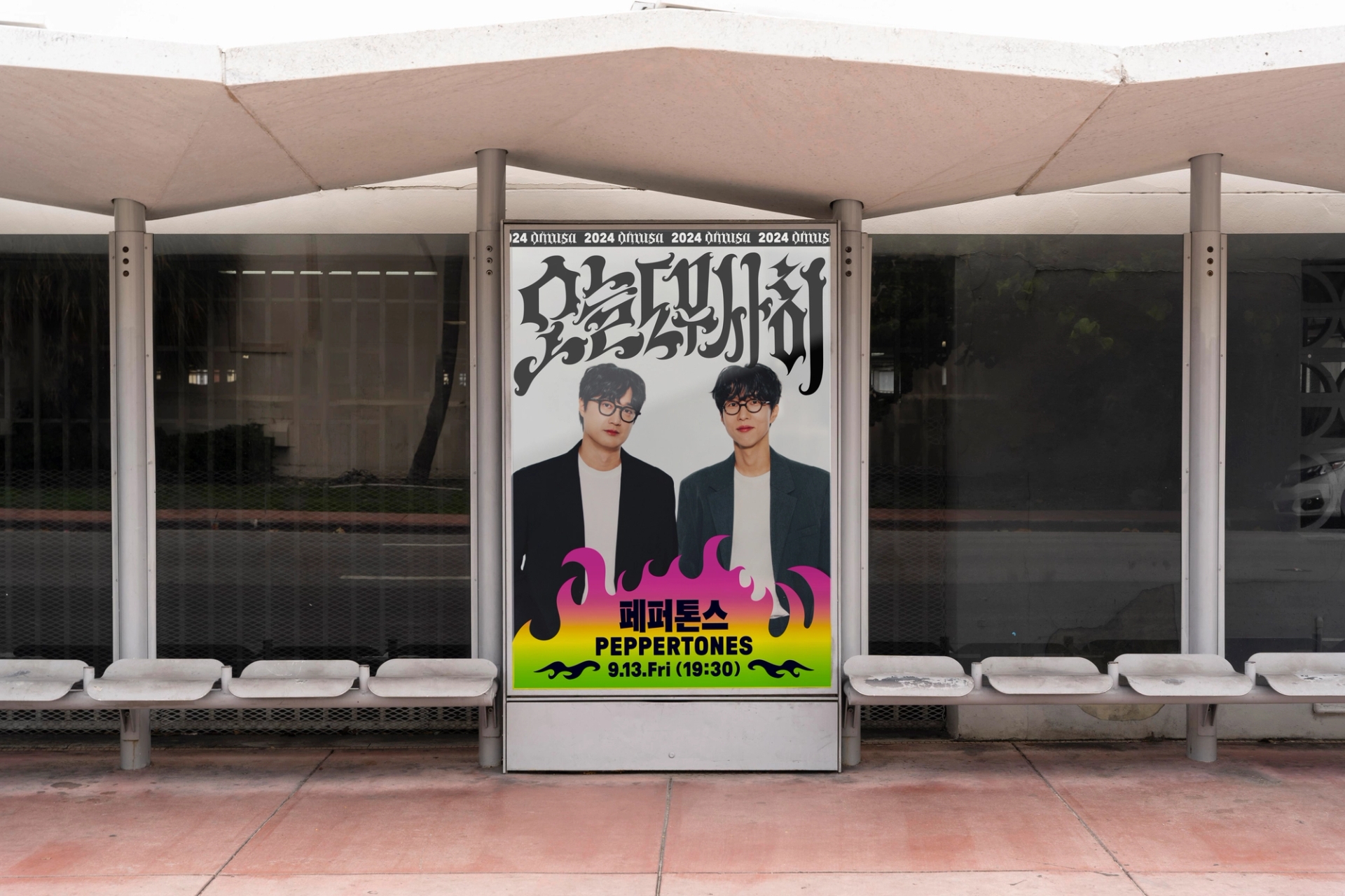 나에게로 날아오는 비둘기, 폭파된 차량, 고함치는 직장 상사, 방전된 휴대폰, 쉴새없이 윙윙대는 모기 … 현대인의 공포를 자극하거나, 크고 작은 위협이 되는 존재들을 로우폴리 3D오브젝트를 통해 시각화했습니다. 포스터 지면 곳곳에 빼곡히 배치된 위험요소로부터 ‘오늘도 무사히’ 살아남은 우리를 표현하여, 역설적으로 그러한 위험요소와 투쟁하여 생존했음에 자신감을 얻을 수 있도록 의도하여 디자인했습니다. 위험을 상징하는 오브젝트를 의도적으로 왜곡해 표현함으로서 《오늘도 무사히》 공연을 유머러스하고 트렌디하게 인식하게 만들고, 편견이 만든 프레임에 저항하고 자유를 추구하는 음악의 정신을 표현했습니다. 이글이글 타오르는 《오늘도 무사히, OMUSA》 타이틀 레터링은 공연의 다이내믹함을 암시합니다. 또한 스트릿 아트의 ‘그래피티’ 표현방식을 통해 락, 힙합, DJ, 비보이 등 다양한 서브컬처 음악장르와 맞닿아있는 《오늘도 무사히》의 아이덴티티로 기능하고, 다양한 MD상품으로 확장할 수 있도록 제작했습니다.
