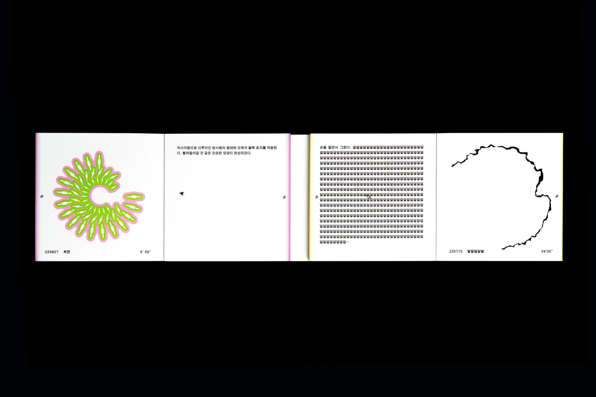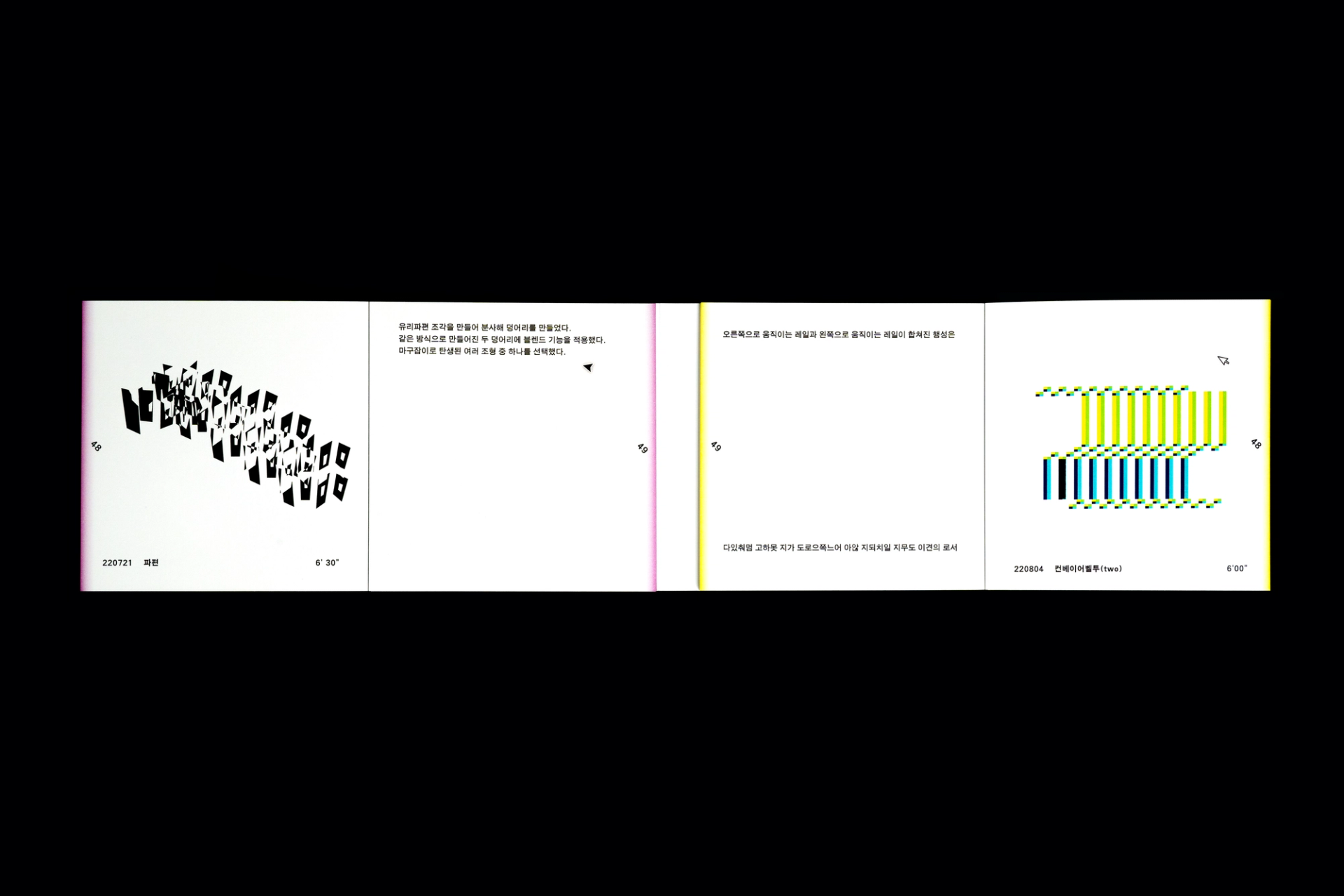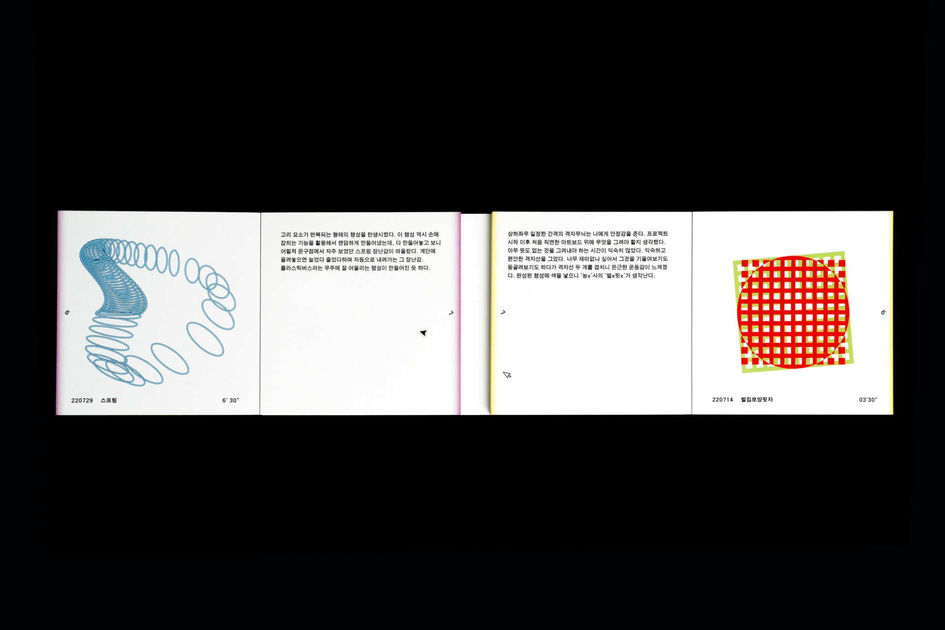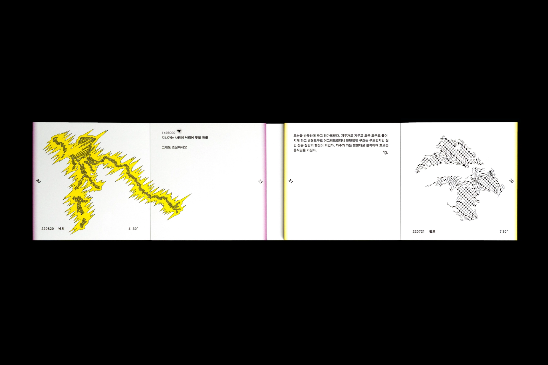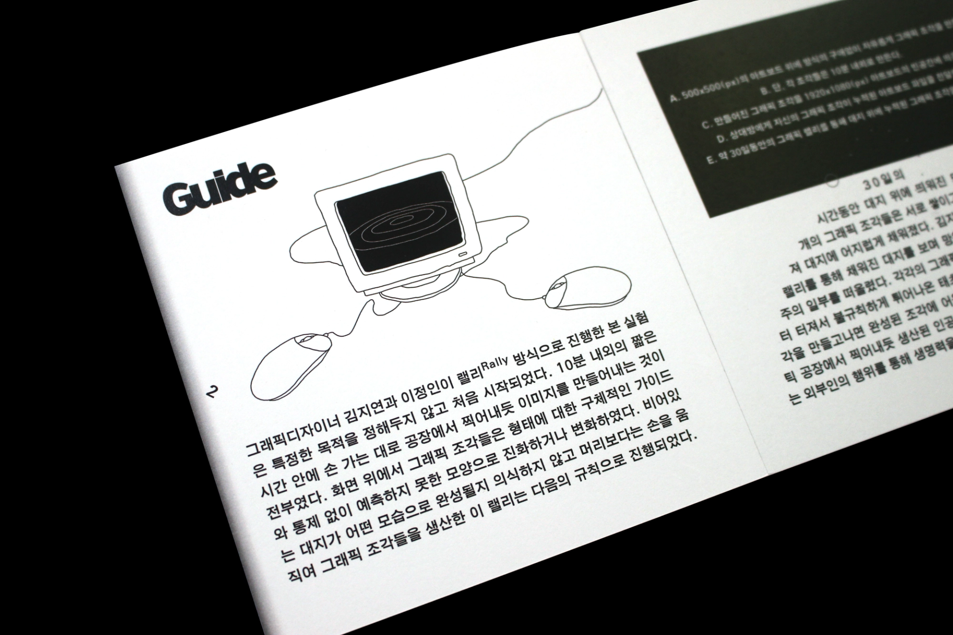그래픽디자이너 김지연과 이정인이 랠리(Rally) 방식으로 진행한 본 실험은 특정한 목적을 정해두지 않고 처음 시작되었다. 10분 내외의 짧은 시간 안에 손 가는 대로 공장에서 찍어내듯 이미지를 만들어내는 것이 전부였다. 화면 위에서 그래픽 조각들은 형태에 대한 구체적인 가이드와 통제 없이 예측하지 못한 모양으로 진화하거나 변화하였다. 비어있는 대지가 어떤 모습으로 완성될지 의식하지 않고 머리보다는 손을 움직여 그래픽 조각들을 생산한 이 랠리는 다음의 규칙으로 진행되었다. A. 500x500(px)의 아트보드 위에 방식의 구애없이 자유롭게 그래픽 조각을 만든다. B. 단, 각 조각들은 10분 내외로 만든다. C. 만들어진 그래픽 조각을 1920x1080(px) 아트보드의 빈공간에 띄운다. D. 상대방에게 자신의 그래픽 조각이 누적된 아트보드 파일을 전달한다. E. 약 30일동안의 그래픽 랠리를 통해 대지 위에 누적된 그래픽 조각을 관찰한다. 30일의 시간동안 대지 위에 띄워진 54개의 그래픽 조각들은 서로 쌓이고 또 포개져 대지에 어지럽게 채워졌다. 김지연과 이정인은 랠리를 통해 채워진 대지를 보며 망원경으로 관측한 우주의 일부를 떠올렸다. 각각의 그래픽 조각들은 한 점으로부 터 터져서 불규칙하게 튀어나온 태초의 행성들과 닮아있다. 조각을 만들고나면 완성된 조각에 어울리는 이름을 지었다. 플라스틱 공장에서 찍어내듯 생산된 인공 조각들은 이름을 붙이고 관찰하는 외부인의 행위를 통해 생명력을 갖게되어 초자연적 우주를 이룬다.
