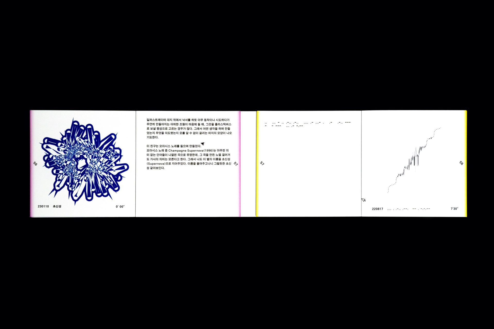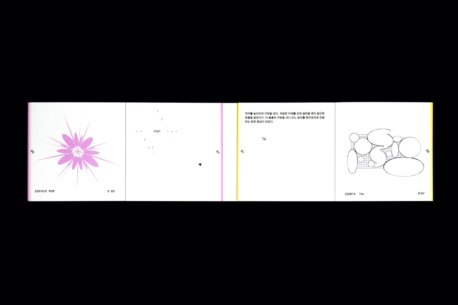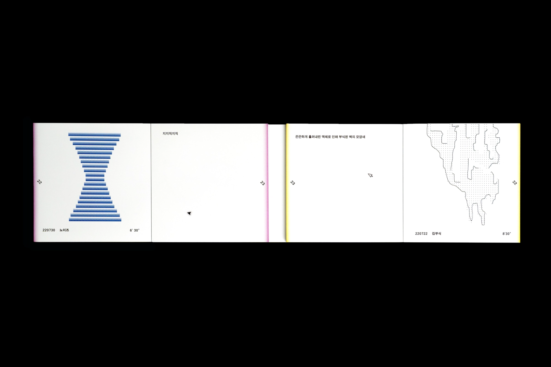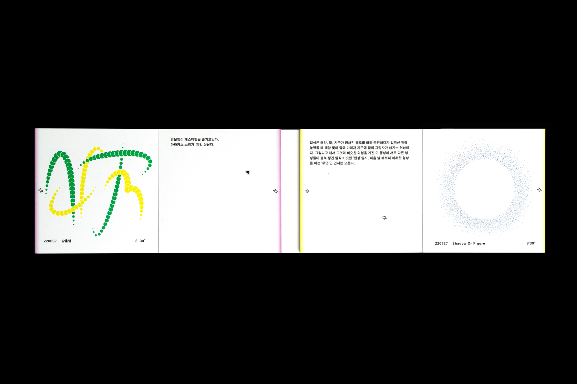 그래픽디자이너 김지연과 이정인이 랠리(Rally) 방식으로 진행한 본 실험은 특정한 목적을 정해두지 않고 처음 시작되었다. 10분 내외의 짧은 시간 안에 손 가는 대로 공장에서 찍어내듯 이미지를 만들어내는 것이 전부였다. 화면 위에서 그래픽 조각들은 형태에 대한 구체적인 가이드와 통제 없이 예측하지 못한 모양으로 진화하거나 변화하였다. 비어있는 대지가 어떤 모습으로 완성될지 의식하지 않고 머리보다는 손을 움직여 그래픽 조각들을 생산한 이 랠리는 다음의 규칙으로 진행되었다. A. 500x500(px)의 아트보드 위에 방식의 구애없이 자유롭게 그래픽 조각을 만든다. B. 단, 각 조각들은 10분 내외로 만든다. C. 만들어진 그래픽 조각을 1920x1080(px) 아트보드의 빈공간에 띄운다. D. 상대방에게 자신의 그래픽 조각이 누적된 아트보드 파일을 전달한다. E. 약 30일동안의 그래픽 랠리를 통해 대지 위에 누적된 그래픽 조각을 관찰한다. 30일의 시간동안 대지 위에 띄워진 54개의 그래픽 조각들은 서로 쌓이고 또 포개져 대지에 어지럽게 채워졌다. 김지연과 이정인은 랠리를 통해 채워진 대지를 보며 망원경으로 관측한 우주의 일부를 떠올렸다. 각각의 그래픽 조각들은 한 점으로부 터 터져서 불규칙하게 튀어나온 태초의 행성들과 닮아있다. 조각을 만들고나면 완성된 조각에 어울리는 이름을 지었다. 플라스틱 공장에서 찍어내듯 생산된 인공 조각들은 이름을 붙이고 관찰하는 외부인의 행위를 통해 생명력을 갖게되어 초자연적 우주를 이룬다.