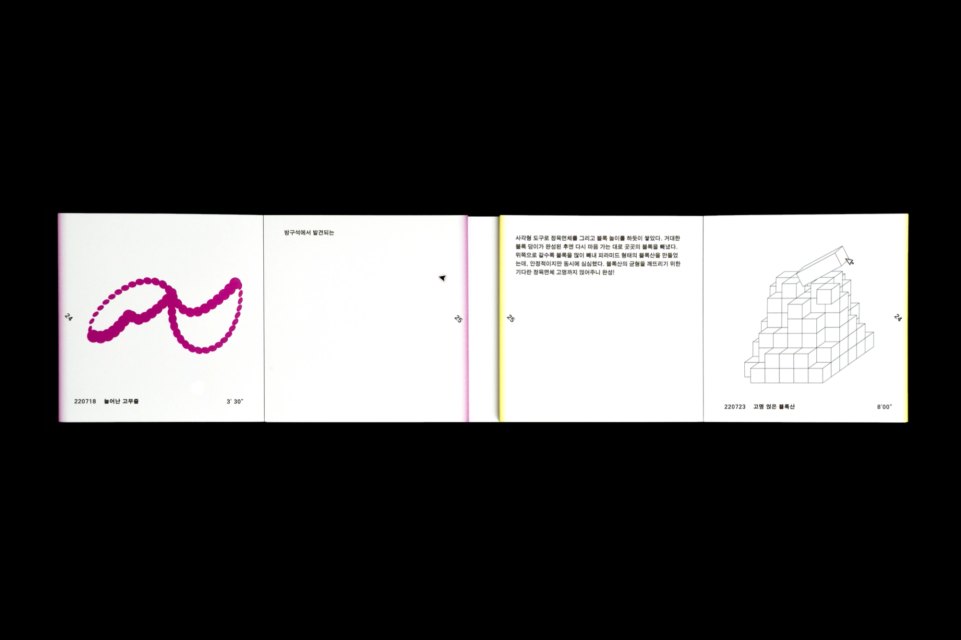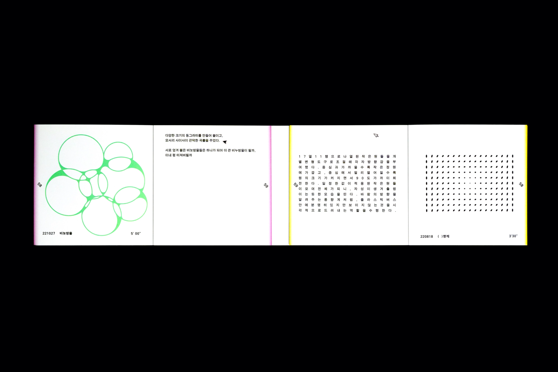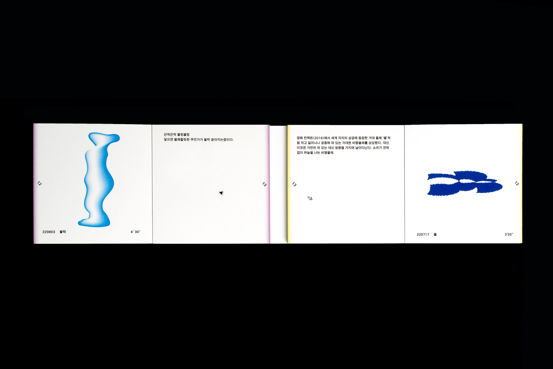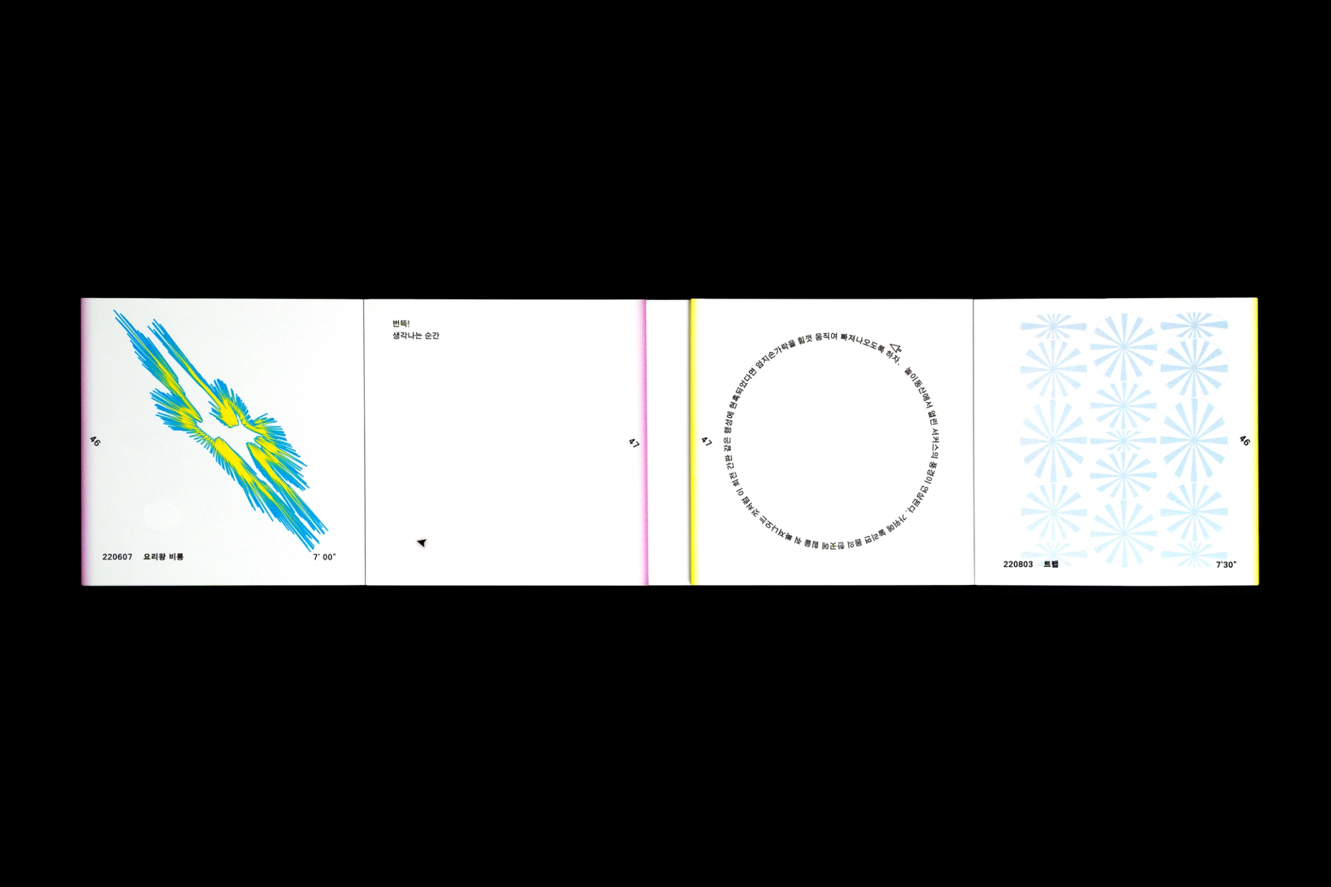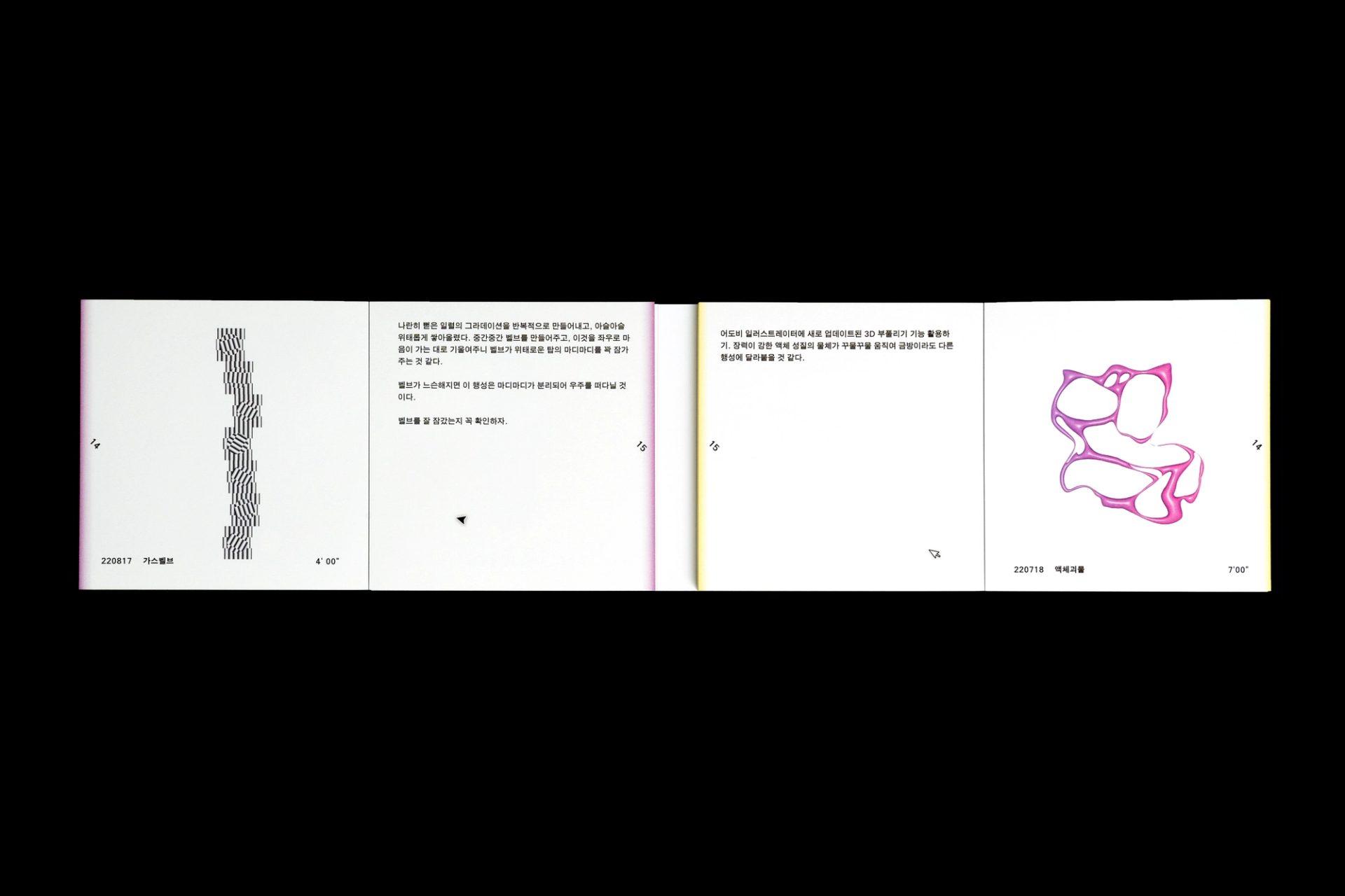 그래픽디자이너 김지연과 이정인이 랠리(Rally) 방식으로 진행한 본 실험은 특정한 목적을 정해두지 않고 처음 시작되었다. 10분 내외의 짧은 시간 안에 손 가는 대로 공장에서 찍어내듯 이미지를 만들어내는 것이 전부였다. 화면 위에서 그래픽 조각들은 형태에 대한 구체적인 가이드와 통제 없이 예측하지 못한 모양으로 진화하거나 변화하였다. 비어있는 대지가 어떤 모습으로 완성될지 의식하지 않고 머리보다는 손을 움직여 그래픽 조각들을 생산한 이 랠리는 다음의 규칙으로 진행되었다. A. 500x500(px)의 아트보드 위에 방식의 구애없이 자유롭게 그래픽 조각을 만든다. B. 단, 각 조각들은 10분 내외로 만든다. C. 만들어진 그래픽 조각을 1920x1080(px) 아트보드의 빈공간에 띄운다. D. 상대방에게 자신의 그래픽 조각이 누적된 아트보드 파일을 전달한다. E. 약 30일동안의 그래픽 랠리를 통해 대지 위에 누적된 그래픽 조각을 관찰한다. 30일의 시간동안 대지 위에 띄워진 54개의 그래픽 조각들은 서로 쌓이고 또 포개져 대지에 어지럽게 채워졌다. 김지연과 이정인은 랠리를 통해 채워진 대지를 보며 망원경으로 관측한 우주의 일부를 떠올렸다. 각각의 그래픽 조각들은 한 점으로부 터 터져서 불규칙하게 튀어나온 태초의 행성들과 닮아있다. 조각을 만들고나면 완성된 조각에 어울리는 이름을 지었다. 플라스틱 공장에서 찍어내듯 생산된 인공 조각들은 이름을 붙이고 관찰하는 외부인의 행위를 통해 생명력을 갖게되어 초자연적 우주를 이룬다.