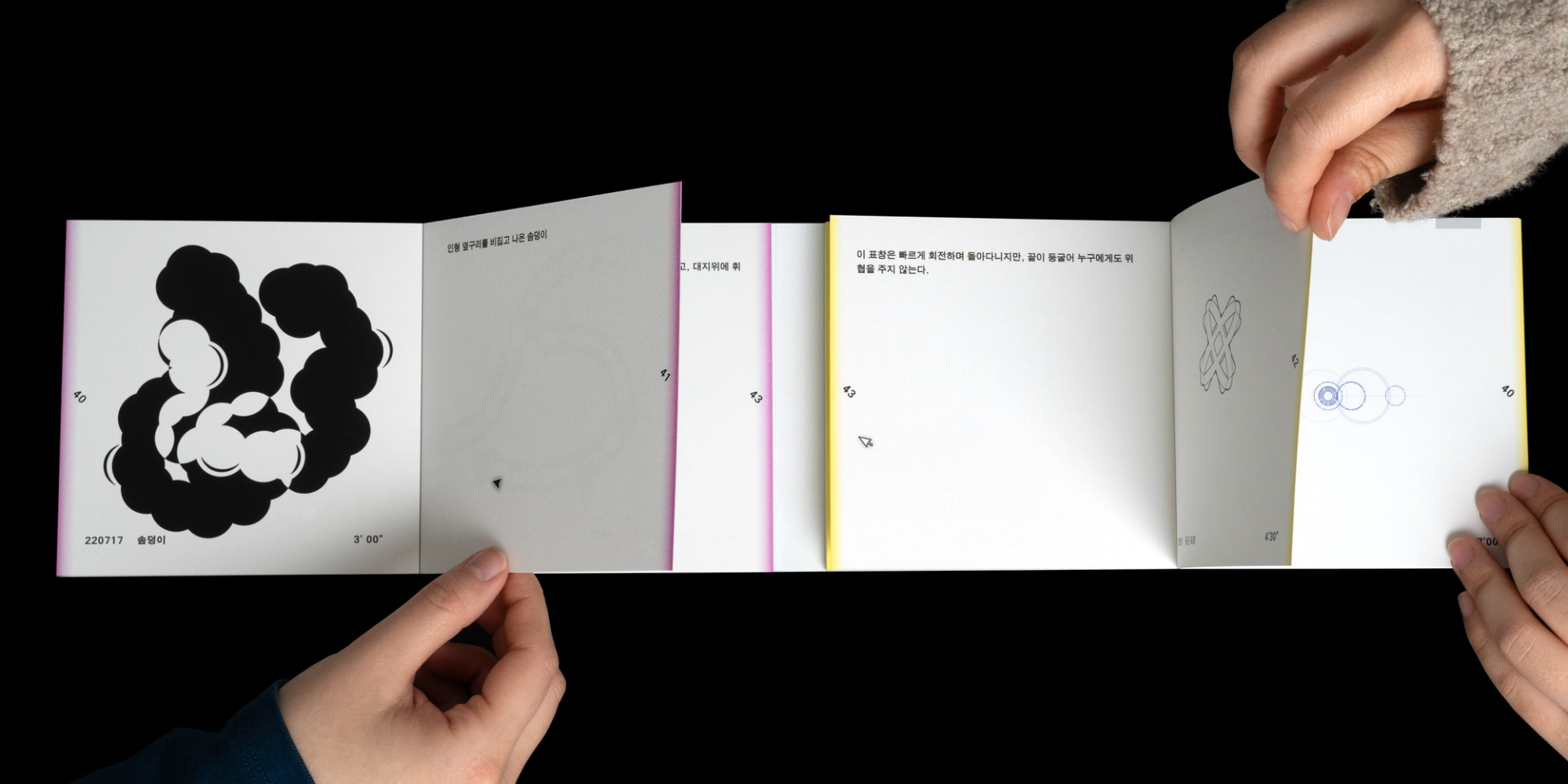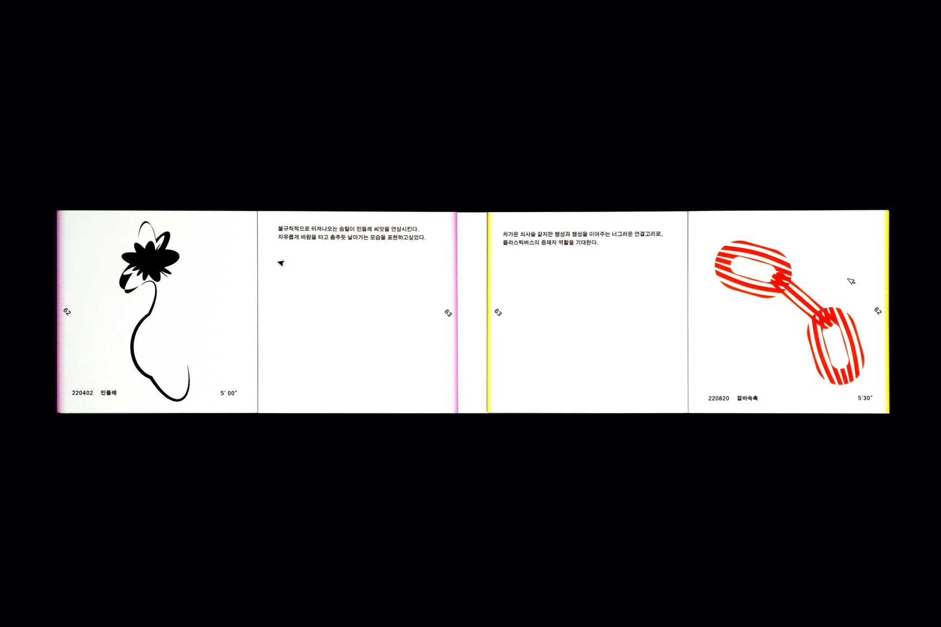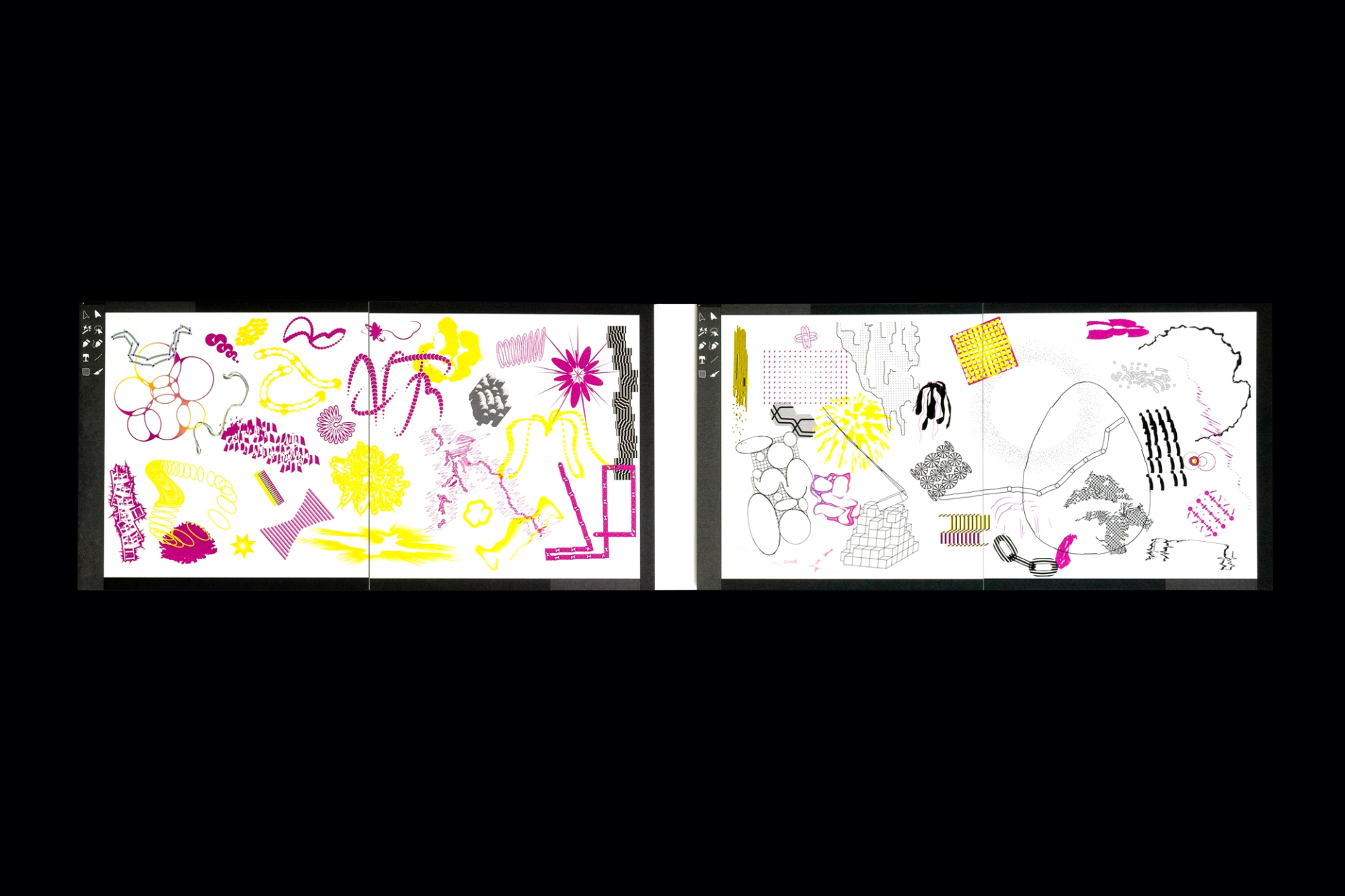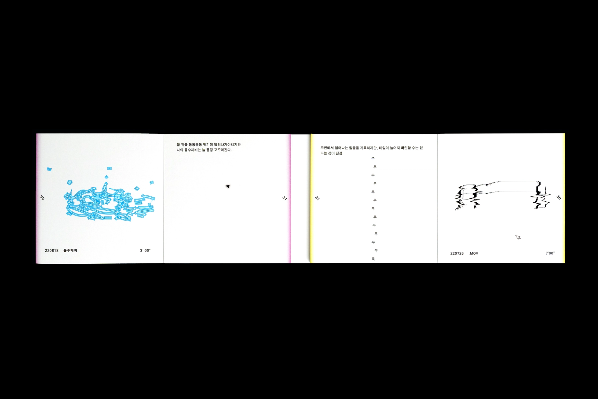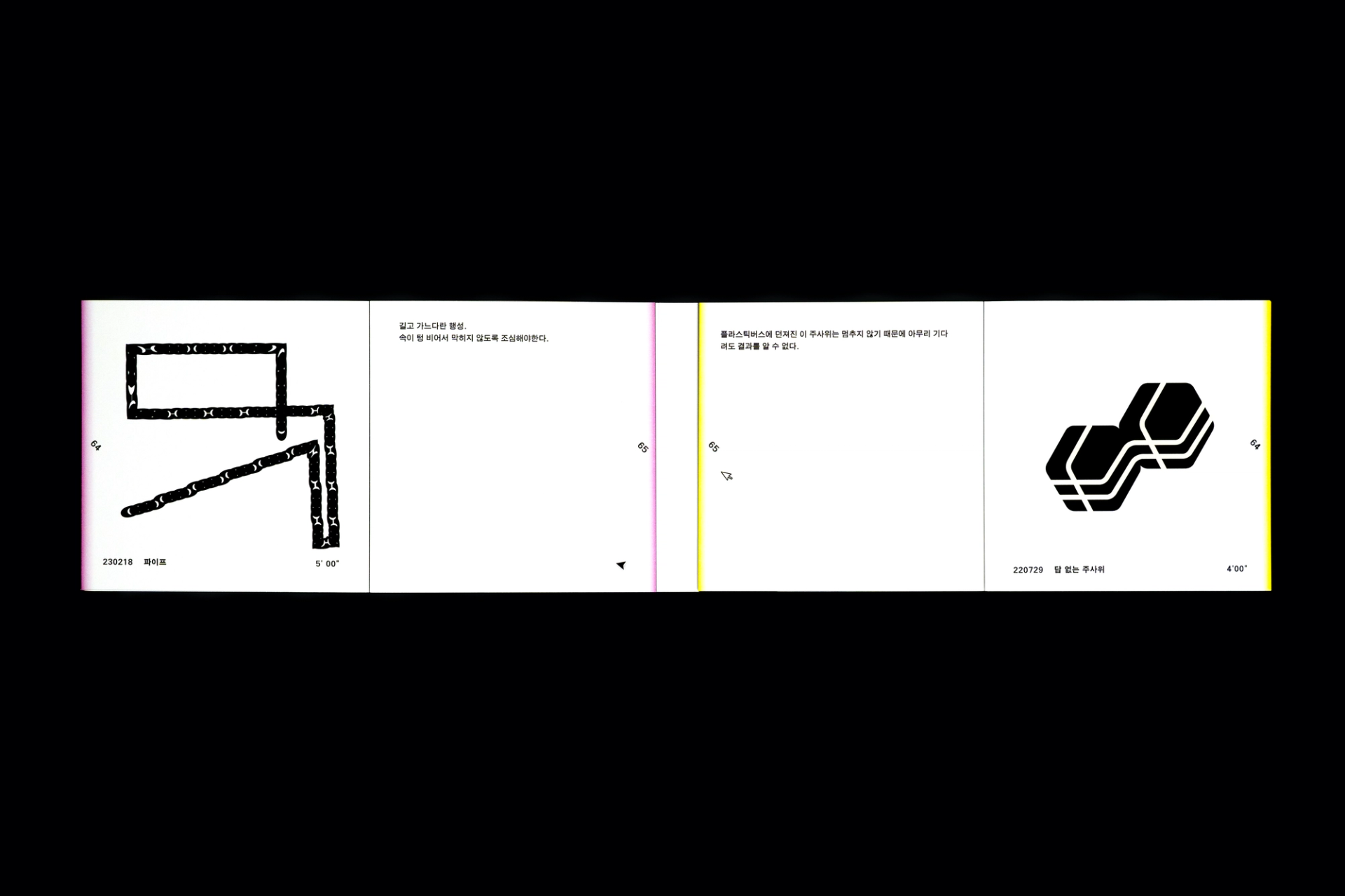 그래픽디자이너 김지연과 이정인이 랠리(Rally) 방식으로 진행한 본 실험은 특정한 목적을 정해두지 않고 처음 시작되었다. 10분 내외의 짧은 시간 안에 손 가는 대로 공장에서 찍어내듯 이미지를 만들어내는 것이 전부였다. 화면 위에서 그래픽 조각들은 형태에 대한 구체적인 가이드와 통제 없이 예측하지 못한 모양으로 진화하거나 변화하였다. 비어있는 대지가 어떤 모습으로 완성될지 의식하지 않고 머리보다는 손을 움직여 그래픽 조각들을 생산한 이 랠리는 다음의 규칙으로 진행되었다. A. 500x500(px)의 아트보드 위에 방식의 구애없이 자유롭게 그래픽 조각을 만든다. B. 단, 각 조각들은 10분 내외로 만든다. C. 만들어진 그래픽 조각을 1920x1080(px) 아트보드의 빈공간에 띄운다. D. 상대방에게 자신의 그래픽 조각이 누적된 아트보드 파일을 전달한다. E. 약 30일동안의 그래픽 랠리를 통해 대지 위에 누적된 그래픽 조각을 관찰한다. 30일의 시간동안 대지 위에 띄워진 54개의 그래픽 조각들은 서로 쌓이고 또 포개져 대지에 어지럽게 채워졌다. 김지연과 이정인은 랠리를 통해 채워진 대지를 보며 망원경으로 관측한 우주의 일부를 떠올렸다. 각각의 그래픽 조각들은 한 점으로부 터 터져서 불규칙하게 튀어나온 태초의 행성들과 닮아있다. 조각을 만들고나면 완성된 조각에 어울리는 이름을 지었다. 플라스틱 공장에서 찍어내듯 생산된 인공 조각들은 이름을 붙이고 관찰하는 외부인의 행위를 통해 생명력을 갖게되어 초자연적 우주를 이룬다.