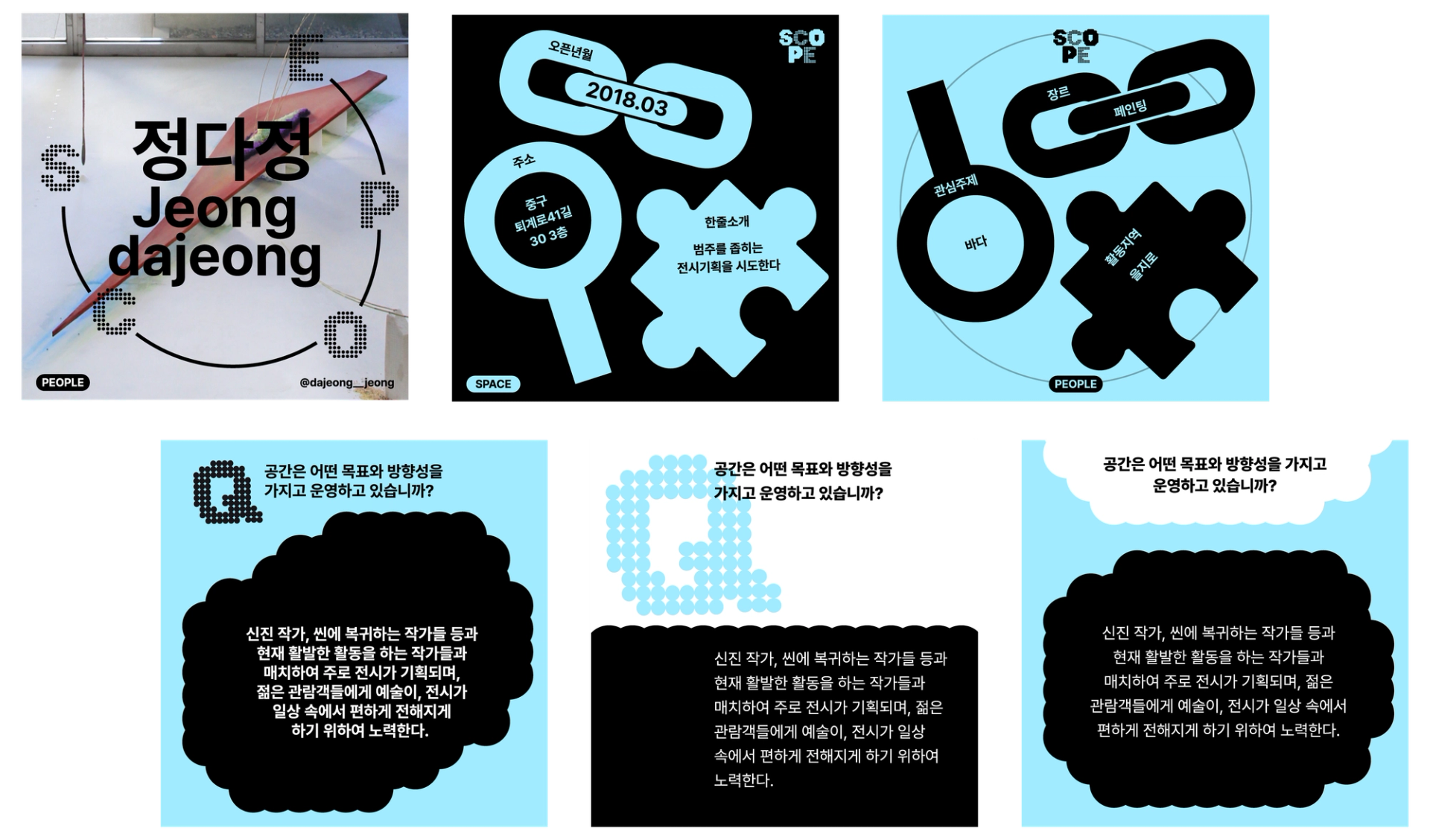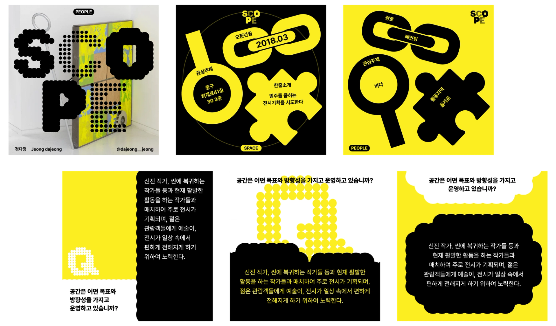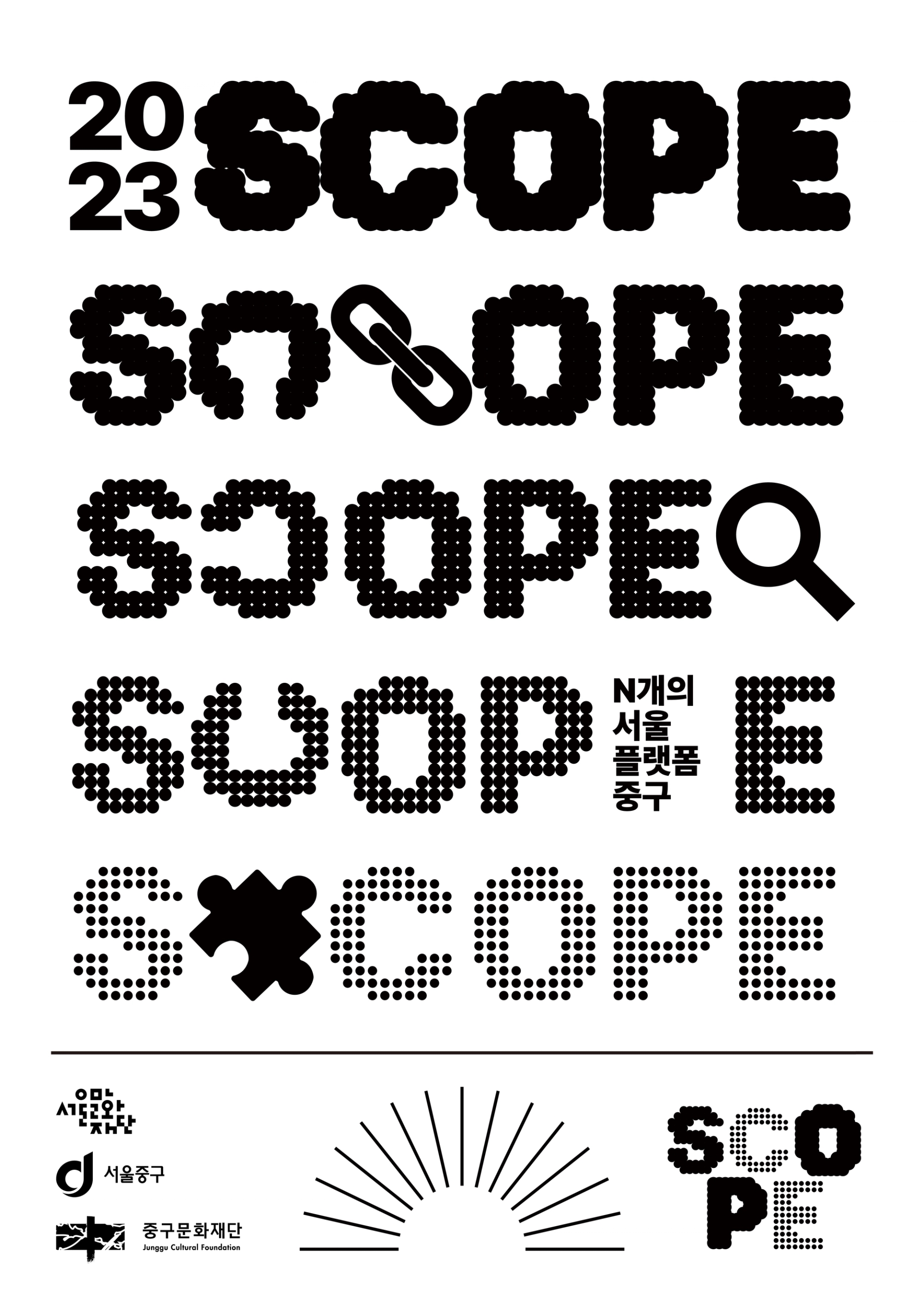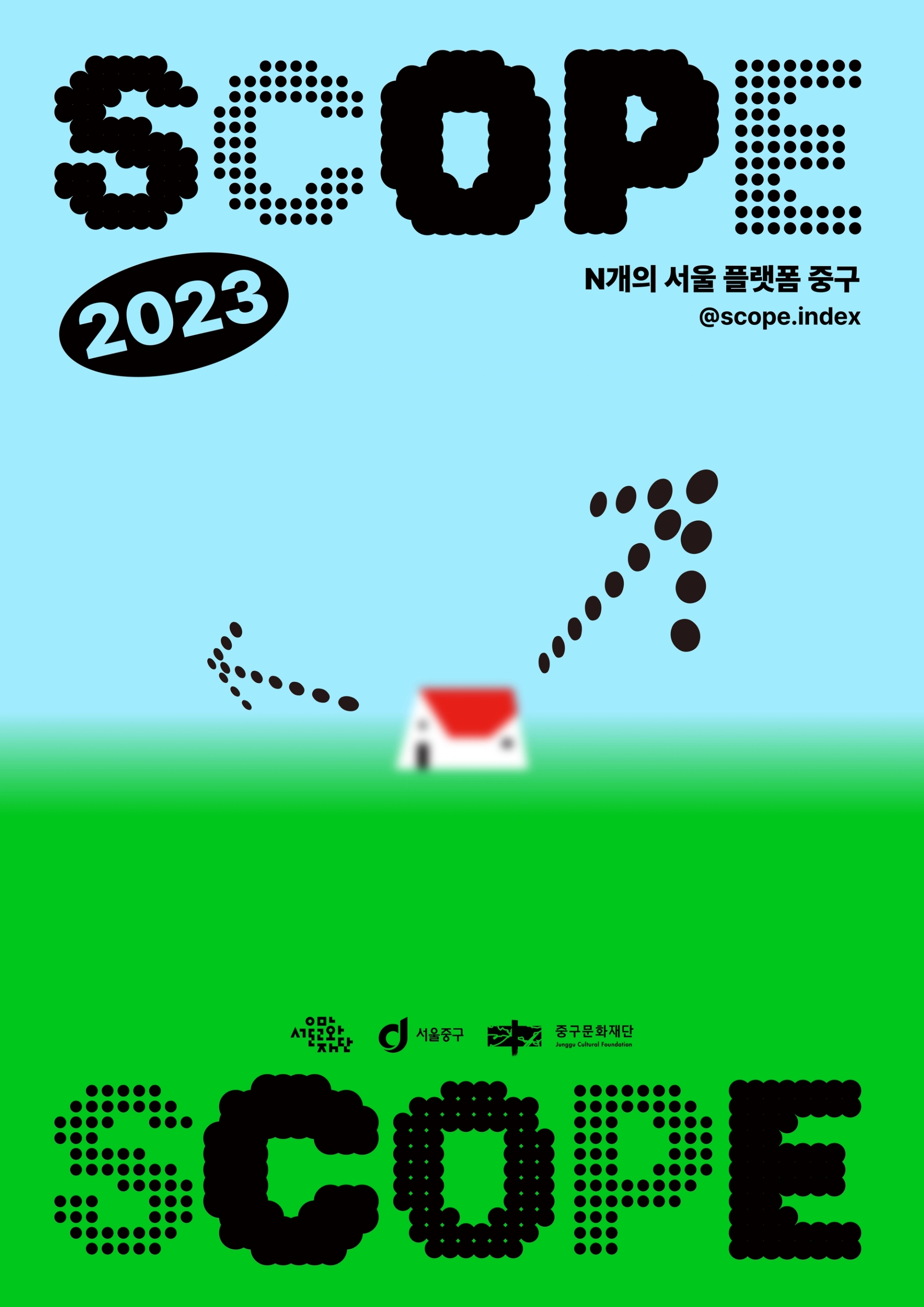 《SCOPE》는 중구의 시각예술을 발견하고 연결시켜주는 플랫폼이다. 《SCOPE》는 시각 예술, 특히 하나의 전시의 구성요소인 공간, 기획자, 작가, 디자이너, 촬영자가 서로를 쉽게 “발견”하고 “연결”되도록 돕는다. 도트아트 표현방식을 통해 《SCOPE》 알파벳이 선명하게 뚜렷해지는 과정을 표현했다. 이는 시력검사를 할 때 흐릿했던 이미지들이 뚜렷하게 보이는 경험을 떠올리게하며, 《SCOPE》의 “발견”이라는 기능을 대변해준다. 도트의 집합으로 이루어진 《SCOPE》의 PI는 스코프 커뮤니티의 다양한 형태를 의미한다. 편안하게 각자의 거리를 유지한채 느슨하게 모여있는 모습과 강한 결속력으로 “연결”되어 하나의 덩어리가 된 모습을 도트의 밀도차이로 다양한 모습을 구성하여 나타냈다. “시력검사”에서 모티프를 따온 포스터 2종은 각각 “시력검사 기기 속 초원 위 빨간 지붕 이미지”와 “시력검사판”을 연상하게한다. 포스터로 인해 시력검사를 할때의 선명해지고 뚜렷해지는 경험을 떠올리게 되며 자연스럽게 스코프의 의미를 이해할 수 있도록 의도했다. 포스터와 SNS이미지 곳곳에 사용된 요소는 “결합”과 “관찰”이라는 키워드를 직간접적으로 상징한다. Assistance. 김정은(@jngnkim) Motion Graphic. 차상우(@complexroom)