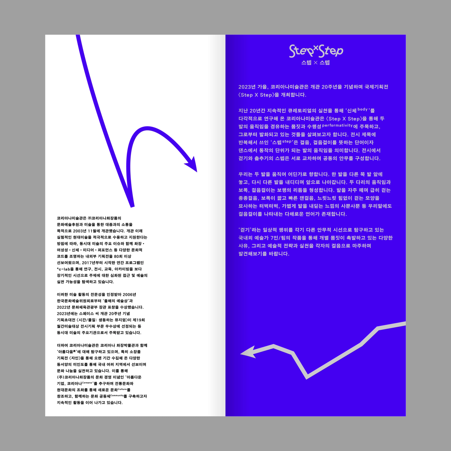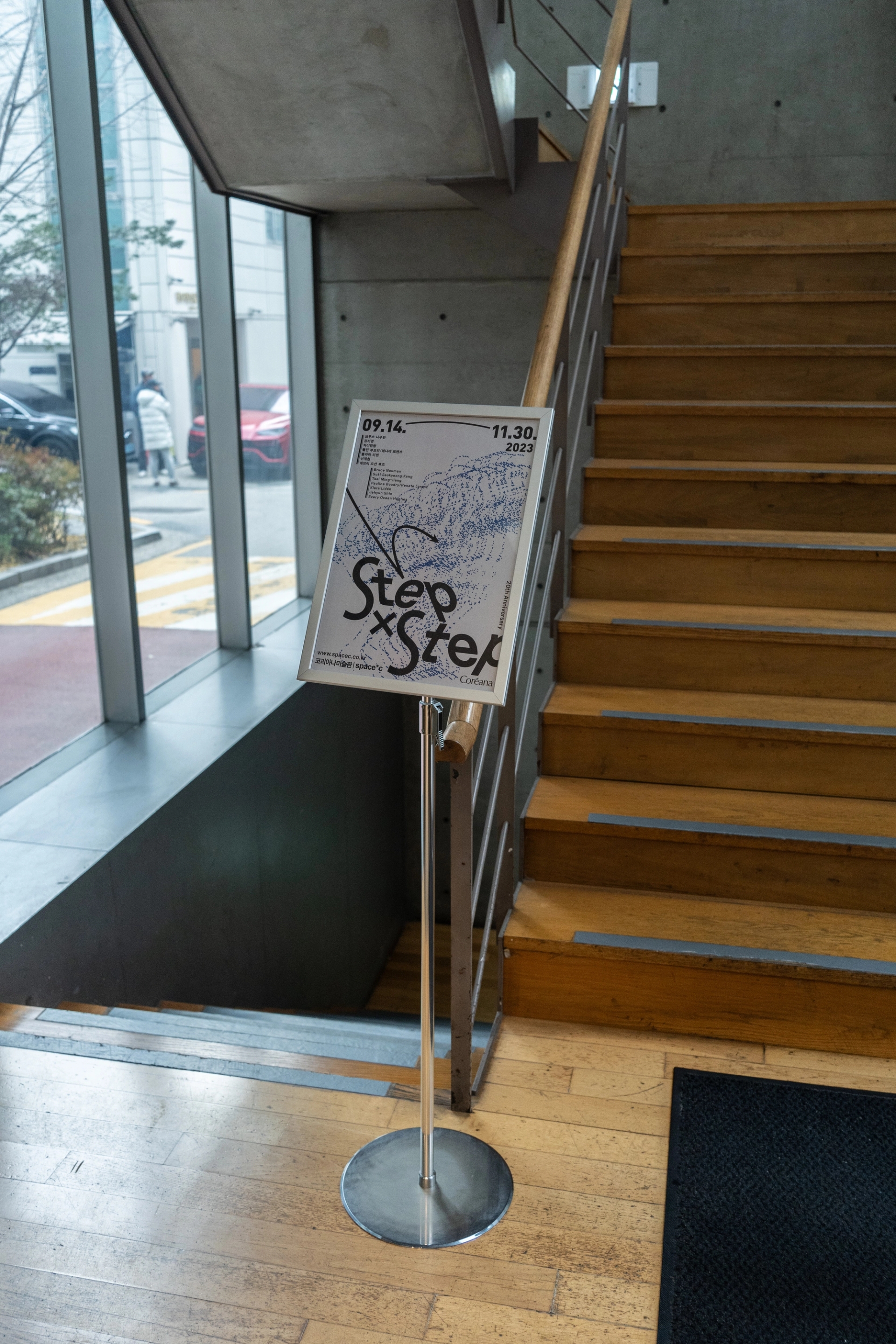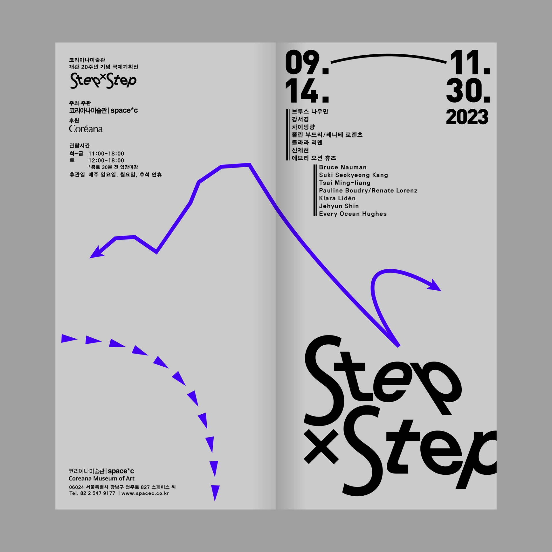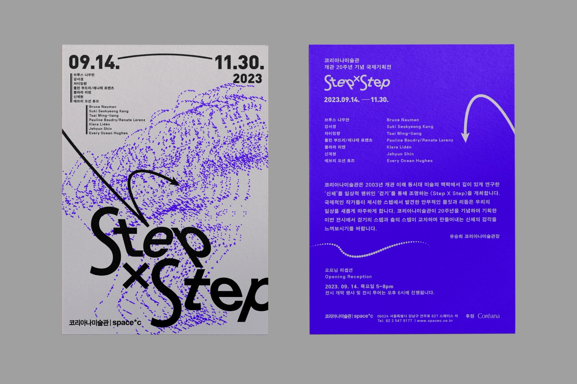 걸음은 ‘박(beat)’을 가진다. 일정한 수의 박이 모여 박자를 만들고, 연속적인 리듬을 만들어낸다. 걷기의 흔적이 발자국이라면, 음악의 발자국을 기록한 것은 악보라고 해석하여 포스터의 전체적인 형태를 악보의 형식에서 본따 제작했다. 전시 시작일과 종료일 사이에는 전시 기간 동안 참여작가 개개인의 걸음이 지속된다는 의미에서 악상기호 이음줄을 사용하고, 참여작가 크레딧과 악보의 마디 기호를 함께 표기하여 걷기와 음악을 연관 지어 표현했다. 포스터는 상하가 분리된 레이아웃처럼 보이게 제작하였으며 타이틀이 걸어가서 화면밖으로 사라지는 것을 상상할 수 있도록 글씨의 일부를 프레임 밖으로 넘치게 배치했다. 좌우로 번갈아가며 들쑥날쑥 기울여진 타이포그래피는 넘어지지 않기 위해 적절한 타이밍에 계속해서 반대 발을 디디는 ‘걷기’ 동작을 모티프로 하여 만들어졌다. 포스터를 포함하여 전시 그래픽 곳곳에서 보여지는 선형의 그래픽은 각각 2/4박자, 3/4박자, 6/8 박자 지휘법의 일부를 확대하여 디자인 요소로 사용한 것이다. 신체를 경유하는 음악적 행위를 연결짓는 본 전시와 선율의 움직임을 신체로서 표현하게 하는 지휘 기호를 연관지었다. 포스터의 가장 뒷편에는 걸음을 내딛거나 춤을 추고있는 사람의 모습을 반복적으로 촬영한듯한 그래픽이 배치되어 걷기의 행위에 내포된 의미를 확장시켰다. 이는 걷기를 일상적 행위에 제한두지 않고 안무적 몸짓으로 들여다볼 수 있도록 묘사한 것이다. 걸음을 내딛는 순간, 혹은 안무의 한 순간을 포착한듯한 이미지에서 ‘움직임’이라는 요소를 강조하여, 정지된 포스터임에도 움직이는듯한 인상을 받을 수 있도록 의도했다. 이는 디지털영상이 전환될 때의 글리치나 음악의 파동을 연상시키기도한다.