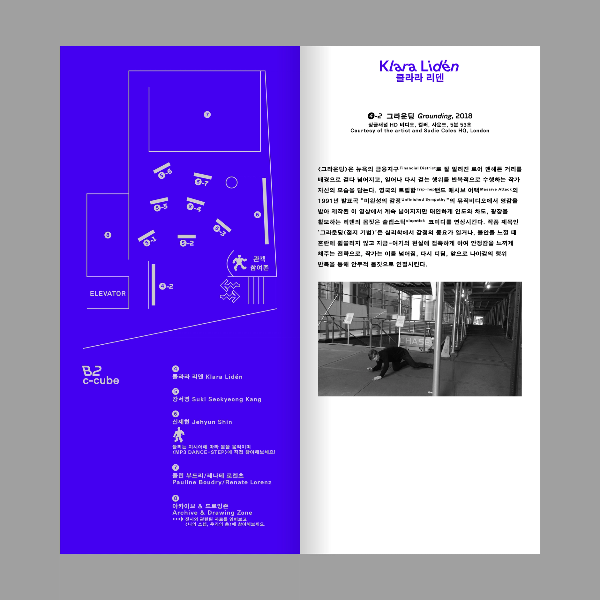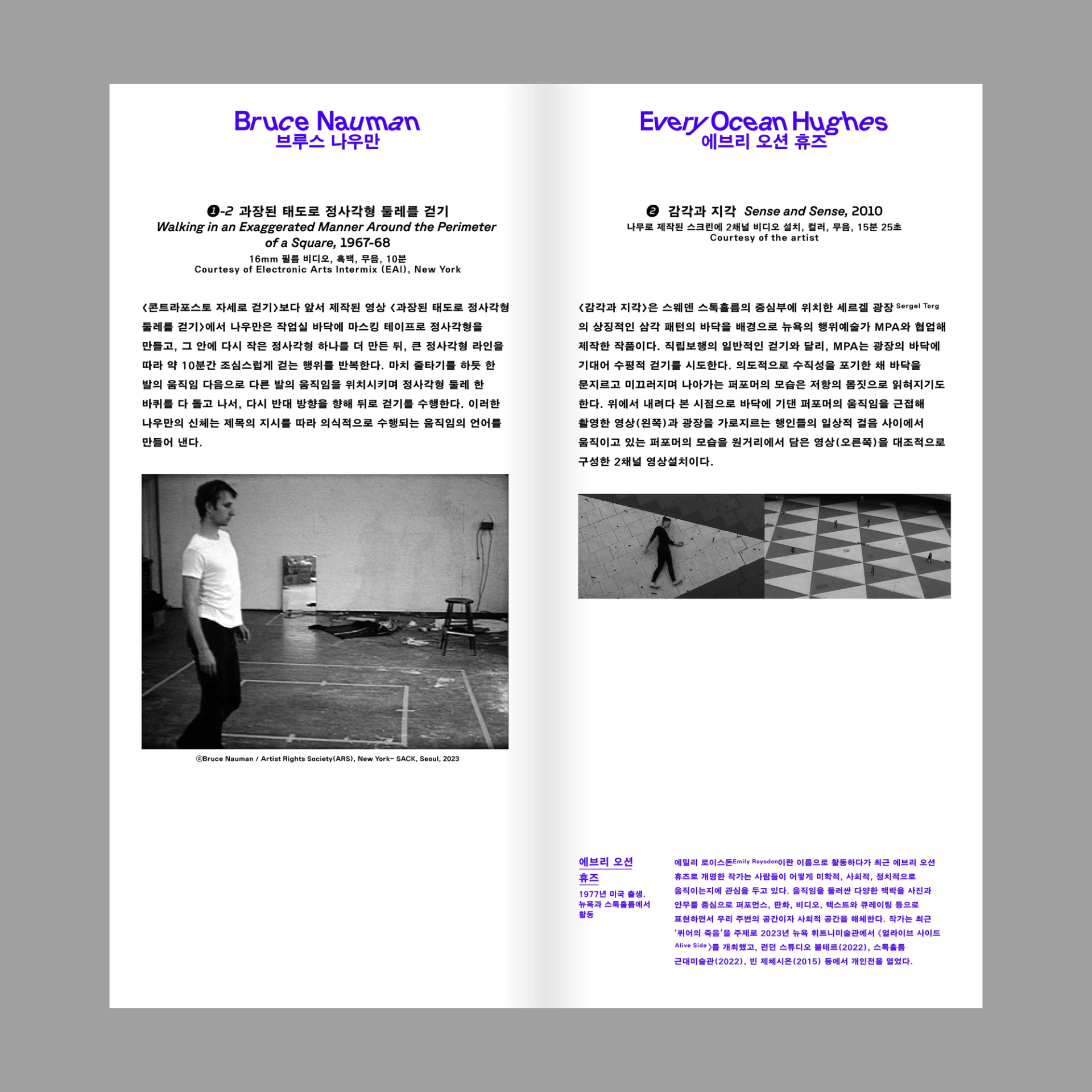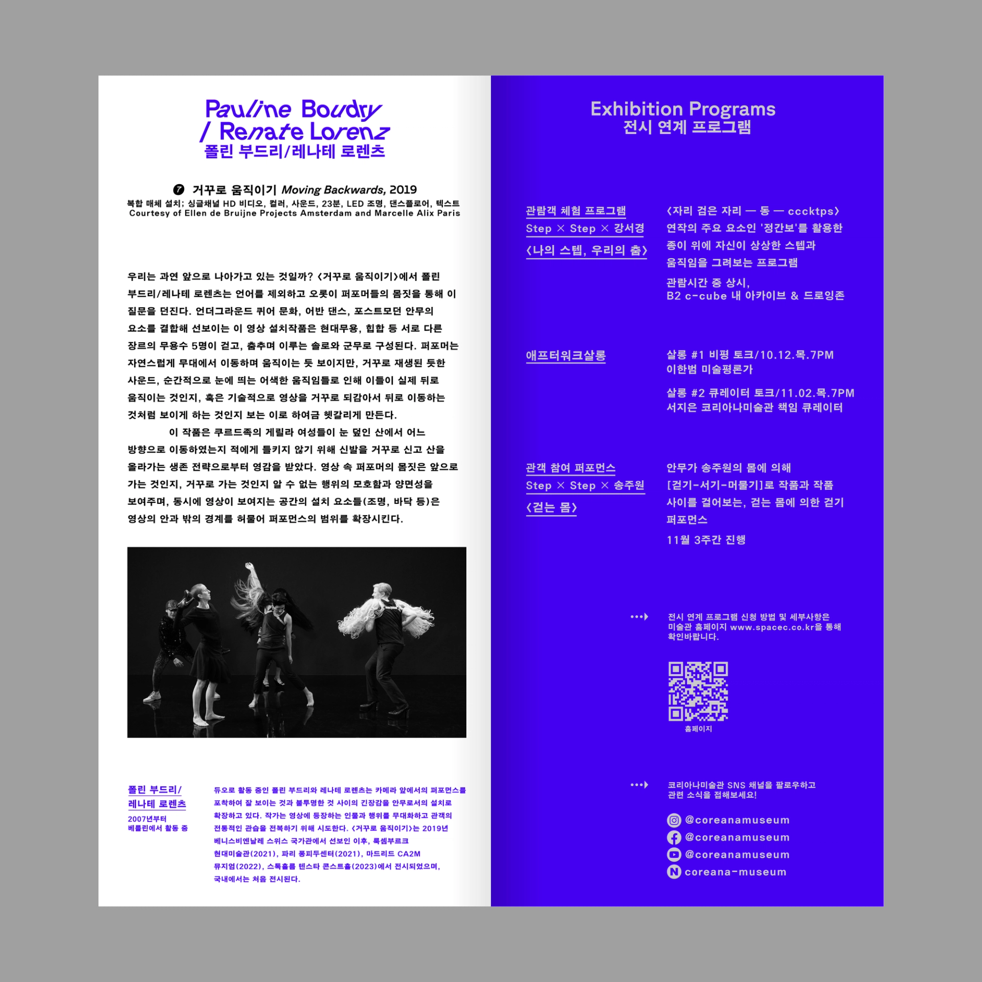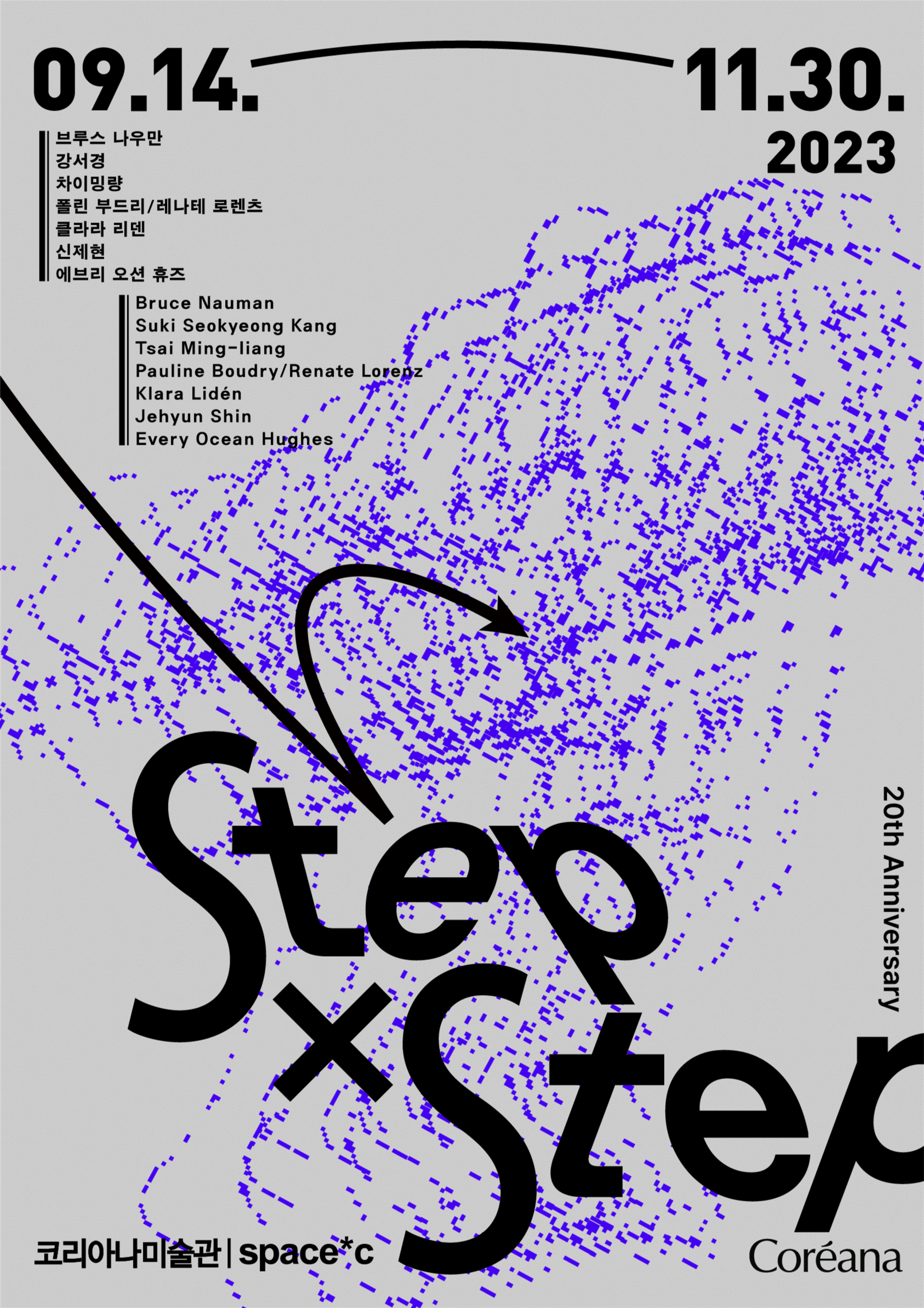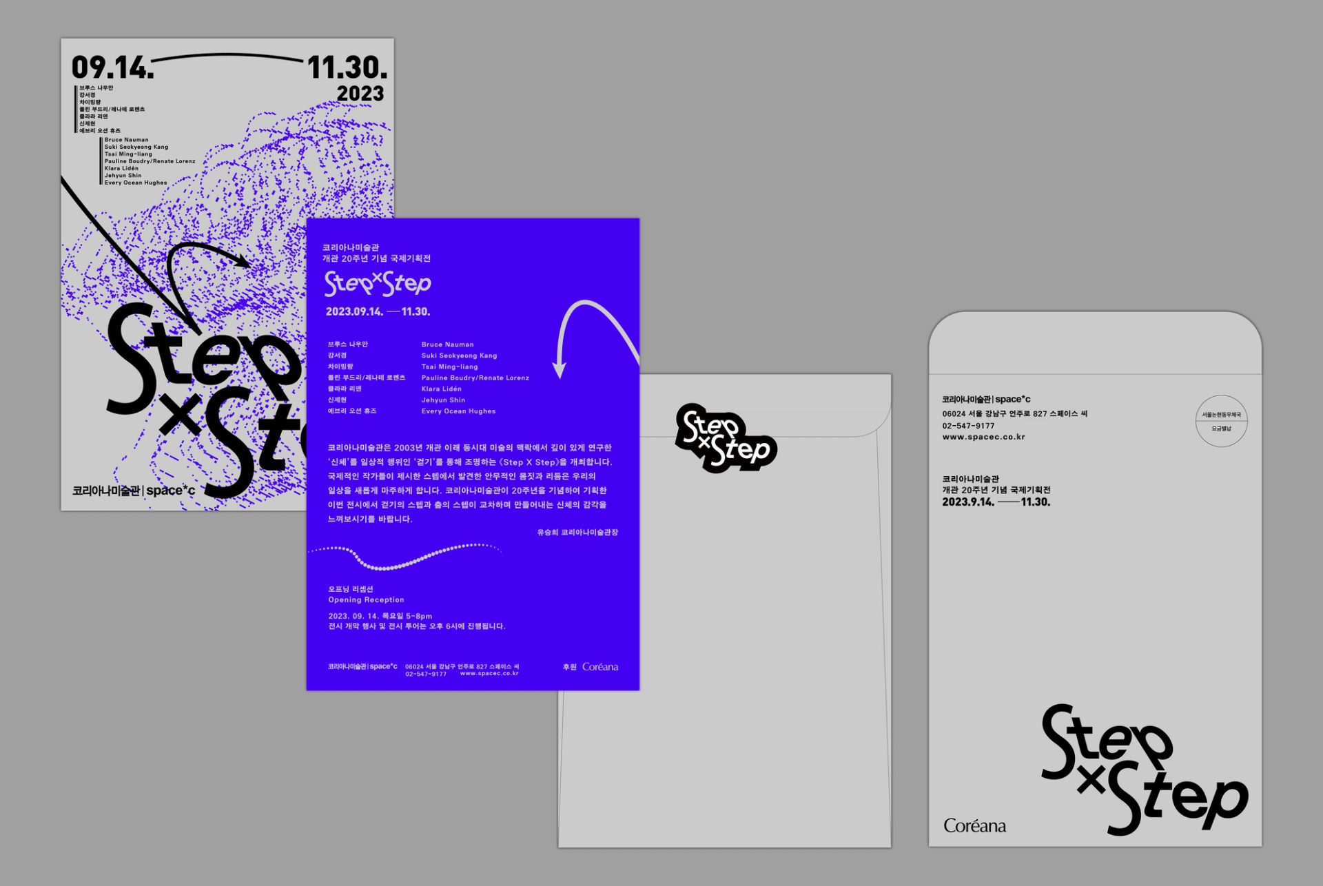걸음은 ‘박(beat)’을 가진다. 일정한 수의 박이 모여 박자를 만들고, 연속적인 리듬을 만들어낸다. 걷기의 흔적이 발자국이라면, 음악의 발자국을 기록한 것은 악보라고 해석하여 포스터의 전체적인 형태를 악보의 형식에서 본따 제작했다. 전시 시작일과 종료일 사이에는 전시 기간 동안 참여작가 개개인의 걸음이 지속된다는 의미에서 악상기호 이음줄을 사용하고, 참여작가 크레딧과 악보의 마디 기호를 함께 표기하여 걷기와 음악을 연관 지어 표현했다. 포스터는 상하가 분리된 레이아웃처럼 보이게 제작하였으며 타이틀이 걸어가서 화면밖으로 사라지는 것을 상상할 수 있도록 글씨의 일부를 프레임 밖으로 넘치게 배치했다. 좌우로 번갈아가며 들쑥날쑥 기울여진 타이포그래피는 넘어지지 않기 위해 적절한 타이밍에 계속해서 반대 발을 디디는 ‘걷기’ 동작을 모티프로 하여 만들어졌다. 포스터를 포함하여 전시 그래픽 곳곳에서 보여지는 선형의 그래픽은 각각 2/4박자, 3/4박자, 6/8 박자 지휘법의 일부를 확대하여 디자인 요소로 사용한 것이다. 신체를 경유하는 음악적 행위를 연결짓는 본 전시와 선율의 움직임을 신체로서 표현하게 하는 지휘 기호를 연관지었다. 포스터의 가장 뒷편에는 걸음을 내딛거나 춤을 추고있는 사람의 모습을 반복적으로 촬영한듯한 그래픽이 배치되어 걷기의 행위에 내포된 의미를 확장시켰다. 이는 걷기를 일상적 행위에 제한두지 않고 안무적 몸짓으로 들여다볼 수 있도록 묘사한 것이다. 걸음을 내딛는 순간, 혹은 안무의 한 순간을 포착한듯한 이미지에서 ‘움직임’이라는 요소를 강조하여, 정지된 포스터임에도 움직이는듯한 인상을 받을 수 있도록 의도했다. 이는 디지털영상이 전환될 때의 글리치나 음악의 파동을 연상시키기도한다.