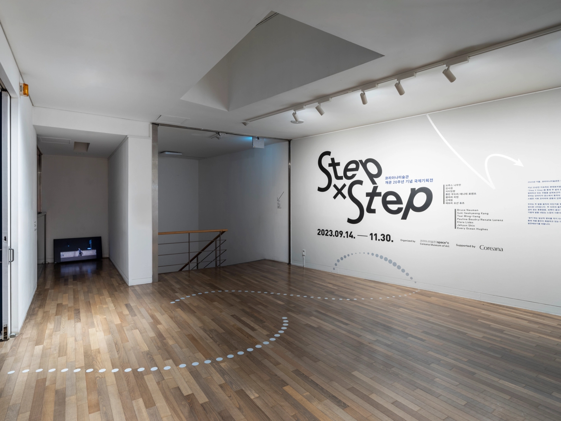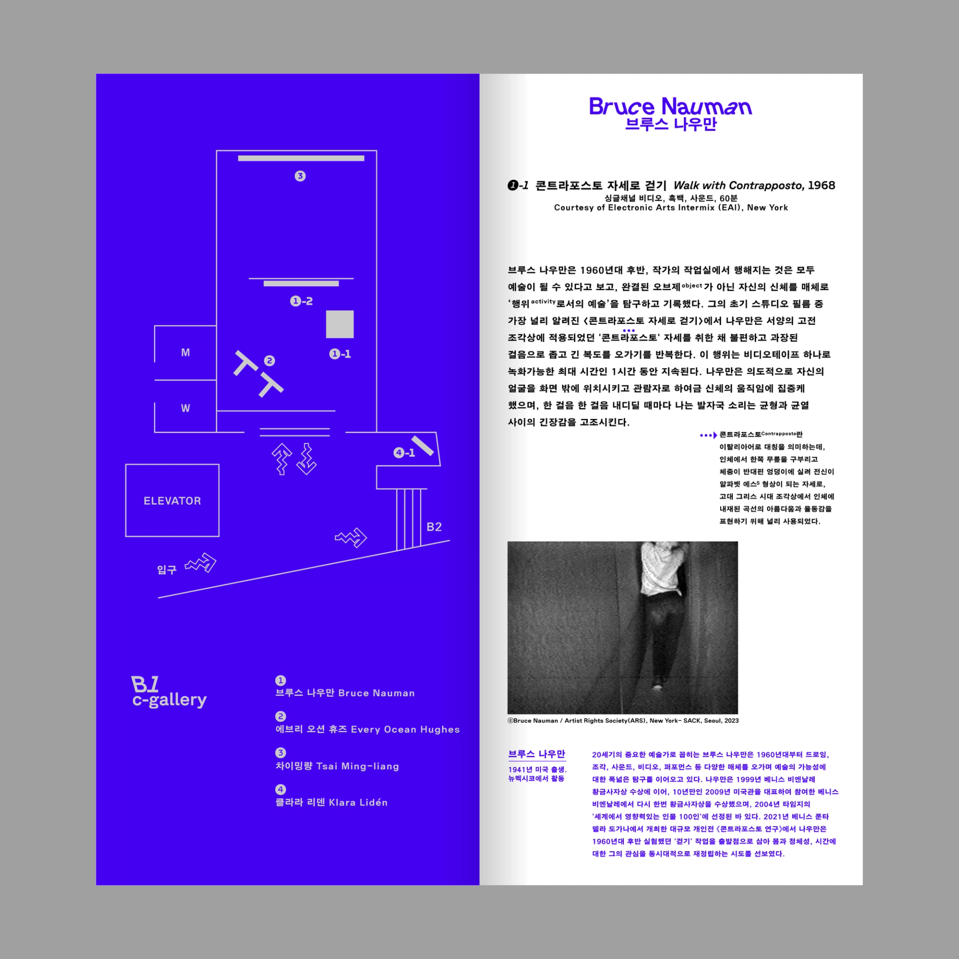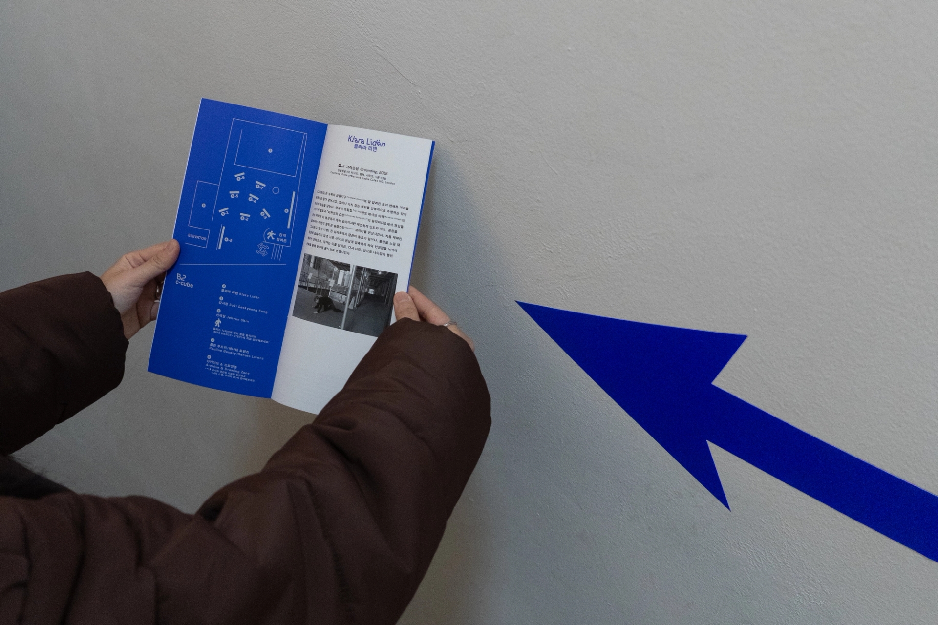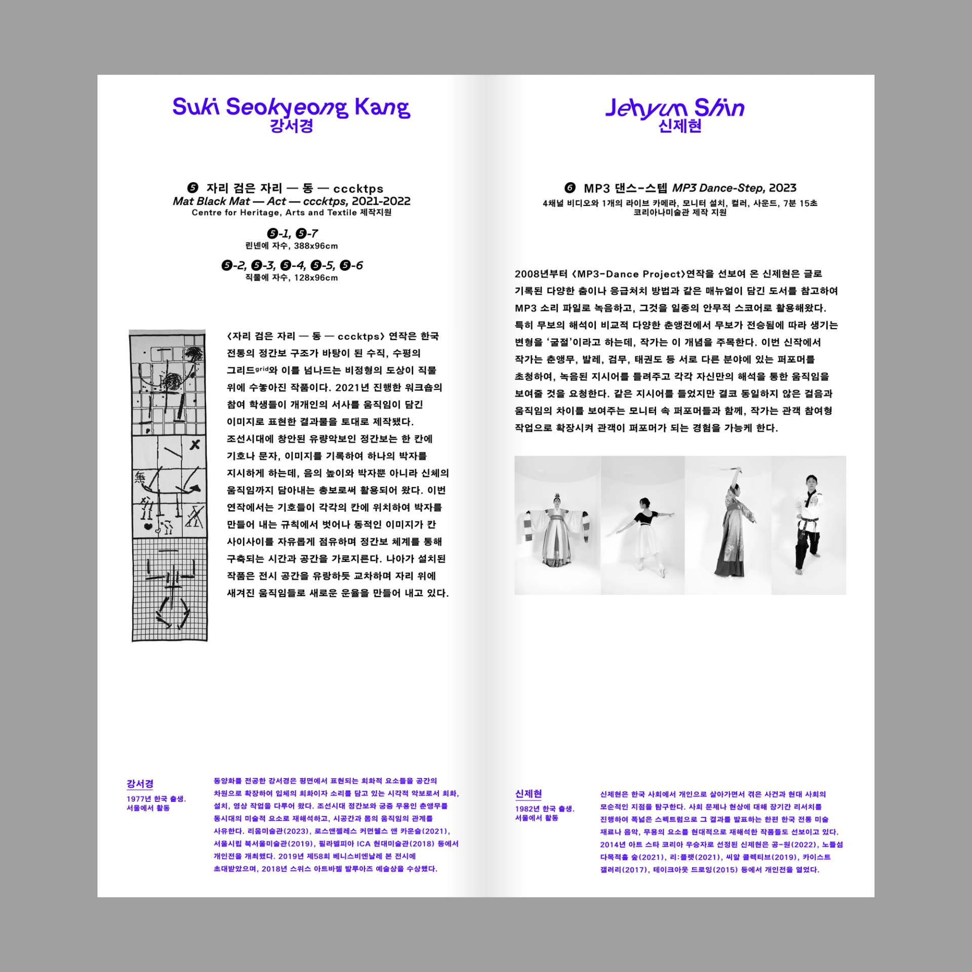걸음은 ‘박(beat)’을 가진다. 일정한 수의 박이 모여 박자를 만들고, 연속적인 리듬을 만들어낸다. 걷기의 흔적이 발자국이라면, 음악의 발자국을 기록한 것은 악보라고 해석하여 포스터의 전체적인 형태를 악보의 형식에서 본따 제작했다. 전시 시작일과 종료일 사이에는 전시 기간 동안 참여작가 개개인의 걸음이 지속된다는 의미에서 악상기호 이음줄을 사용하고, 참여작가 크레딧과 악보의 마디 기호를 함께 표기하여 걷기와 음악을 연관 지어 표현했다. 포스터는 상하가 분리된 레이아웃처럼 보이게 제작하였으며 타이틀이 걸어가서 화면밖으로 사라지는 것을 상상할 수 있도록 글씨의 일부를 프레임 밖으로 넘치게 배치했다. 좌우로 번갈아가며 들쑥날쑥 기울여진 타이포그래피는 넘어지지 않기 위해 적절한 타이밍에 계속해서 반대 발을 디디는 ‘걷기’ 동작을 모티프로 하여 만들어졌다. 포스터를 포함하여 전시 그래픽 곳곳에서 보여지는 선형의 그래픽은 각각 2/4박자, 3/4박자, 6/8 박자 지휘법의 일부를 확대하여 디자인 요소로 사용한 것이다. 신체를 경유하는 음악적 행위를 연결짓는 본 전시와 선율의 움직임을 신체로서 표현하게 하는 지휘 기호를 연관지었다. 포스터의 가장 뒷편에는 걸음을 내딛거나 춤을 추고있는 사람의 모습을 반복적으로 촬영한듯한 그래픽이 배치되어 걷기의 행위에 내포된 의미를 확장시켰다. 이는 걷기를 일상적 행위에 제한두지 않고 안무적 몸짓으로 들여다볼 수 있도록 묘사한 것이다. 걸음을 내딛는 순간, 혹은 안무의 한 순간을 포착한듯한 이미지에서 ‘움직임’이라는 요소를 강조하여, 정지된 포스터임에도 움직이는듯한 인상을 받을 수 있도록 의도했다. 이는 디지털영상이 전환될 때의 글리치나 음악의 파동을 연상시키기도한다.