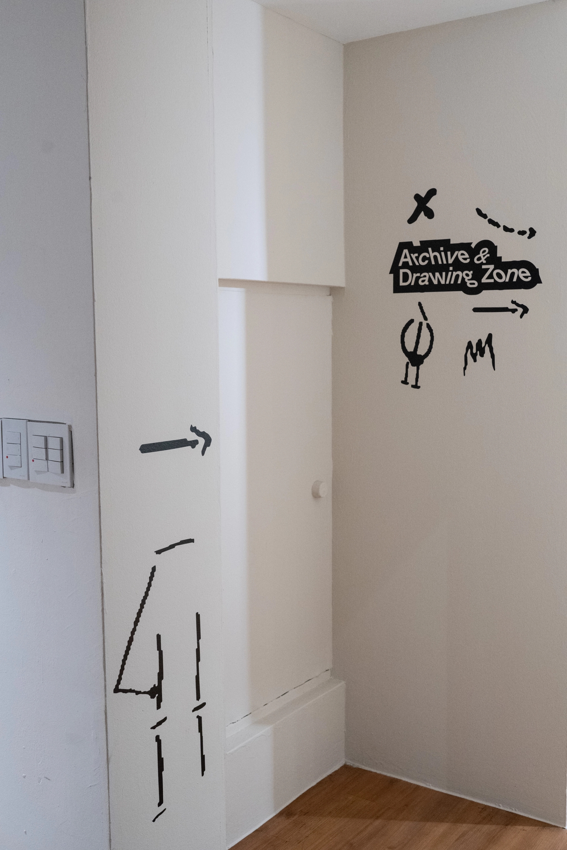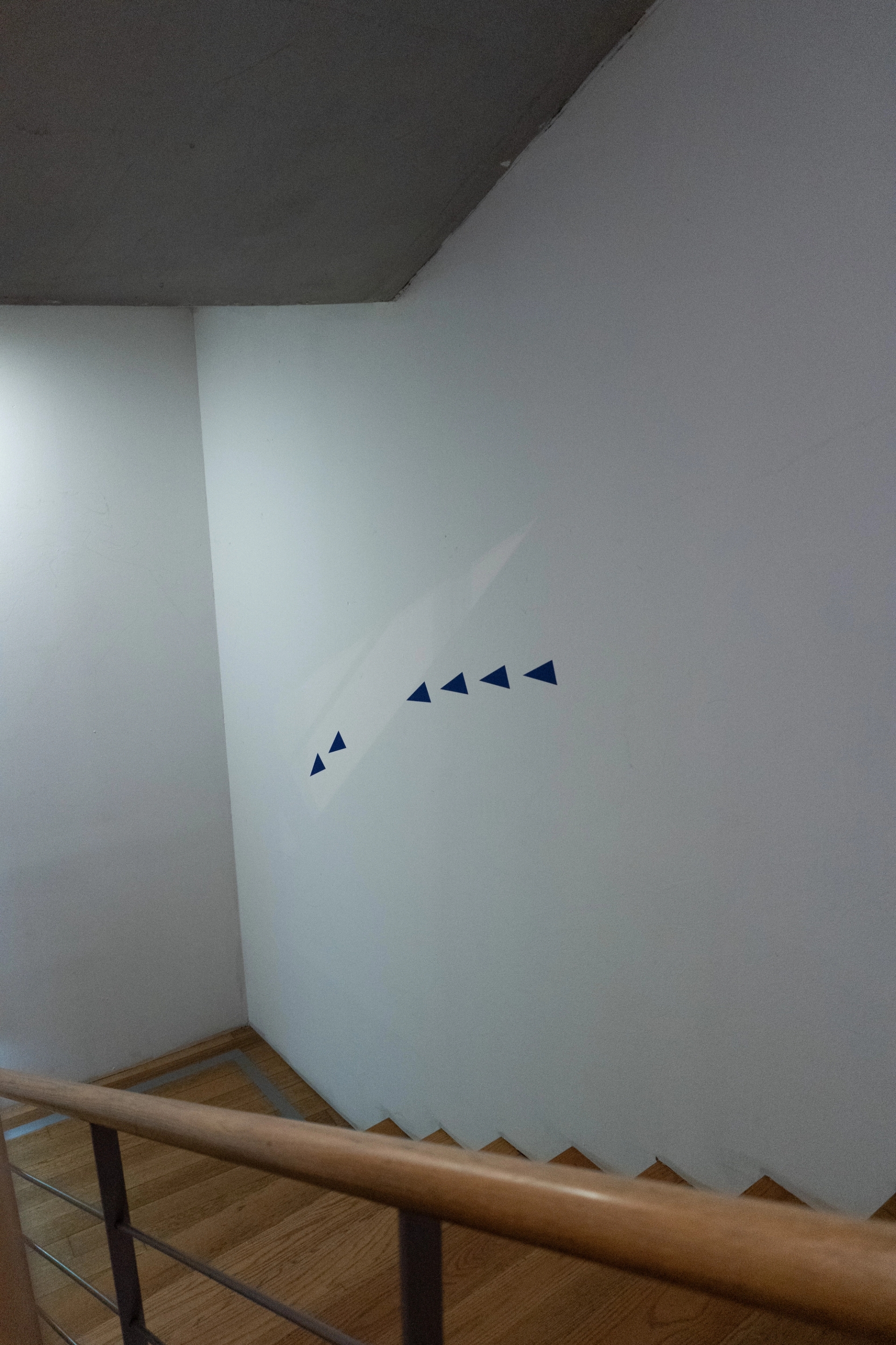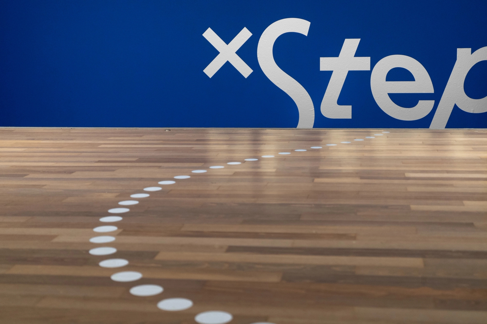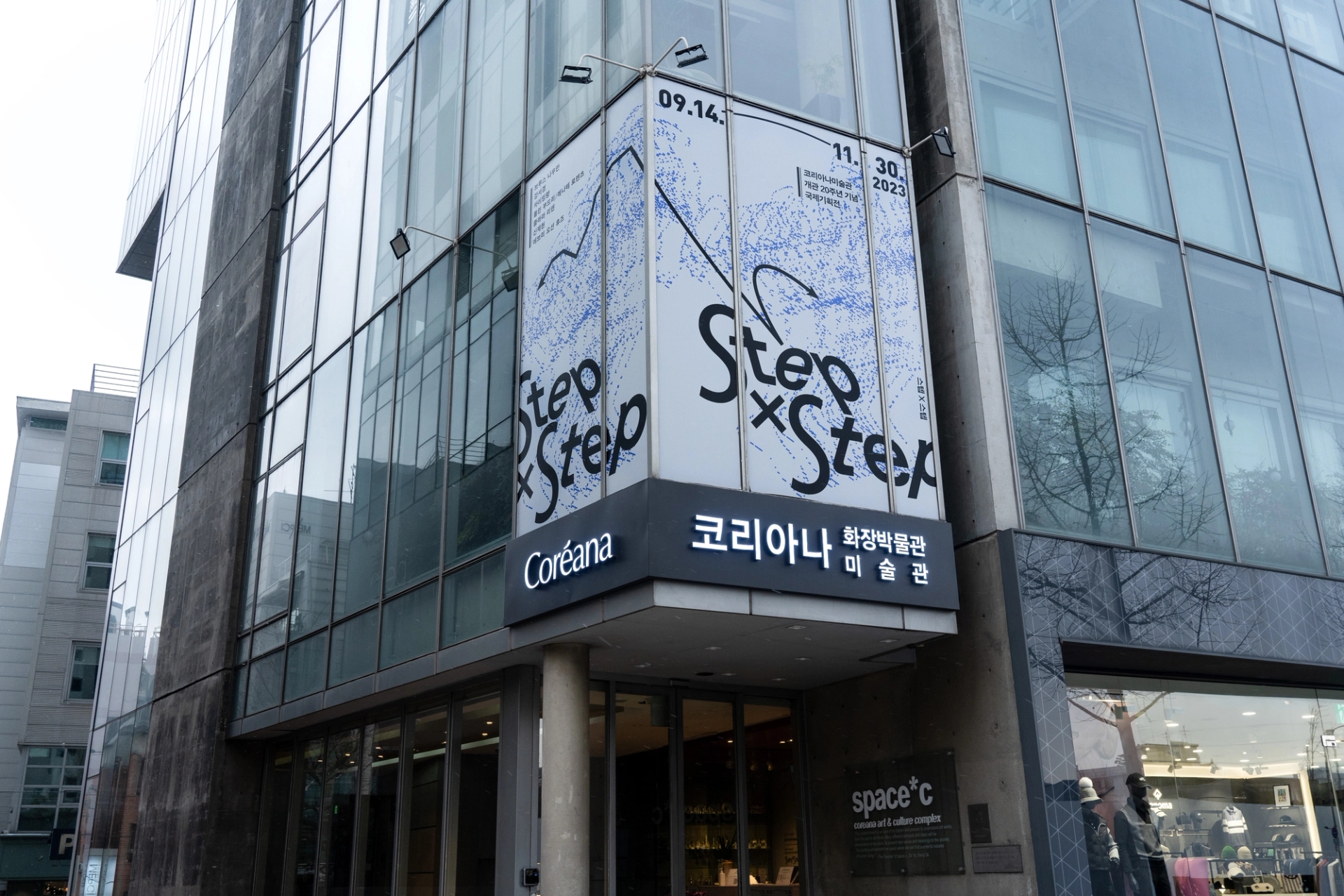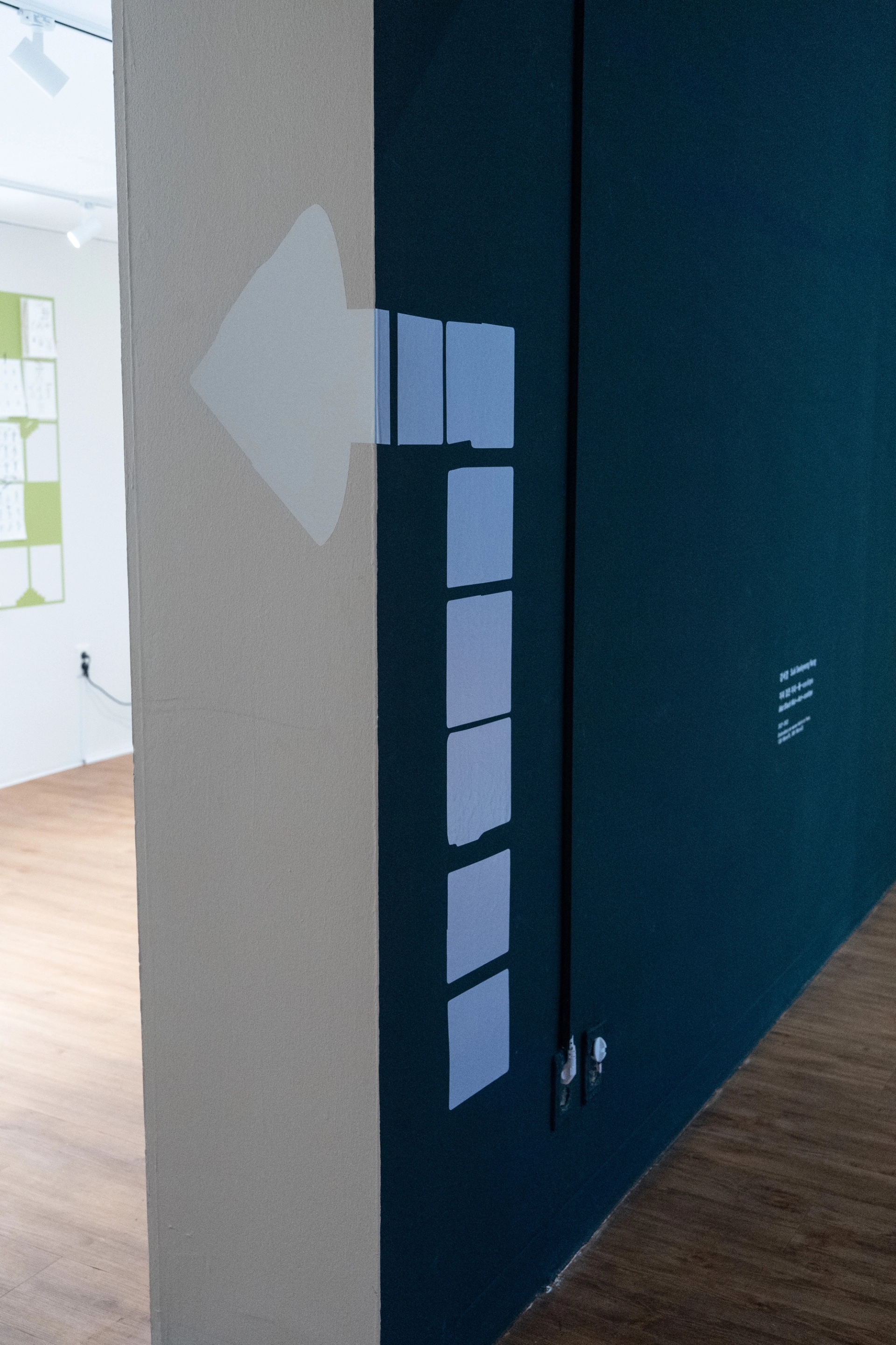 걸음은 ‘박(beat)’을 가진다. 일정한 수의 박이 모여 박자를 만들고, 연속적인 리듬을 만들어낸다. 걷기의 흔적이 발자국이라면, 음악의 발자국을 기록한 것은 악보라고 해석하여 포스터의 전체적인 형태를 악보의 형식에서 본따 제작했다. 전시 시작일과 종료일 사이에는 전시 기간 동안 참여작가 개개인의 걸음이 지속된다는 의미에서 악상기호 이음줄을 사용하고, 참여작가 크레딧과 악보의 마디 기호를 함께 표기하여 걷기와 음악을 연관 지어 표현했다. 포스터는 상하가 분리된 레이아웃처럼 보이게 제작하였으며 타이틀이 걸어가서 화면밖으로 사라지는 것을 상상할 수 있도록 글씨의 일부를 프레임 밖으로 넘치게 배치했다. 좌우로 번갈아가며 들쑥날쑥 기울여진 타이포그래피는 넘어지지 않기 위해 적절한 타이밍에 계속해서 반대 발을 디디는 ‘걷기’ 동작을 모티프로 하여 만들어졌다. 포스터를 포함하여 전시 그래픽 곳곳에서 보여지는 선형의 그래픽은 각각 2/4박자, 3/4박자, 6/8 박자 지휘법의 일부를 확대하여 디자인 요소로 사용한 것이다. 신체를 경유하는 음악적 행위를 연결짓는 본 전시와 선율의 움직임을 신체로서 표현하게 하는 지휘 기호를 연관지었다. 포스터의 가장 뒷편에는 걸음을 내딛거나 춤을 추고있는 사람의 모습을 반복적으로 촬영한듯한 그래픽이 배치되어 걷기의 행위에 내포된 의미를 확장시켰다. 이는 걷기를 일상적 행위에 제한두지 않고 안무적 몸짓으로 들여다볼 수 있도록 묘사한 것이다. 걸음을 내딛는 순간, 혹은 안무의 한 순간을 포착한듯한 이미지에서 ‘움직임’이라는 요소를 강조하여, 정지된 포스터임에도 움직이는듯한 인상을 받을 수 있도록 의도했다. 이는 디지털영상이 전환될 때의 글리치나 음악의 파동을 연상시키기도한다.