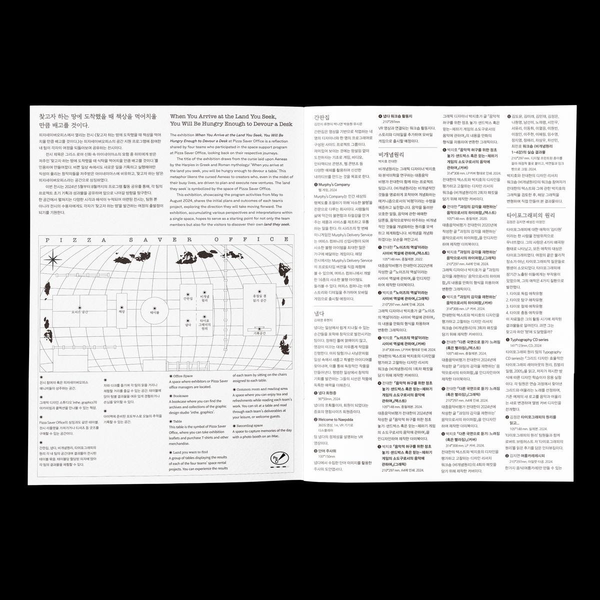 PSO 공간지원 프로그램의 결과보고 전시 《찾고자 하는 땅에 도착했을 때 책상을 먹어치울 만큼 배고플 것이다 》의 그래픽 디자인과 기획에 참여했습니다. 🍸🗺️ 전시 제목은 피자의 기원이라 알려져 있는 그리스 로마 신화 속 아이네이아스의 모험 중 하피에게 받은 저주인 ‘찾고자 하는 땅에 도착했을 때 식탁을 먹어치울 만큼 배고플 것이다.’를 인용하여 만들어졌습니다. 바쁜 일상 속에서도 새로운 일을 기획하고 실행해야만 직성이 풀리는 창작자들을 아이네이아스에 비유하고, ‘찾고자 하는 땅’은 피자세이버오피스라는 공간으로 상징하였습니다. 각 팀들이 책상 위 다채롭게 전시하게 될 결과물들을 “식탁 위 풍성하고 먹음직스러운 만찬”으로 비유하여, 찾고자 하는 땅에 도착한 관람객의 허기짐을 이끌어내고자 했습니다. 관람객을 찾고자 하는 땅(신대륙)에 도착 하고 싶은 욕구를 가진 탐험가에 빗대어서 포스터와 리플렛을 “모험가의 지도”처럼 연출하였으며, 지도의 방위 레이아웃을 사용하고 그것을 넘나드는 키비주얼로 “선을 넘는”, “영역을 확장하는” 공간지원 프로그램 팀들을 나타냈습니다. Exhibition planning. Pizza Saver Office( @pizza.saver.office), IN THE GRAPHICS Exhibitor. 간판집 @ganpan_jip (김민지, 류현지, 박나연, 박승원, 유시은) 냅다 @naepdda (김채영, 류현지) 비개념원리 (박지호 @parkjihoisme, 전대한 @reveur_daydreamer ) 타이포그래피의 원리(김정은 @kimjeongeun.kr , 김지연 @lcinnjanworks , 배성진 @seongjeenpai , 이정인 @junginnlee )