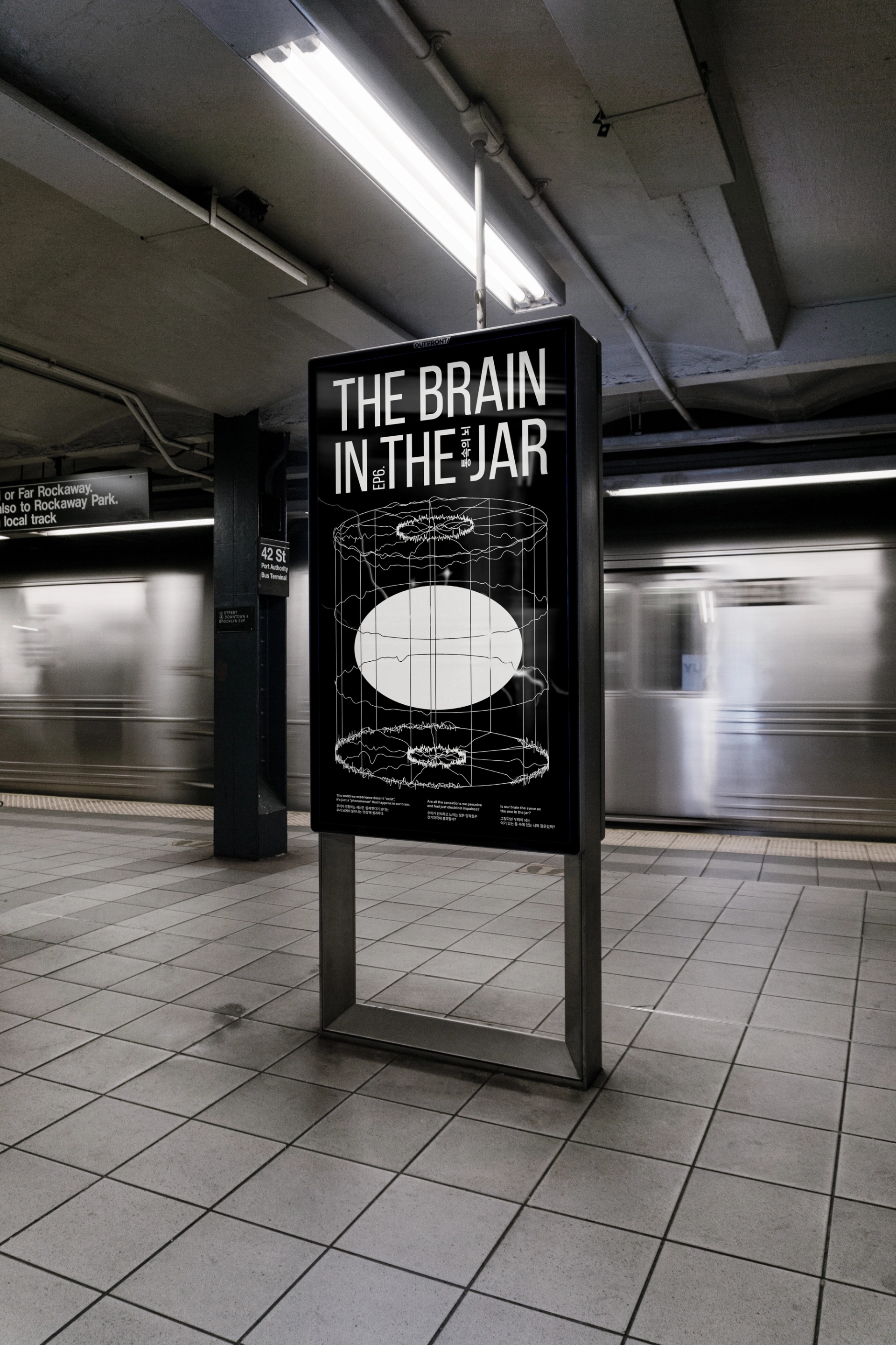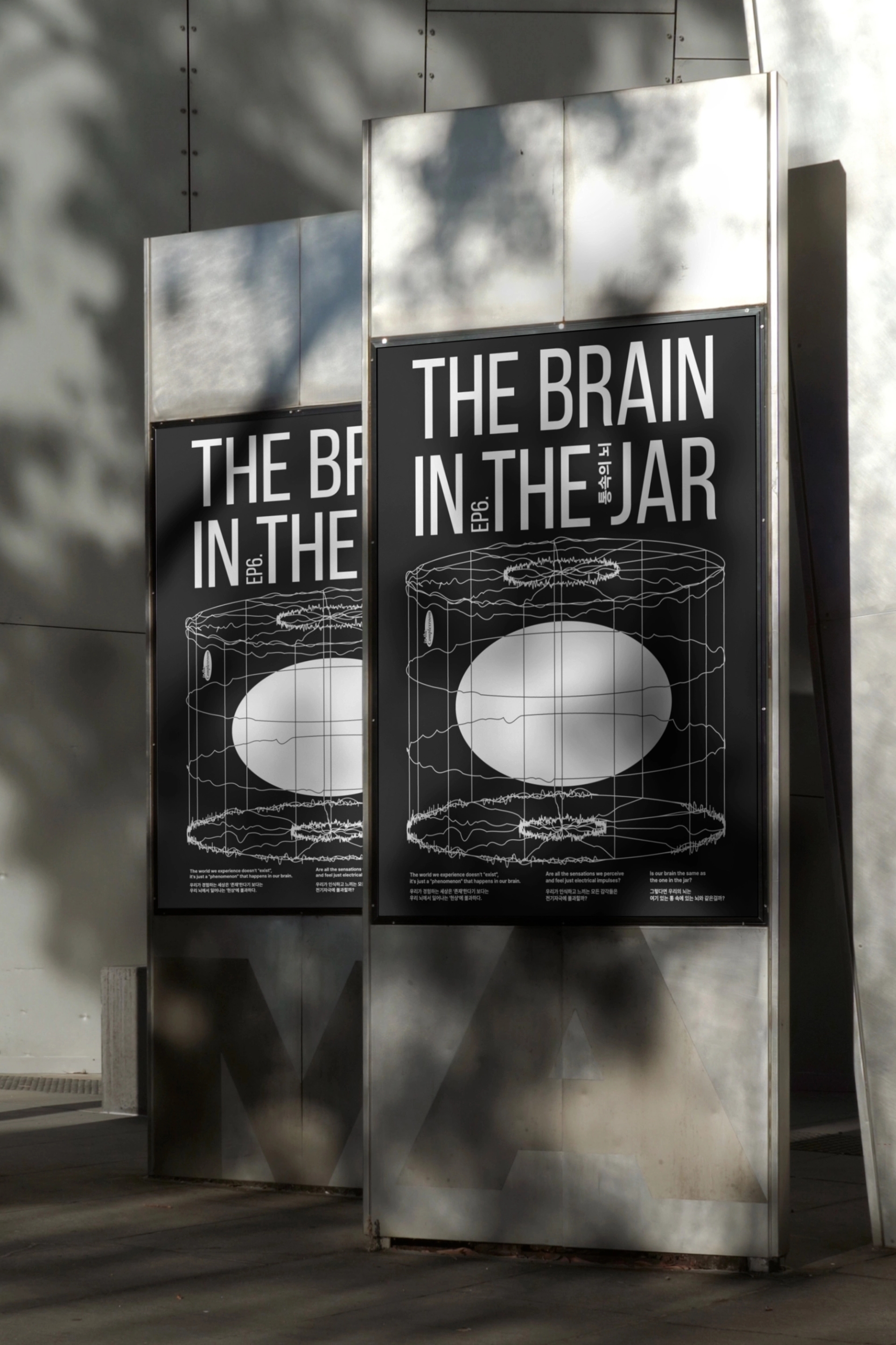 우리가 경험하는 외부세계는 자극을 통해 뇌로 전달되는 일종의 신호이다. 우리가 경험하는 세상은 '존재'한다기 보다는 우리 뇌에서 일어나는 '현상'에 불과하다. 우리가 인식하고 느끼는 모든 감각들은 전기자극에 불과할까 그렇다면 우리의 뇌는 여기 있는 통 속에 있는 뇌와 같은걸까? 회의론을 설명하는 주제에서 종종 등장하는 ‘통 속의 뇌’ 가설을 시각적으로 풀어내었다. 영상속 어둡고 축축한 분위기를 녹아내리는 통의 모습으로 표현하고, 전기자극을 받아 반응하는 뇌의 모습을 배경의 모션그래픽으로 표현하였다. ’통 속의 뇌‘ 생각실험의 회의론적인 시사점을 제시하는 것을 넘어, 이에 대한 컴플렉스룸 만의 해답을 녹여내었다. in the (complexroom) 프로젝트는 머릿속 생각들을 시각화하여 전시한다. 인더그래픽스는 본 프로젝트에 포스터디자인으로 참여하였으며, 썸네일과 동일한 사이즈의 포스터를 통해 YouTube에 포스터를 부착하는 듯한 효과를 내고자 하였다.Story, 3D Motion Design : @complexroomPoster Design: @inthe.graphics Sound : @bibim.sh VIDEO LINK